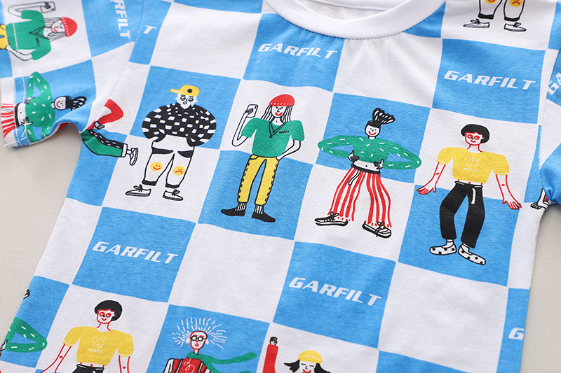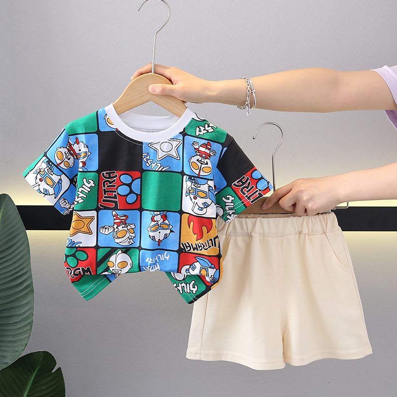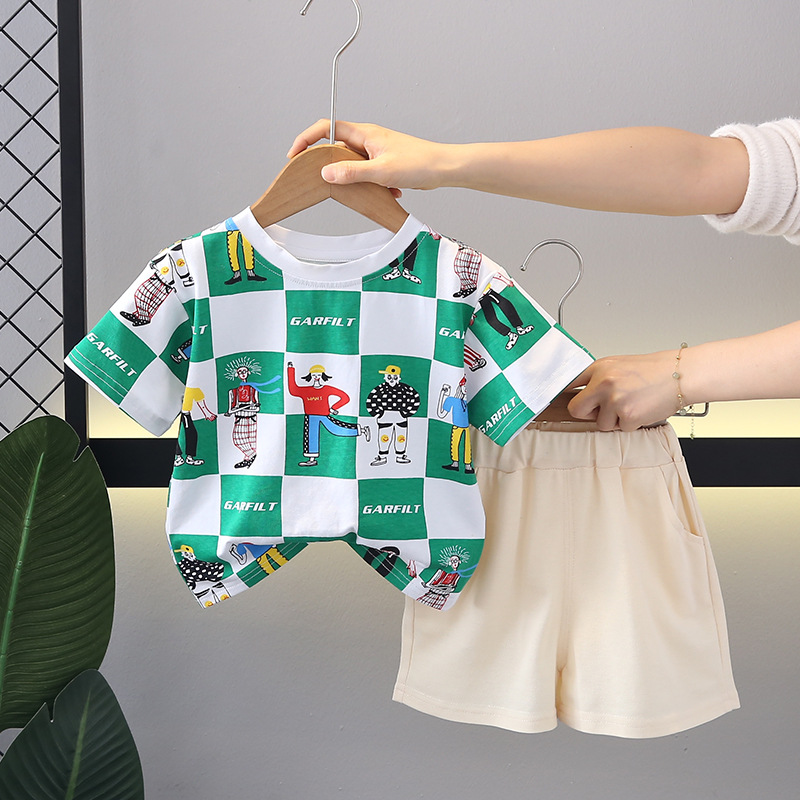 여름 2024 한국식 아동복 소년 여름 격자 무늬 반팔 투피스 여름복 외화 어린이 세트