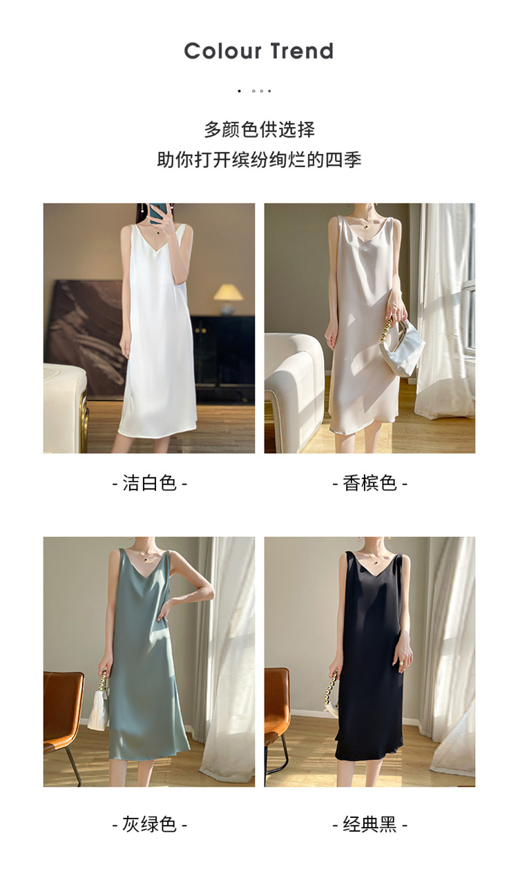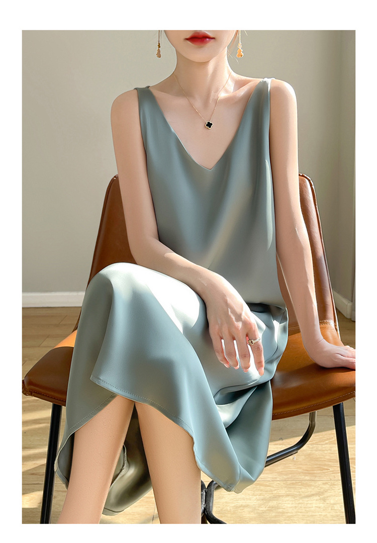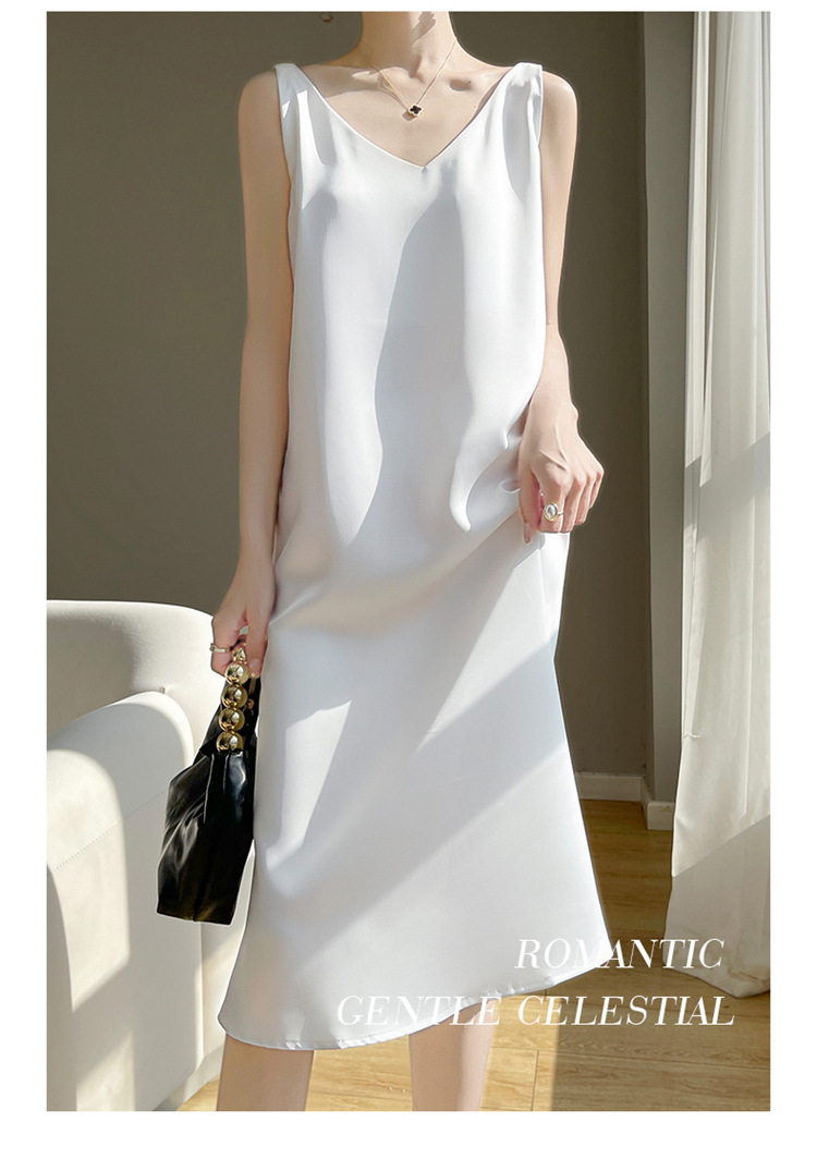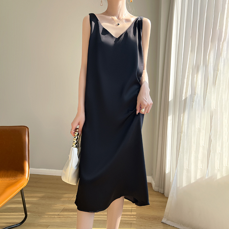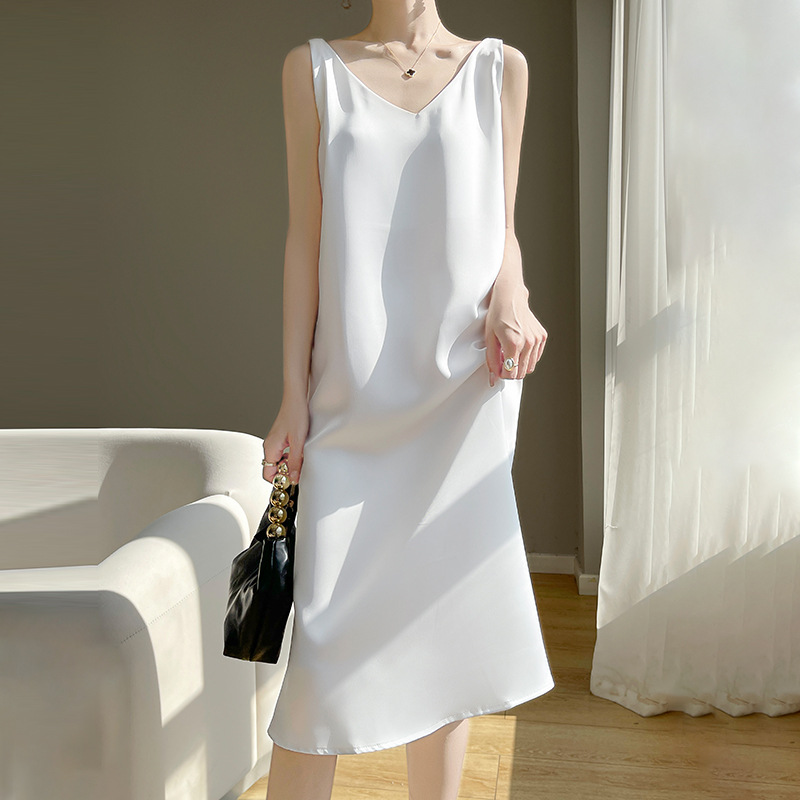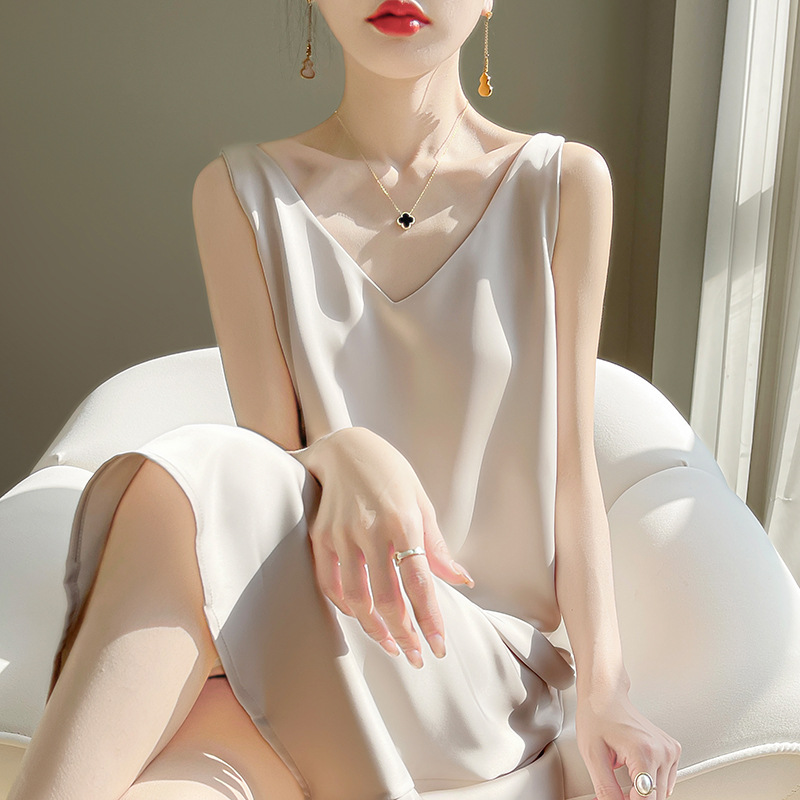 여름 새틴 실크 원피스 V-Neck 중간 길이의 무릎 위 슬림 등 더블 어깨 스트랩 아세테이트 슬립 원피스