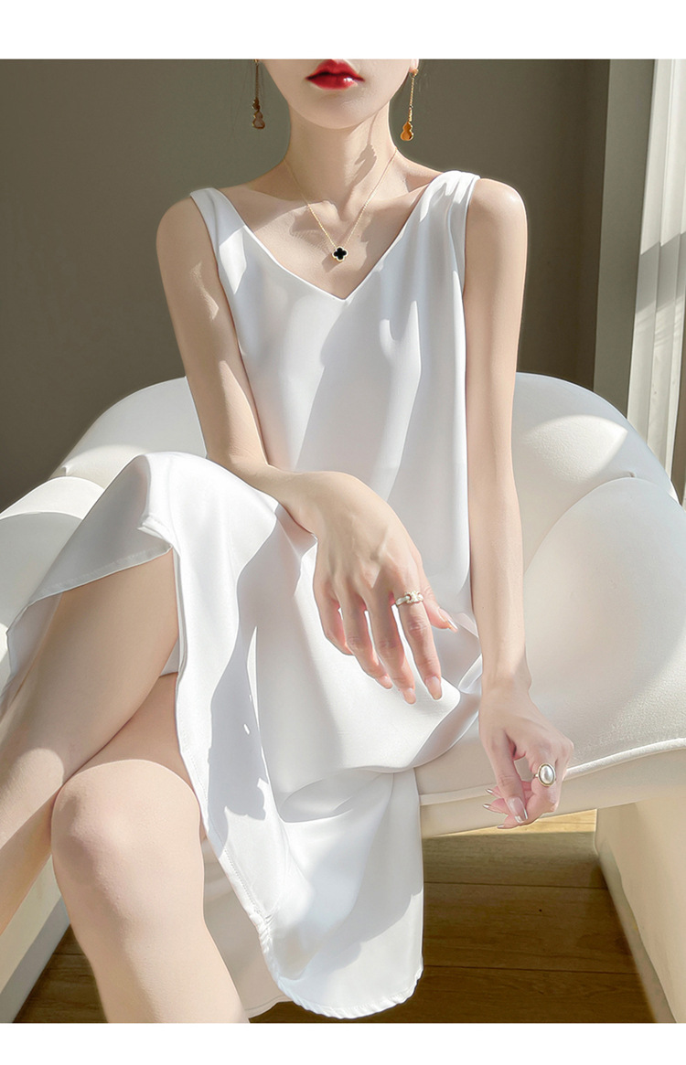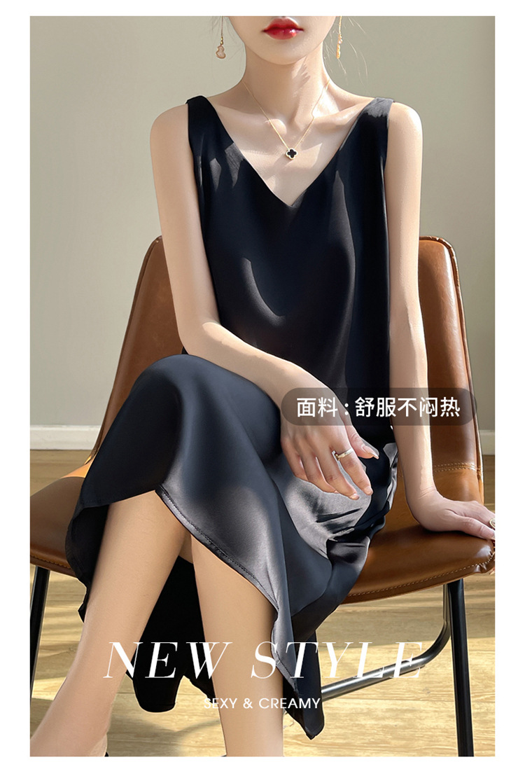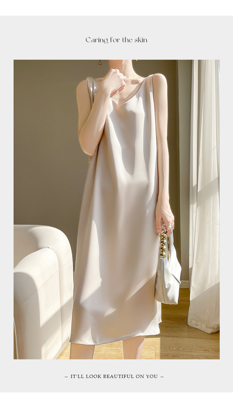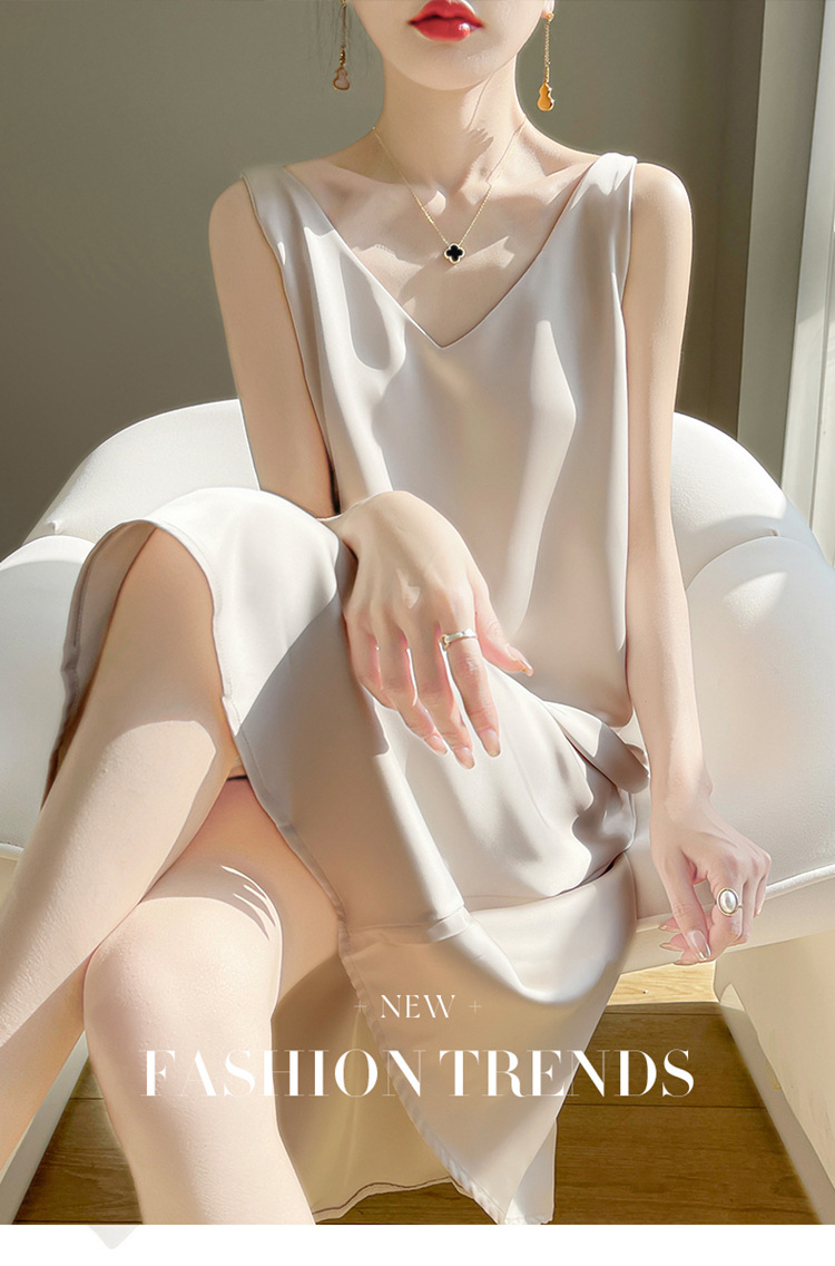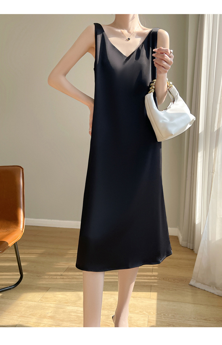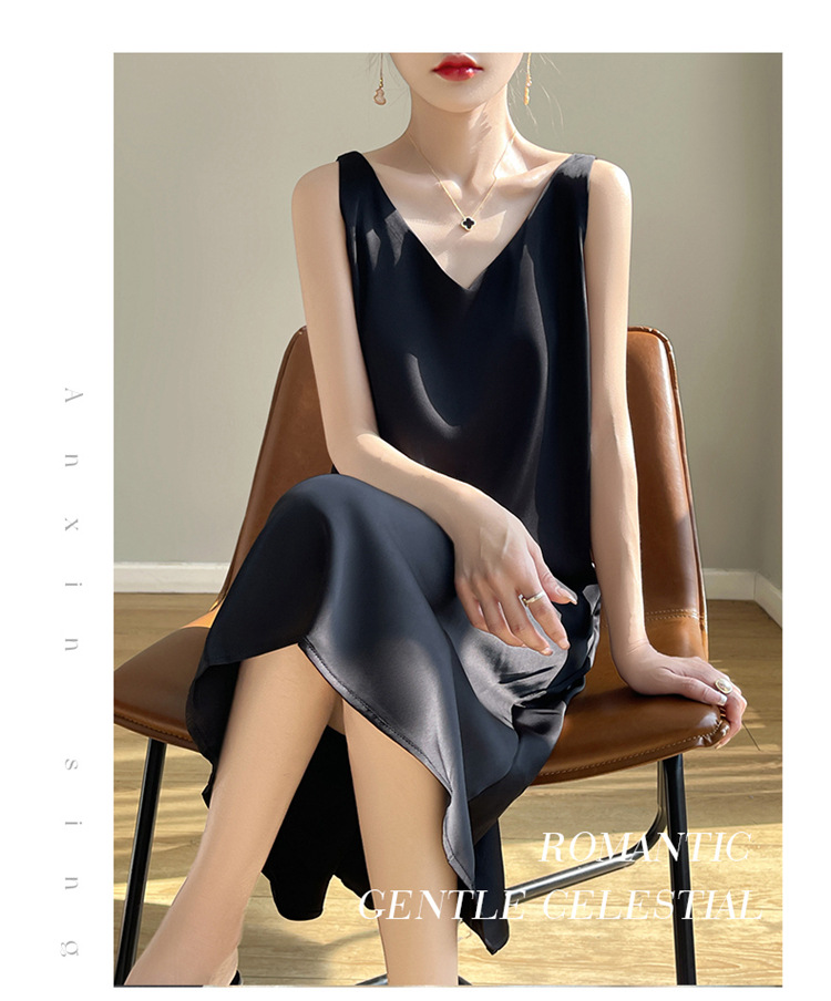 여름 새틴 실크 원피스 V-Neck 중간 길이의 무릎 위 슬림 등 더블 어깨 스트랩 아세테이트 슬립 원피스