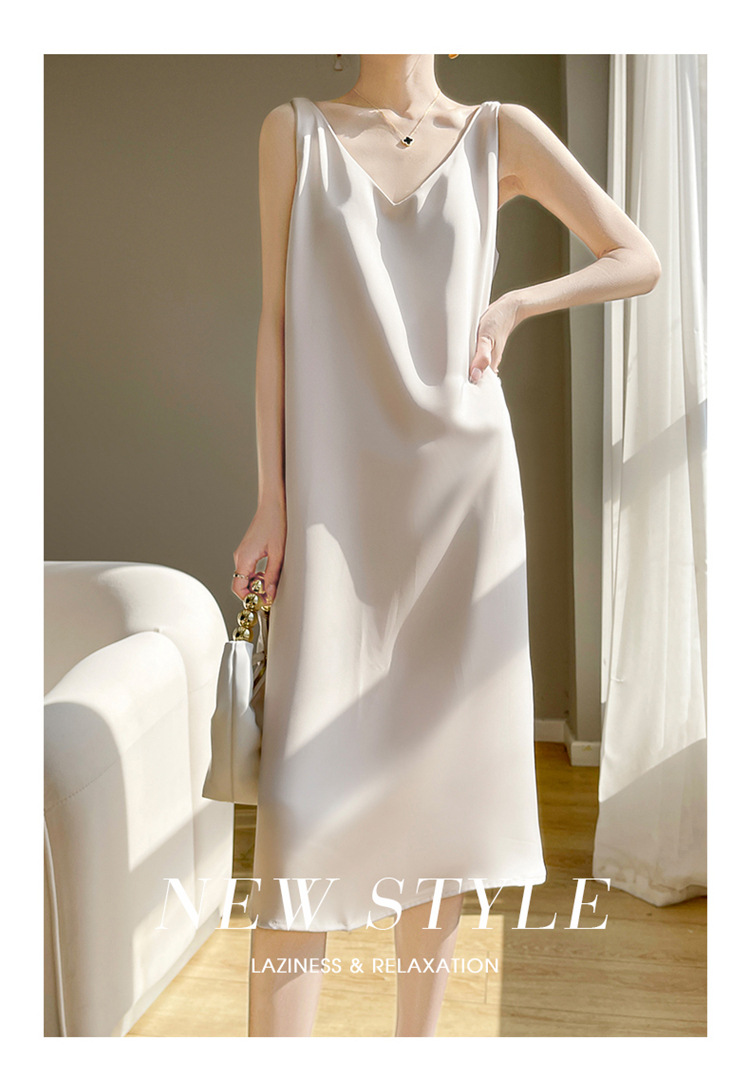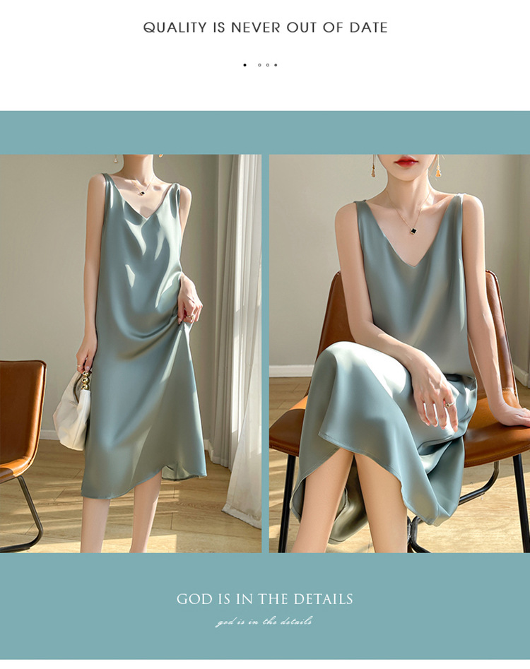여름 새틴 실크 원피스 V-Neck 중간 길이의 무릎 위 슬림 등 더블 어깨 스트랩 아세테이트 슬립 원피스스토어 가기