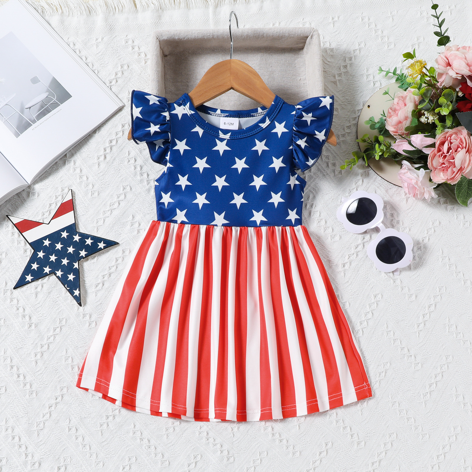 아마존 새로운 독립 기념일 어린이 별 줄무늬 인쇄 비행 민소매 소녀의 여름 원피스