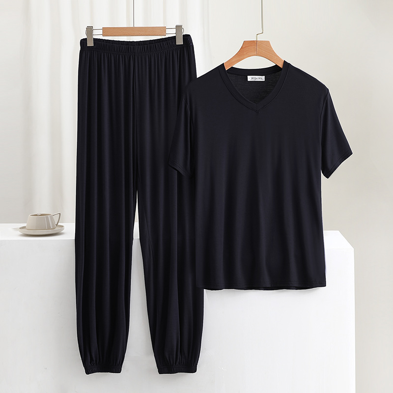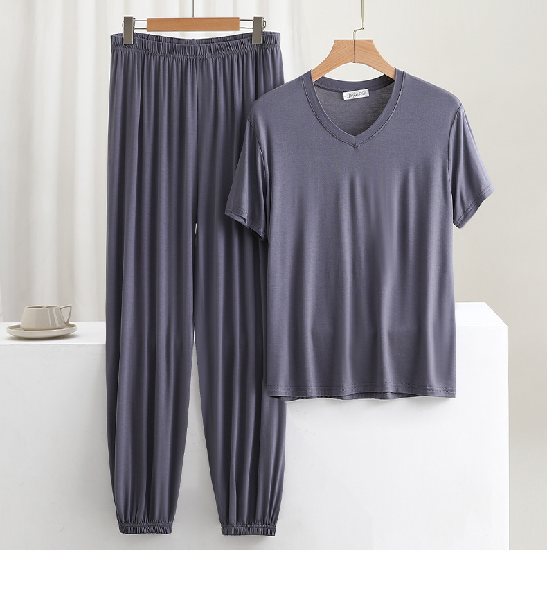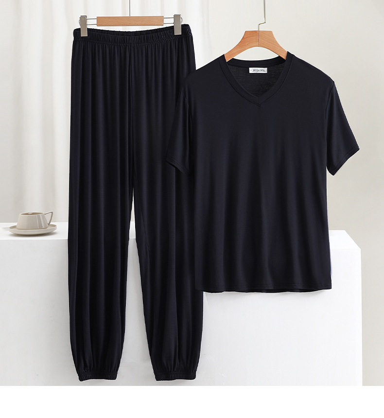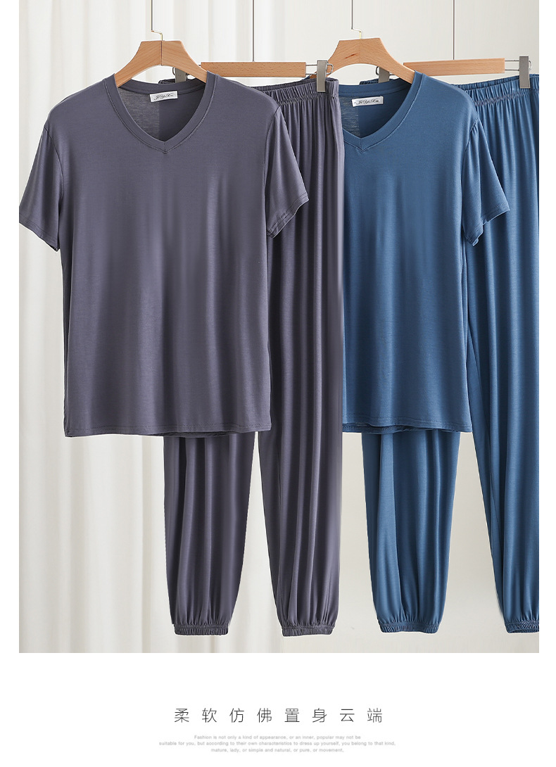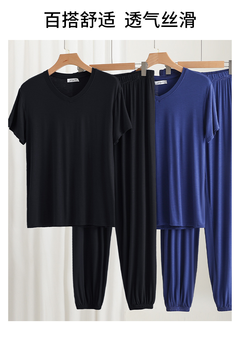 男士简约纯色v领短袖T恤夏薄款莫代尔休闲运动家居服套装睡衣睡裤