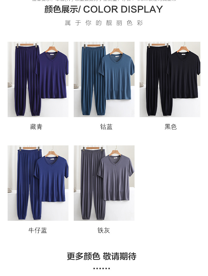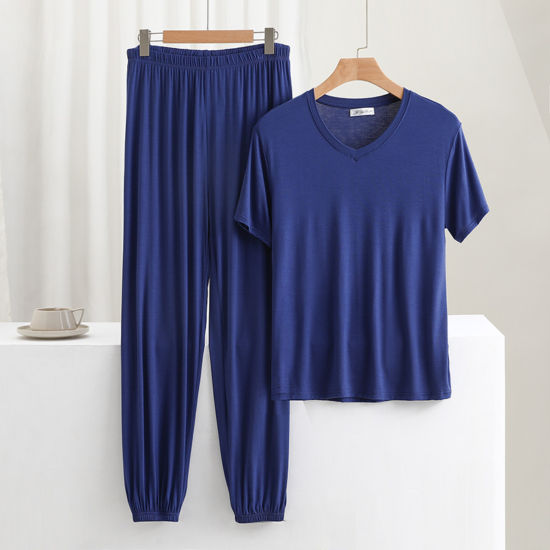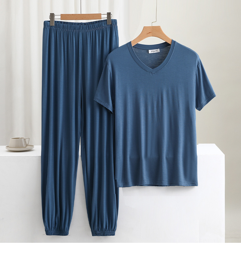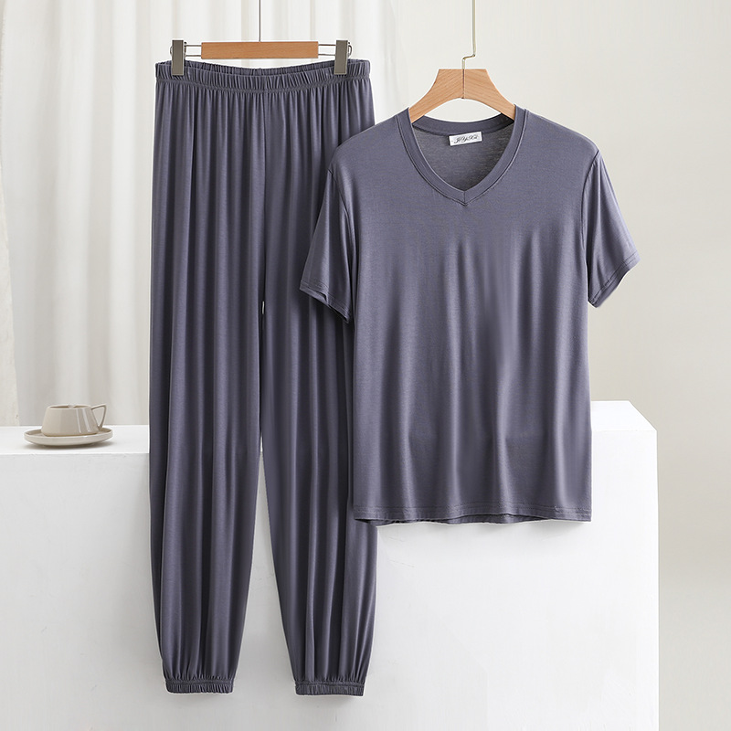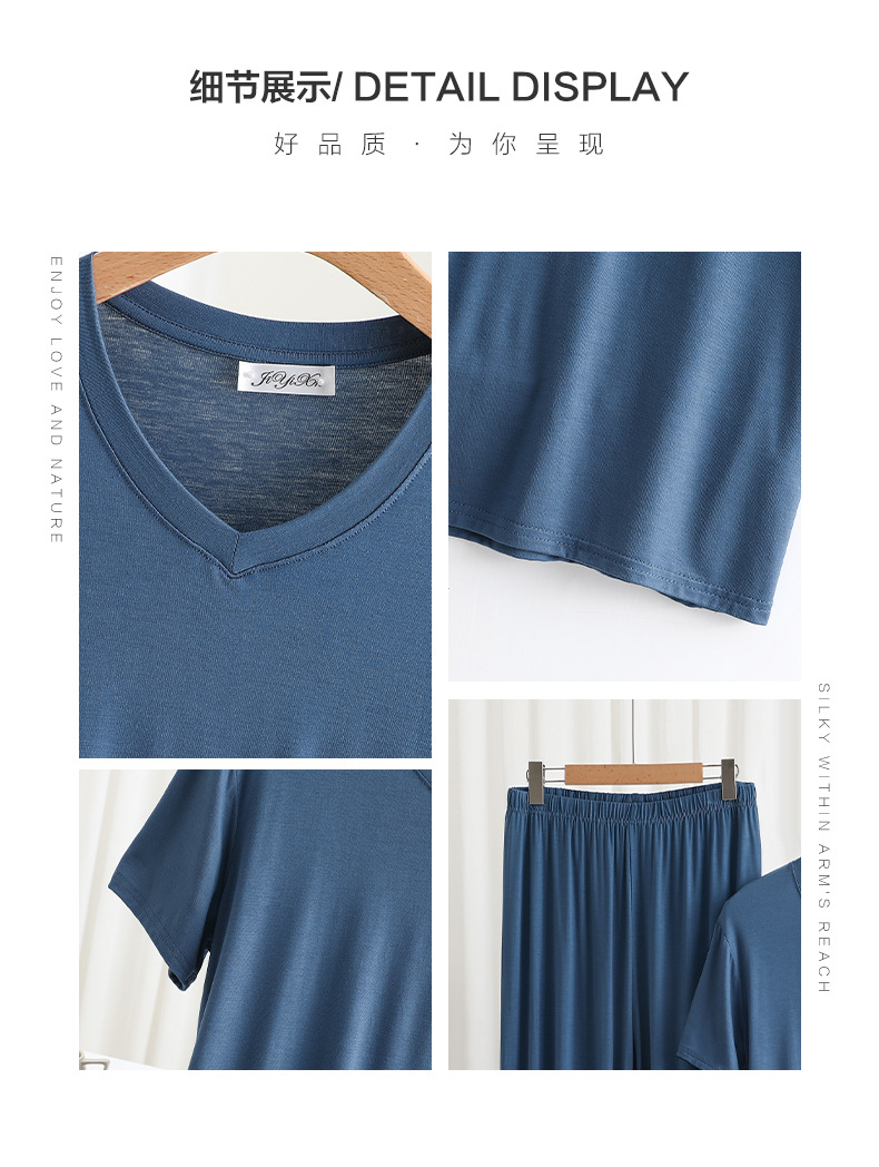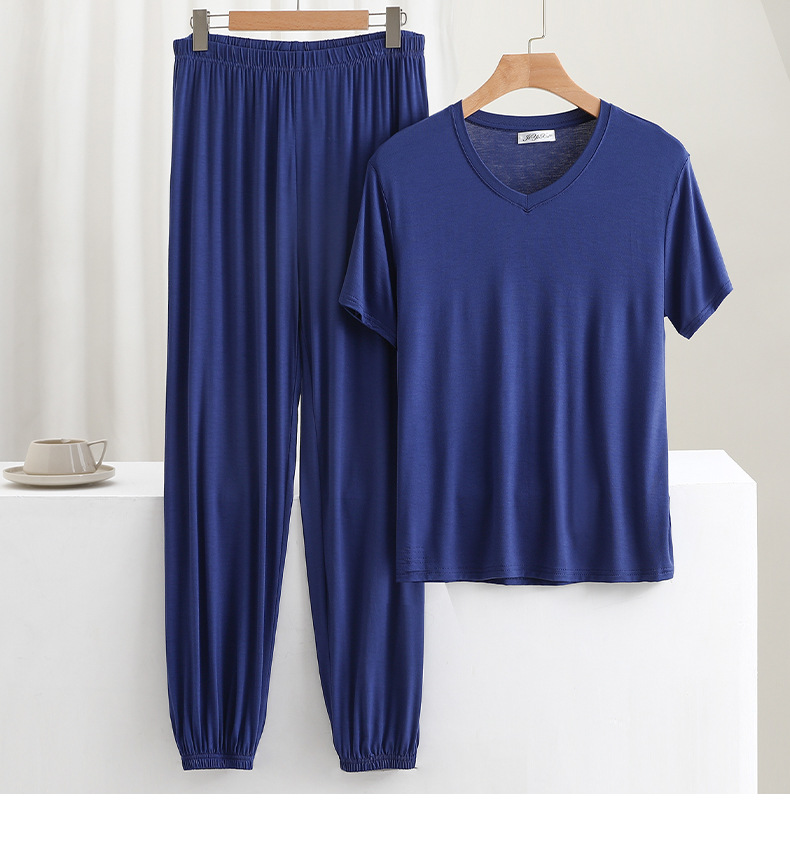 男士简约纯色v领短袖T恤夏薄款莫代尔休闲运动家居服套装睡衣睡裤