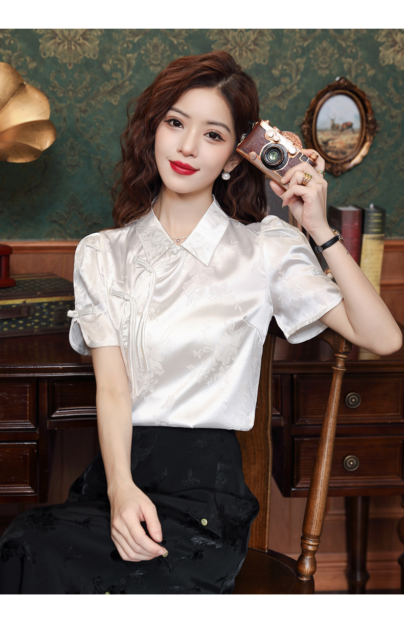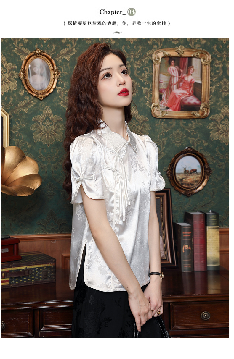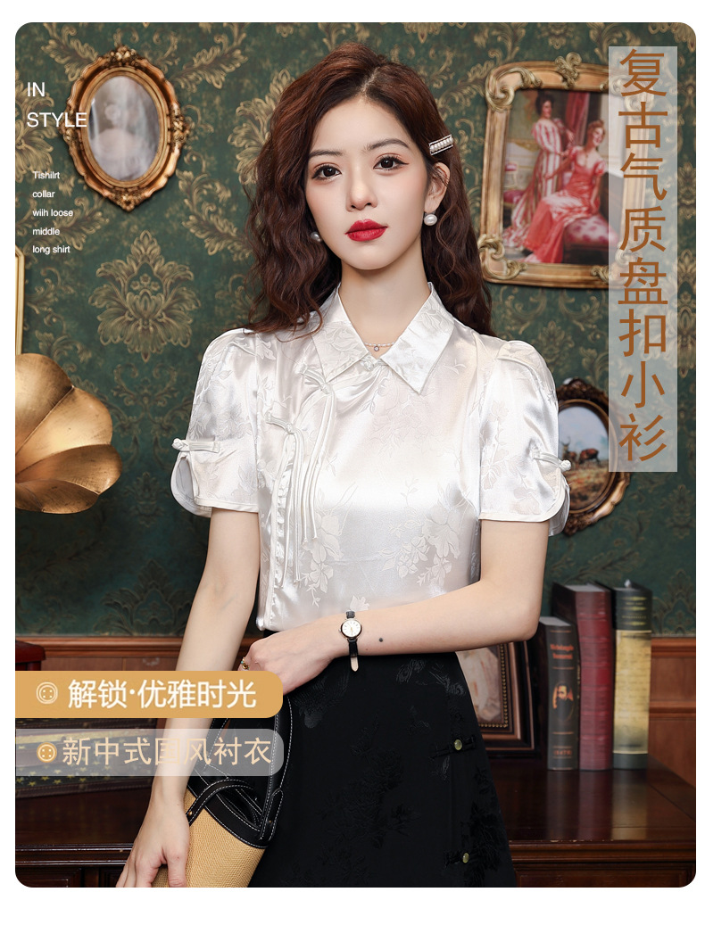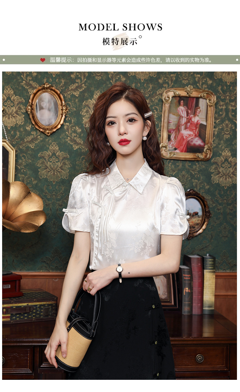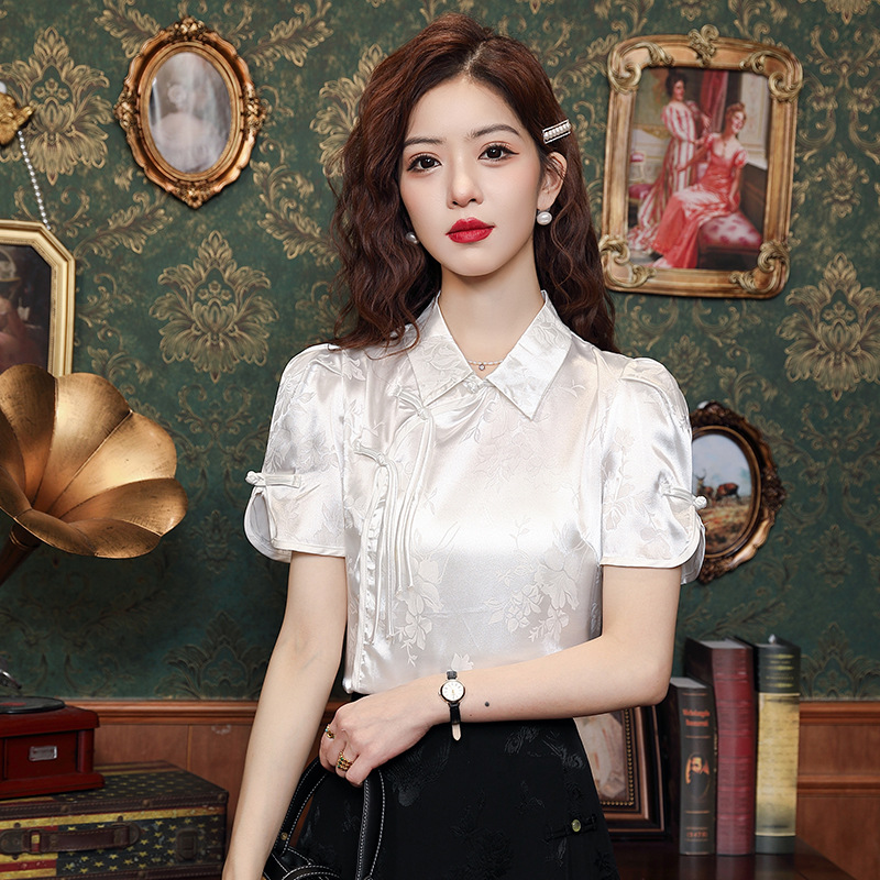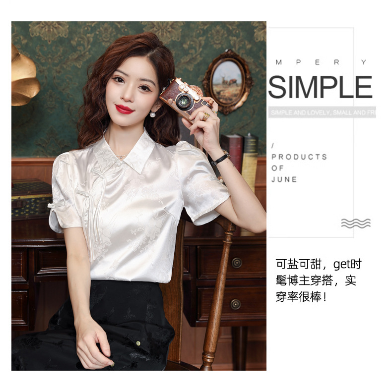 국경 간 상품 소스 2024 여름 새로운 중국 스타일 개선 된 인형 칼라 반팔 슬림 핏 슬리밍 쉬폰 셔츠 블라우스스토어 가기