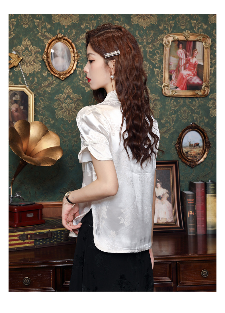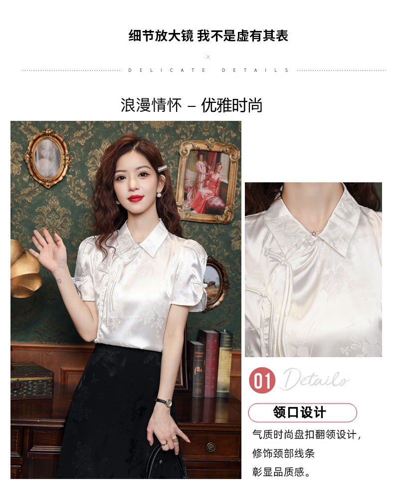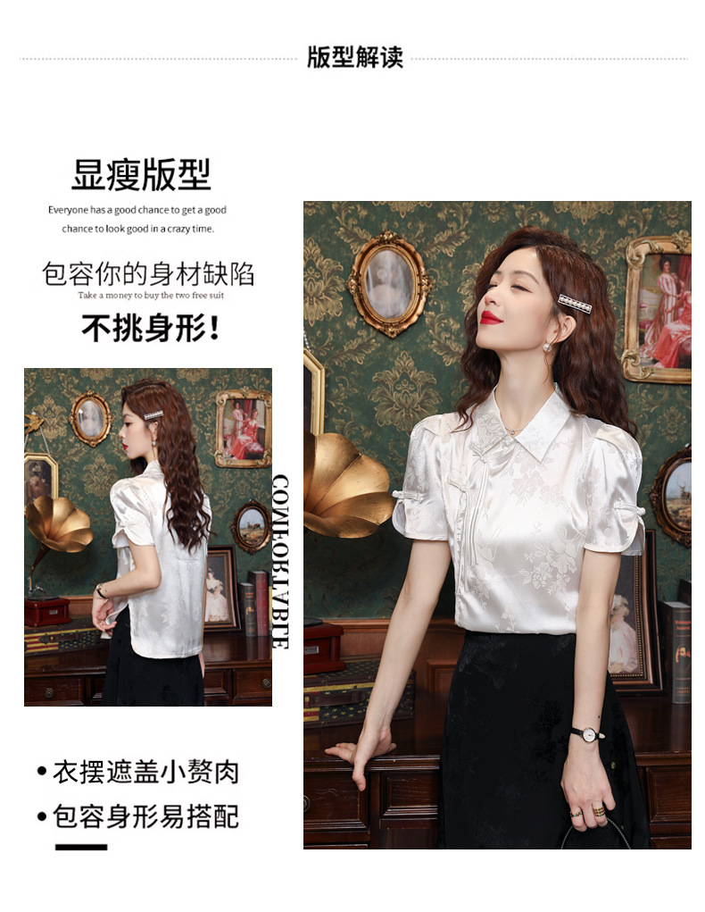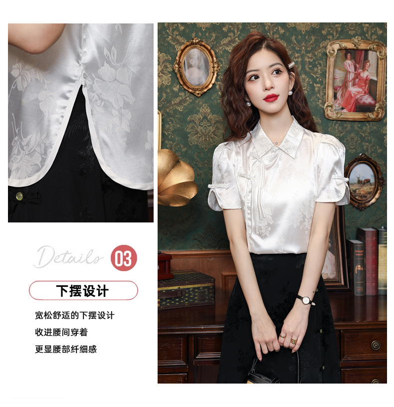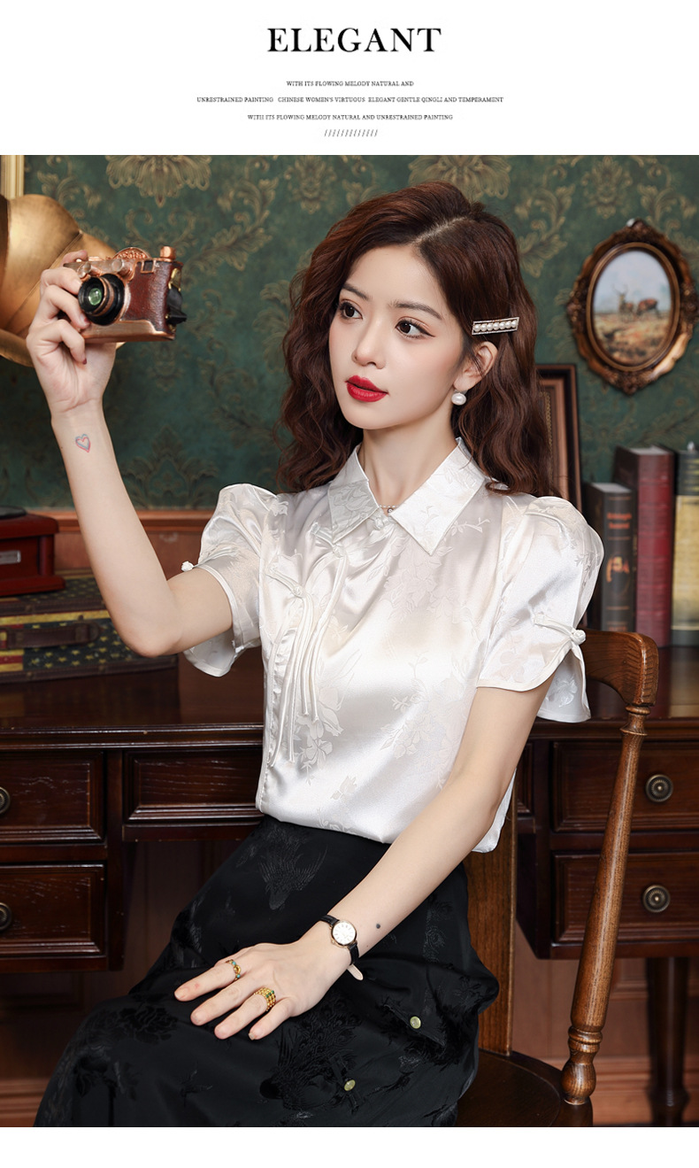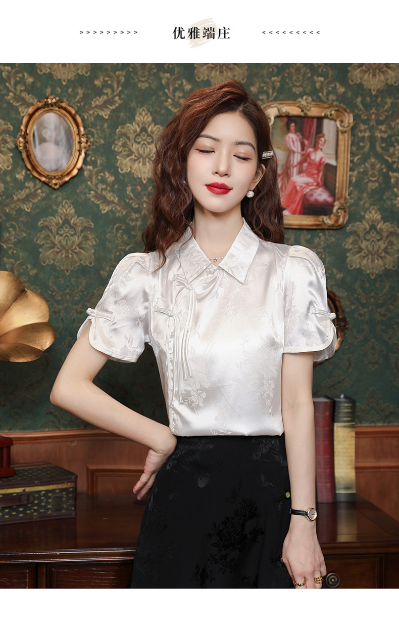 국경 간 상품 소스 2024 여름 새로운 중국 스타일 개선 된 인형 칼라 반팔 슬림 핏 슬리밍 쉬폰 셔츠 블라우스스토어 가기