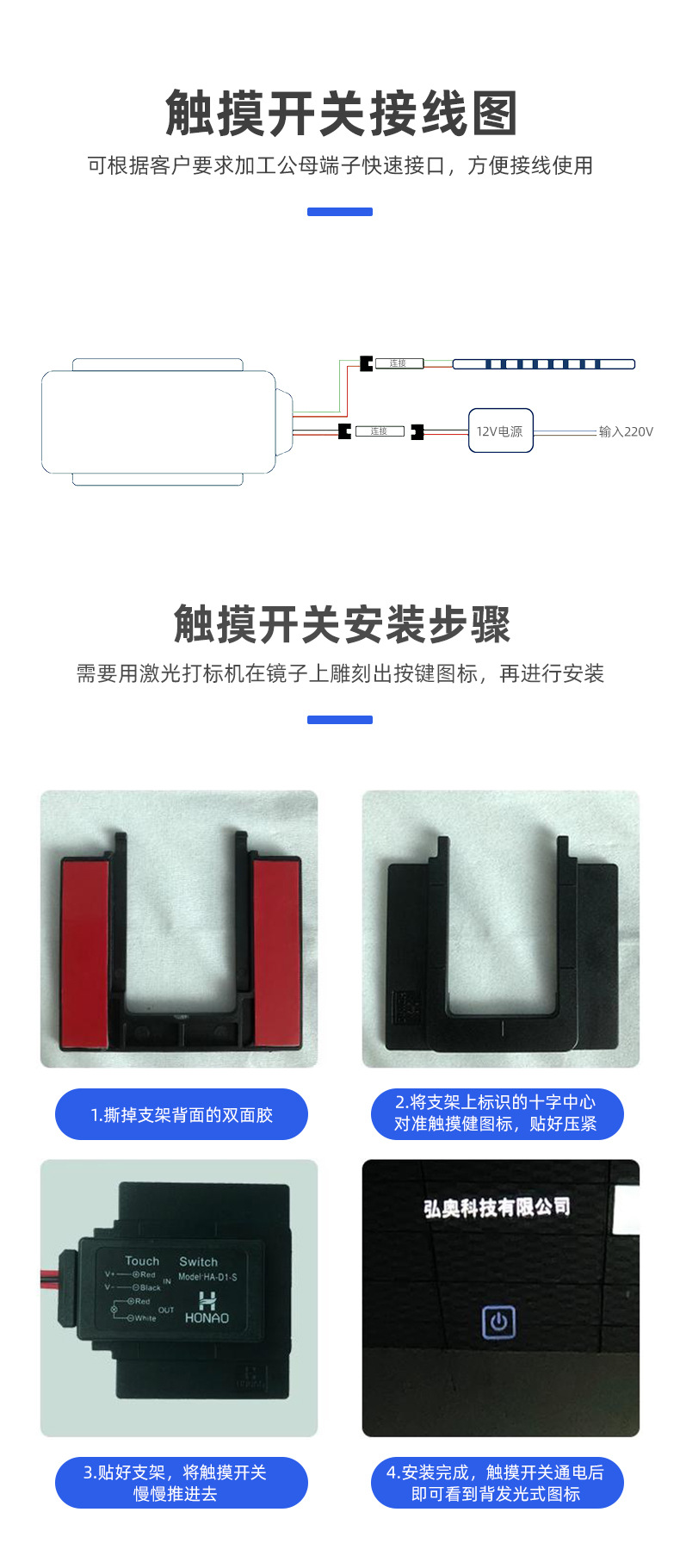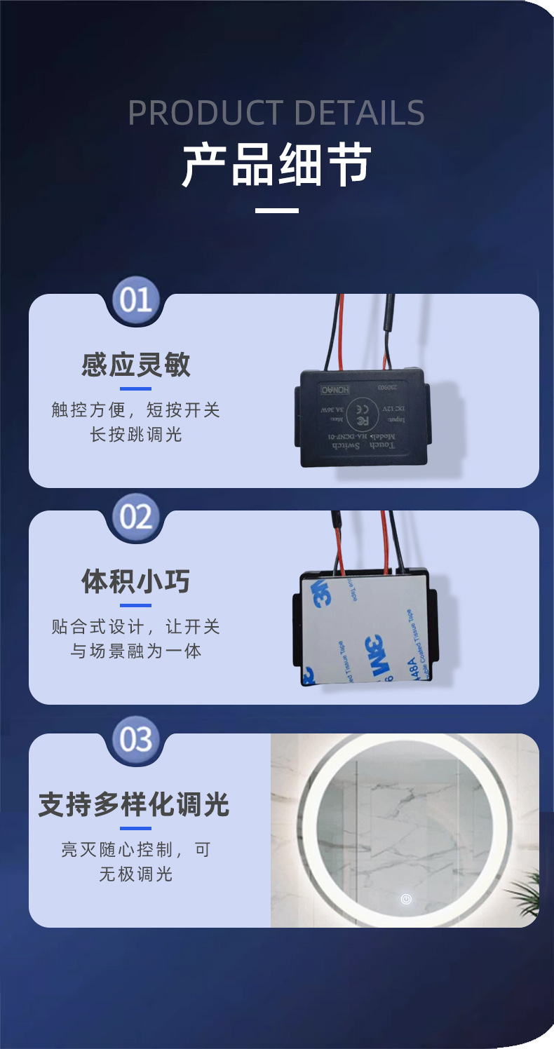 스마트 미러 터치 스위치가있는 LED 미러 전면 조명 욕실 거울 터치 6V-24V 유도 모듈 유도 스위치