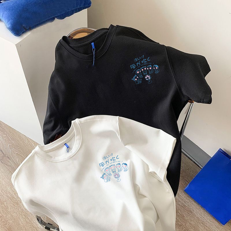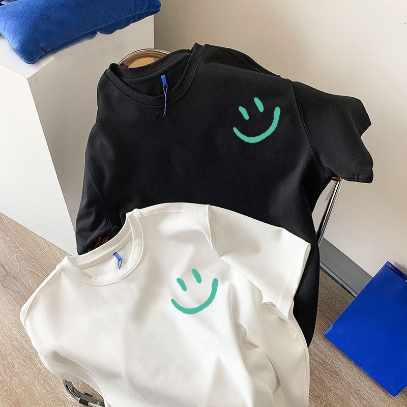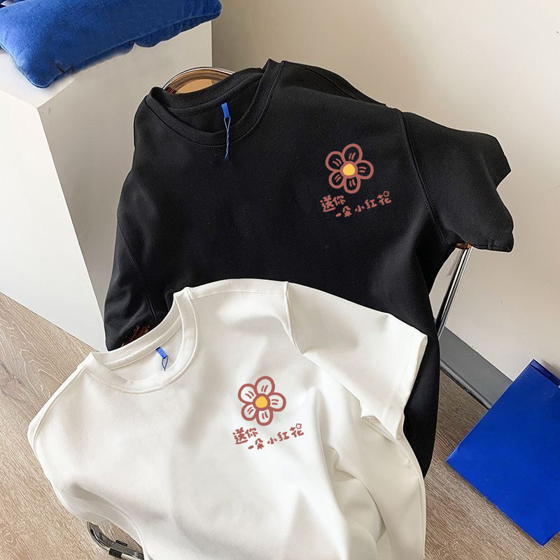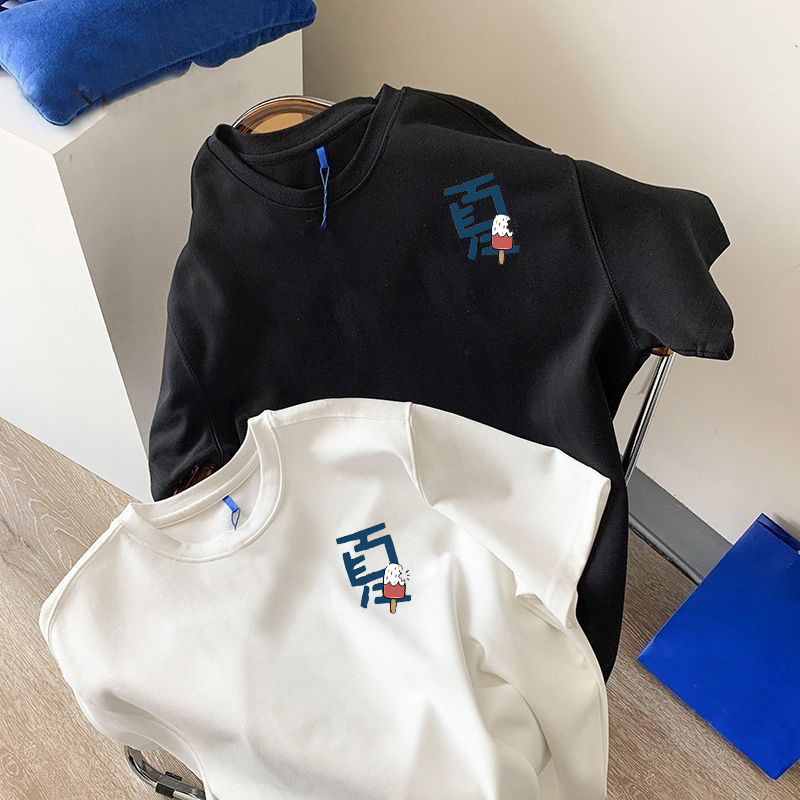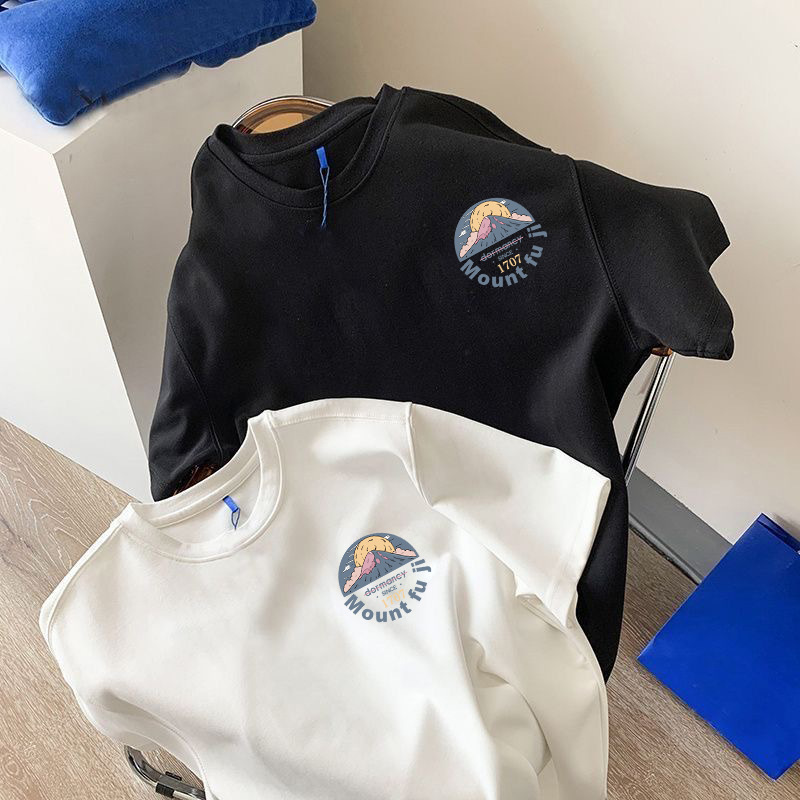 흑백 순면 티셔츠 여성용 2024 년 새 여름 느슨한 어깨 인쇄 반 소매 티셔츠 내부 탑