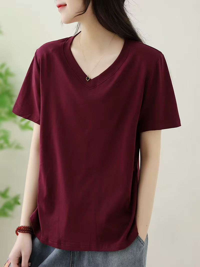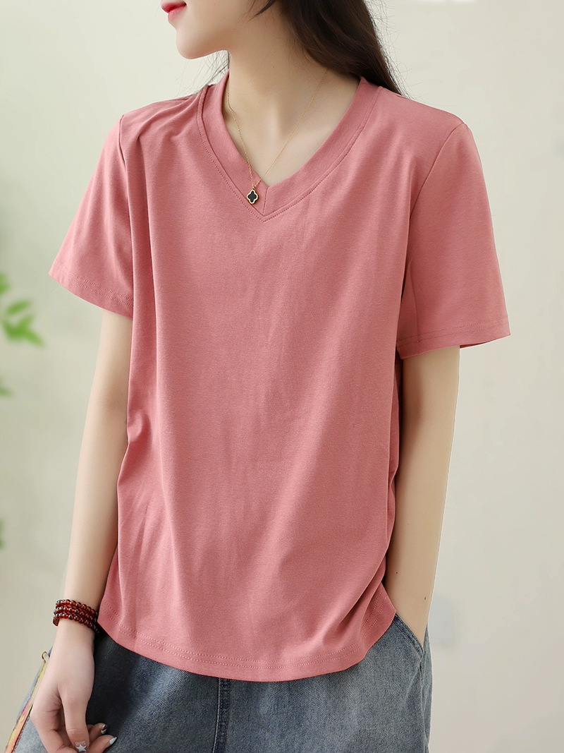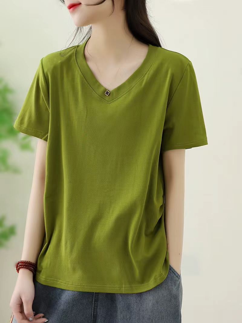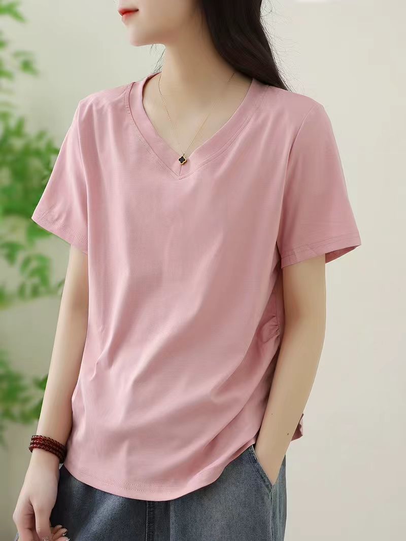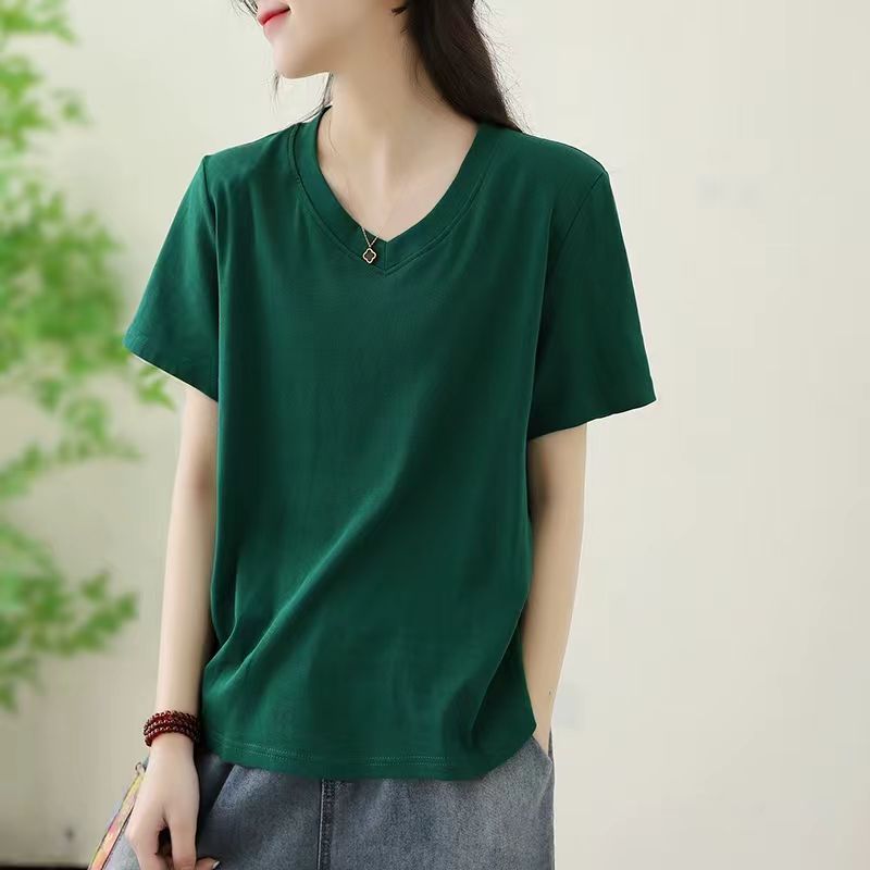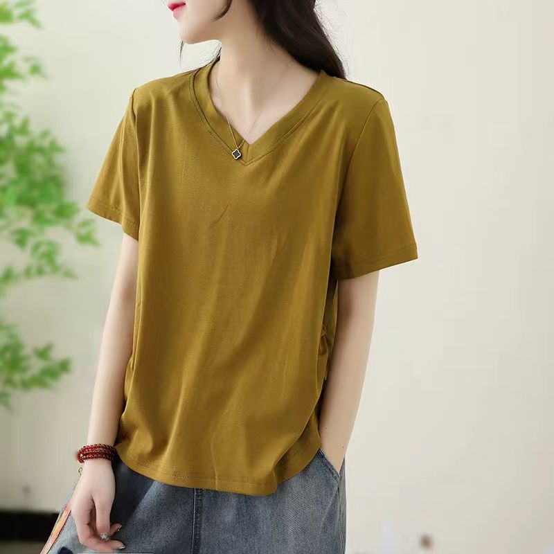 여름 V-넥 솔리드 컬러 코튼 탑 올 매치 루즈 핀치, 코튼 얇은 티셔츠 중국 전나무 여성용 반팔 캐주얼