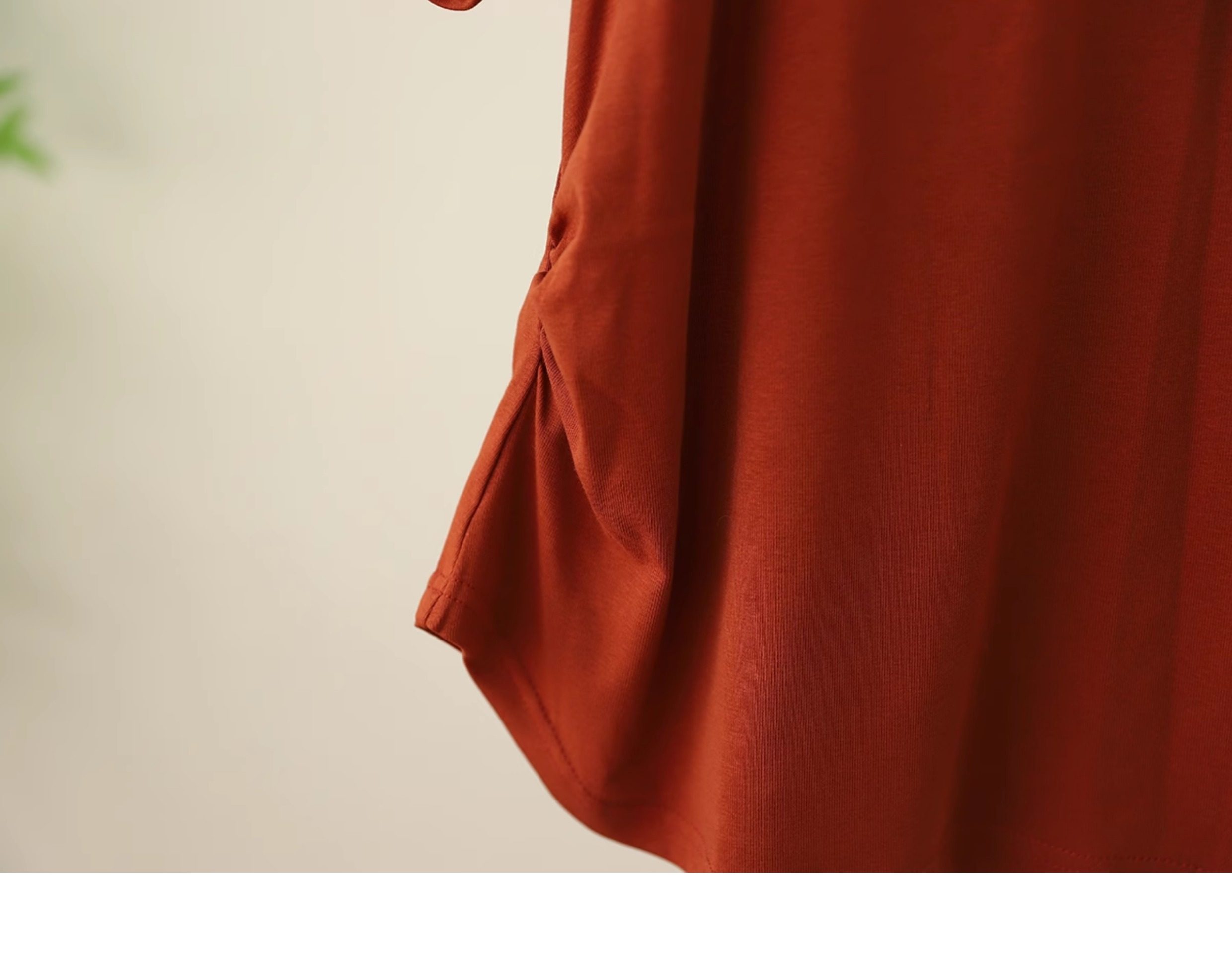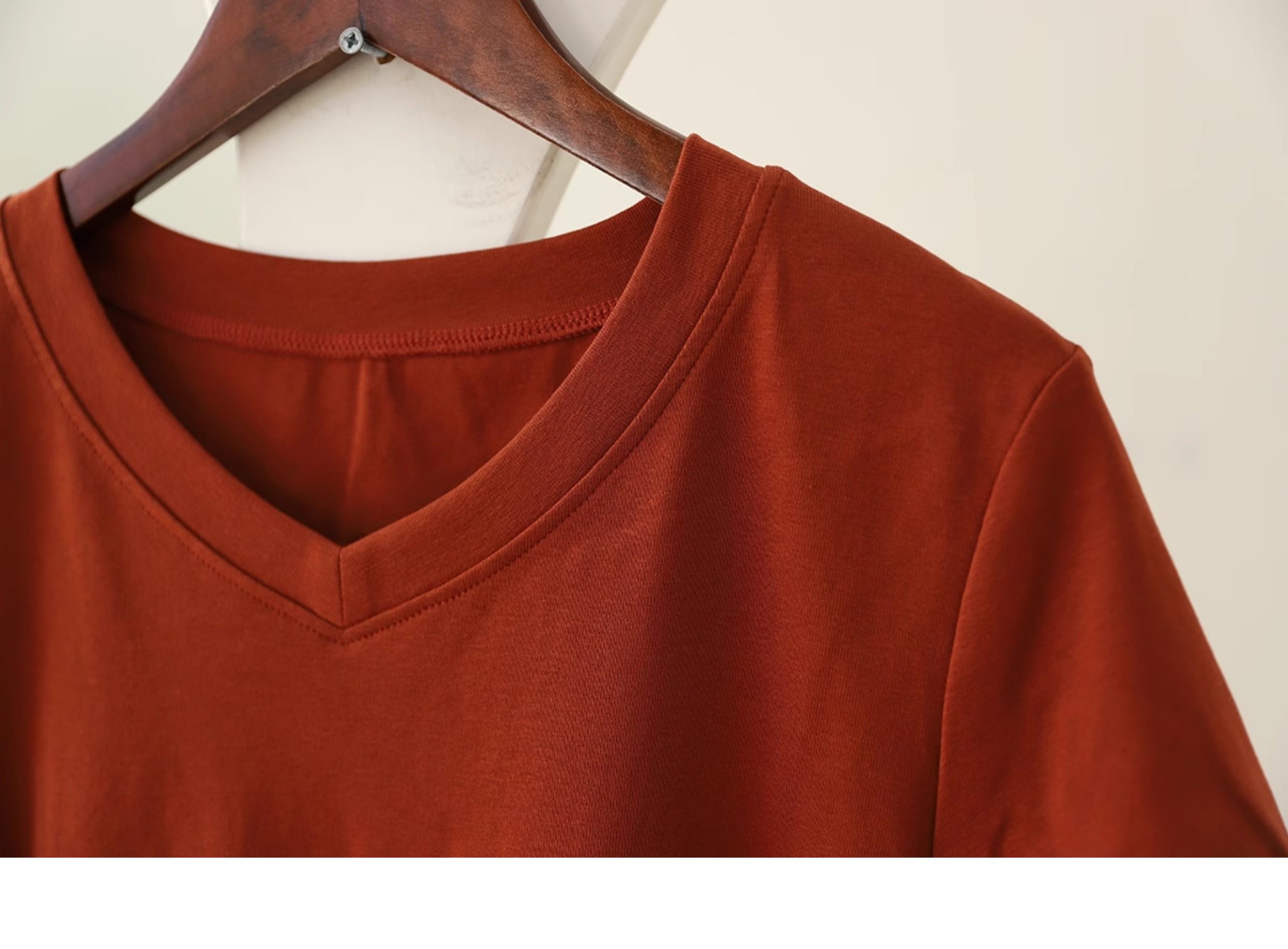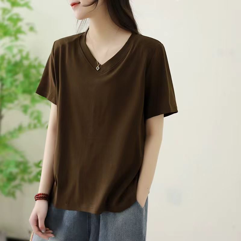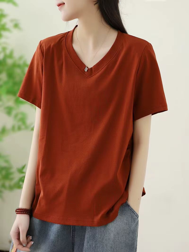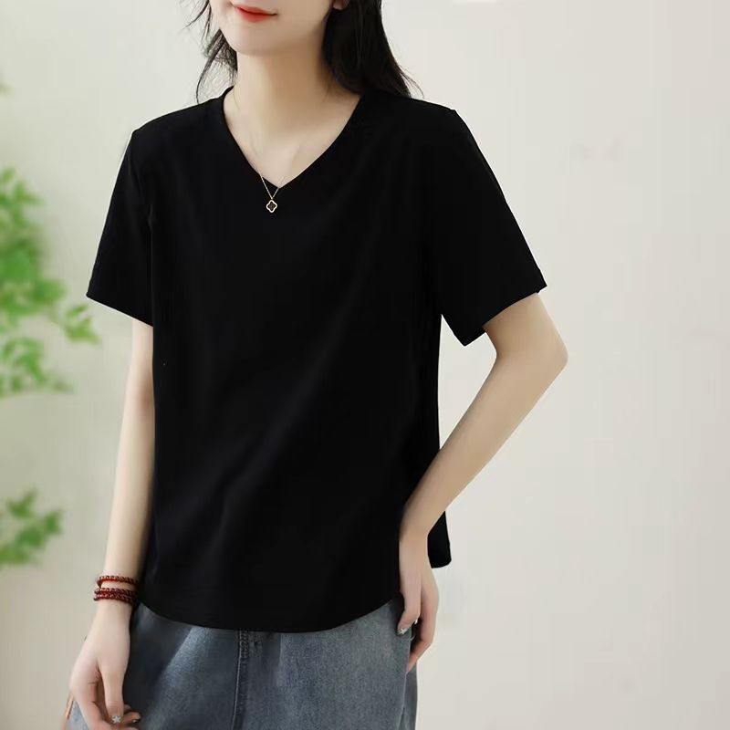 여름 V-넥 솔리드 컬러 코튼 탑 올 매치 루즈 핀치, 코튼 얇은 티셔츠 중국 전나무 여성용 반팔 캐주얼