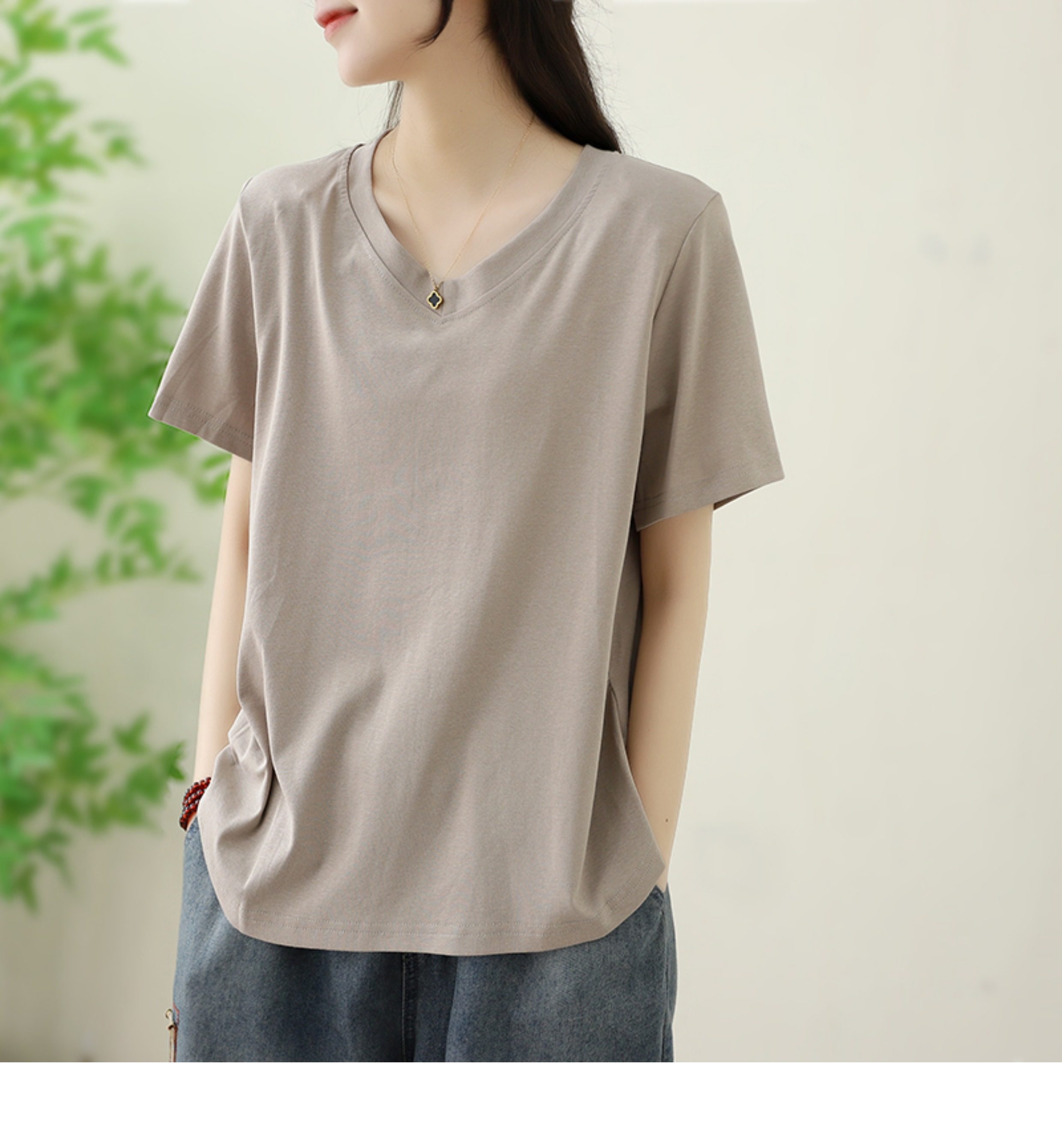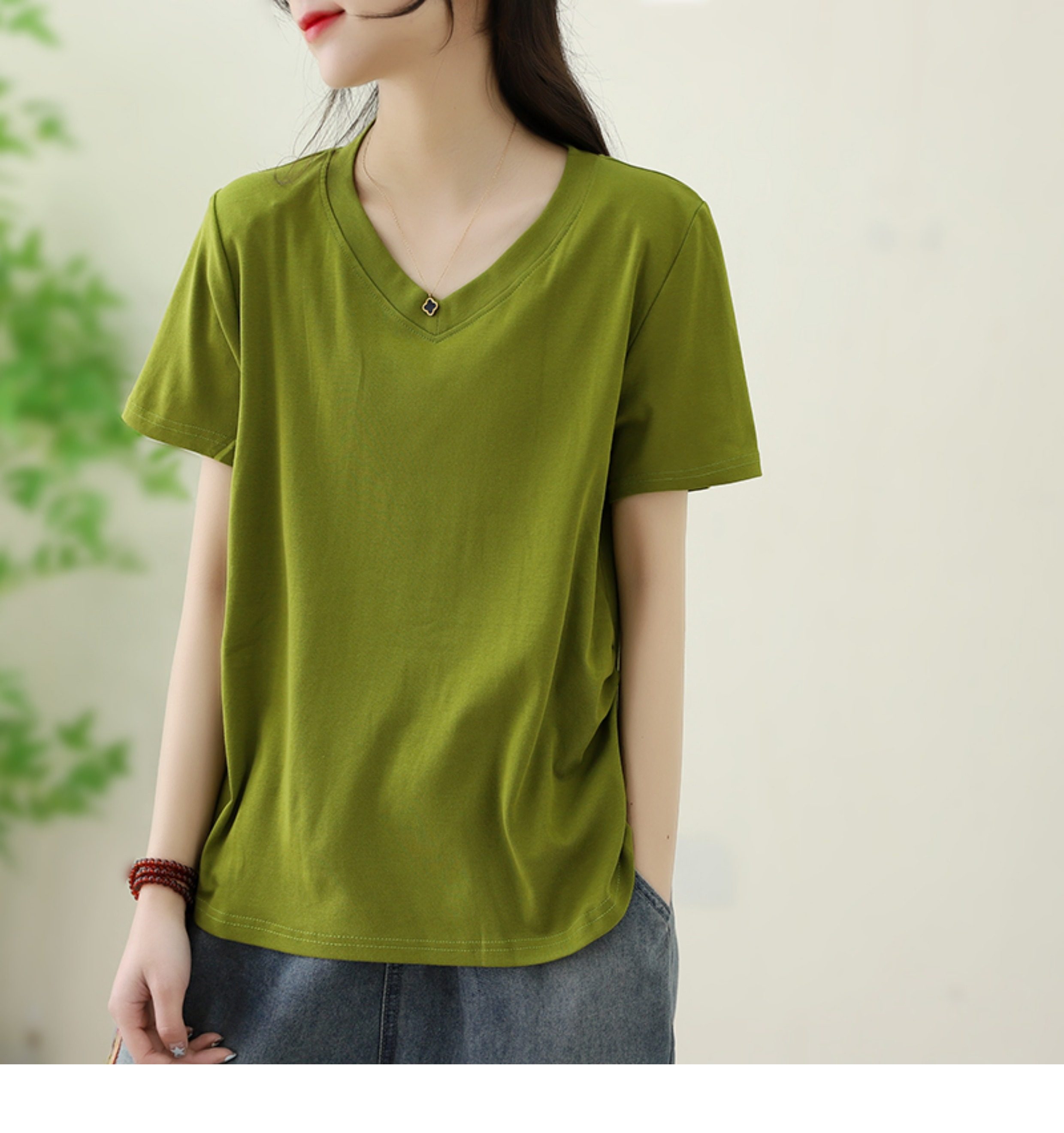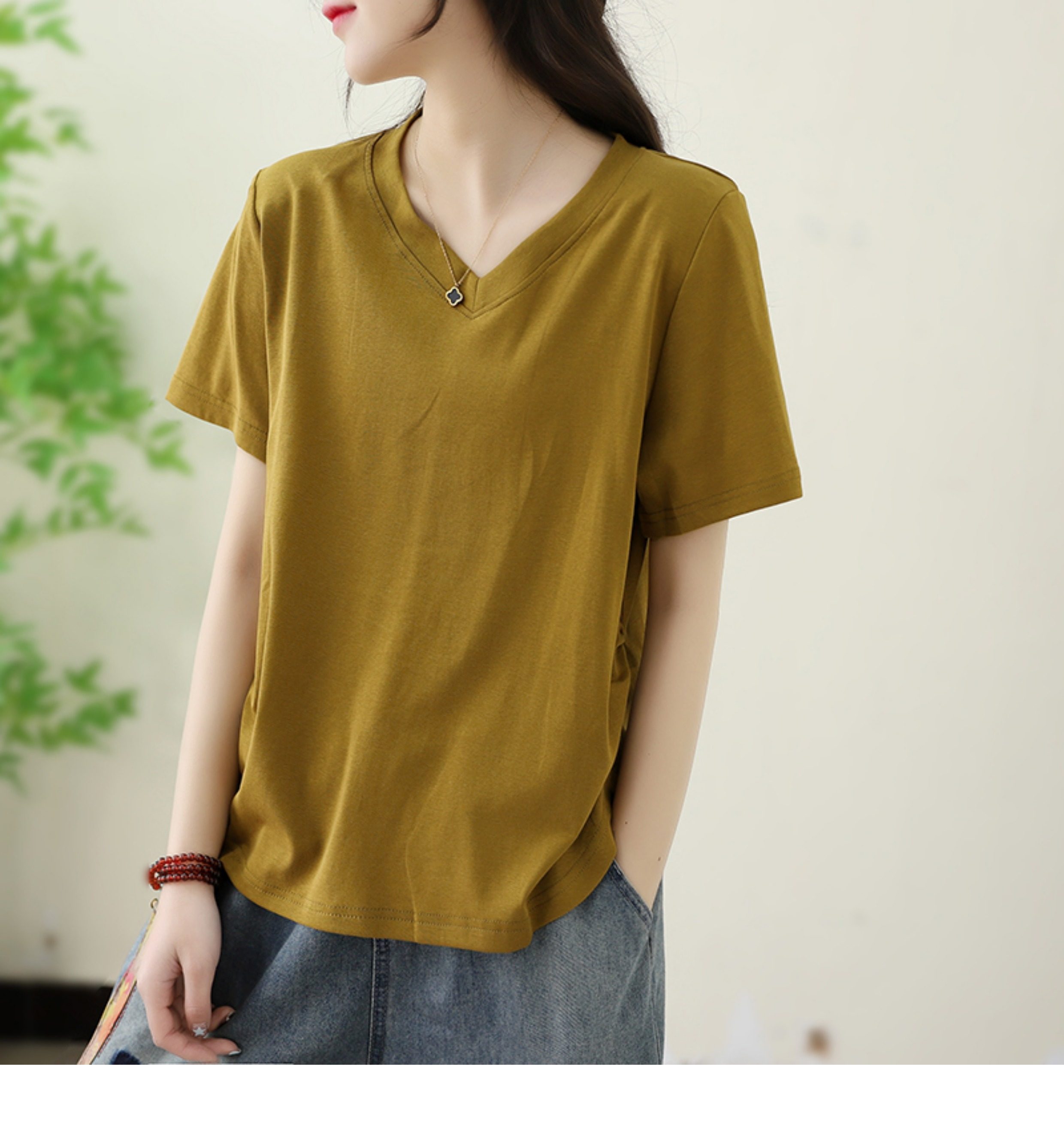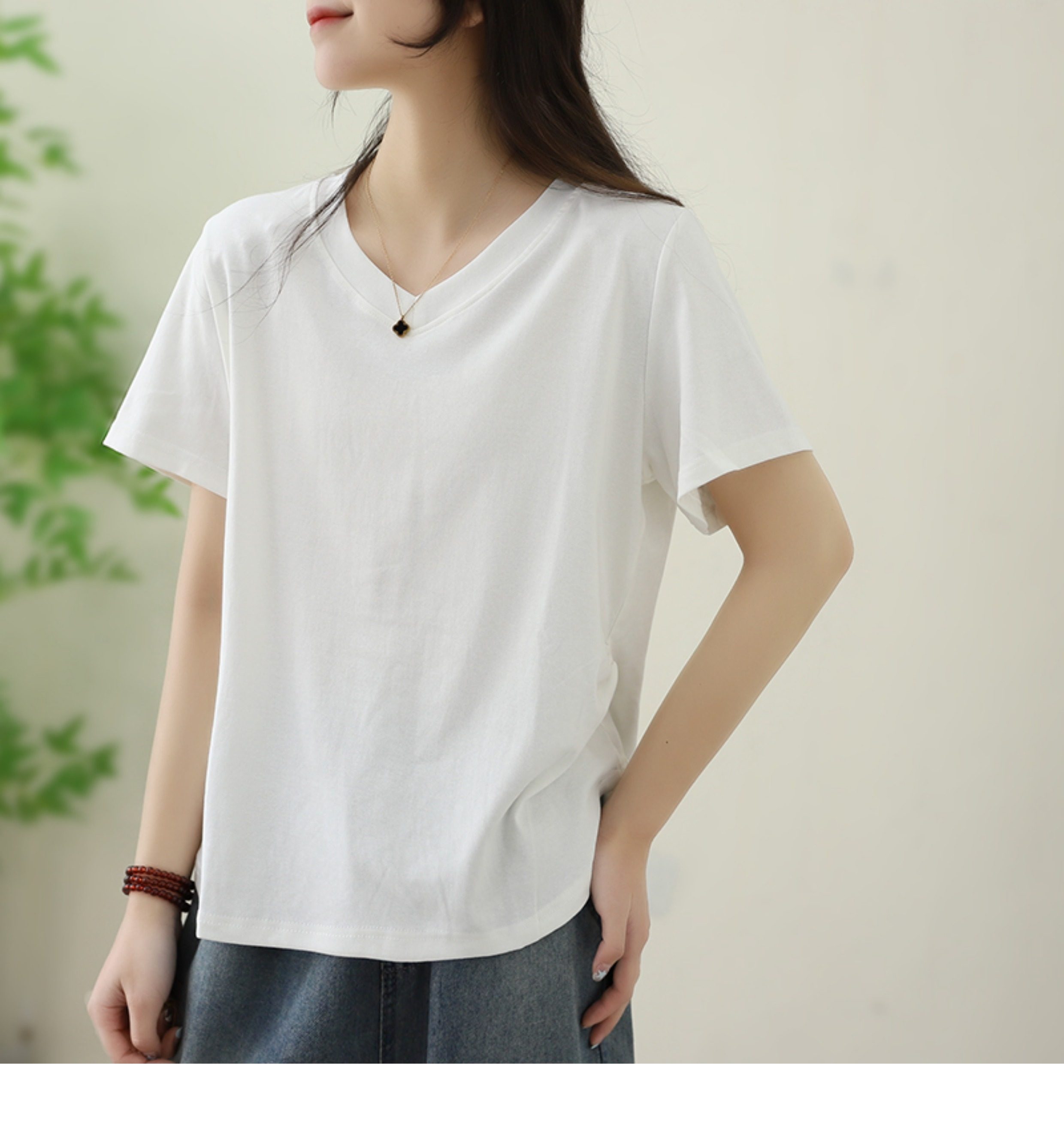 여름 V-넥 솔리드 컬러 코튼 탑 올 매치 루즈 핀치, 코튼 얇은 티셔츠 중국 전나무 여성용 반팔 캐주얼스토어 가기
