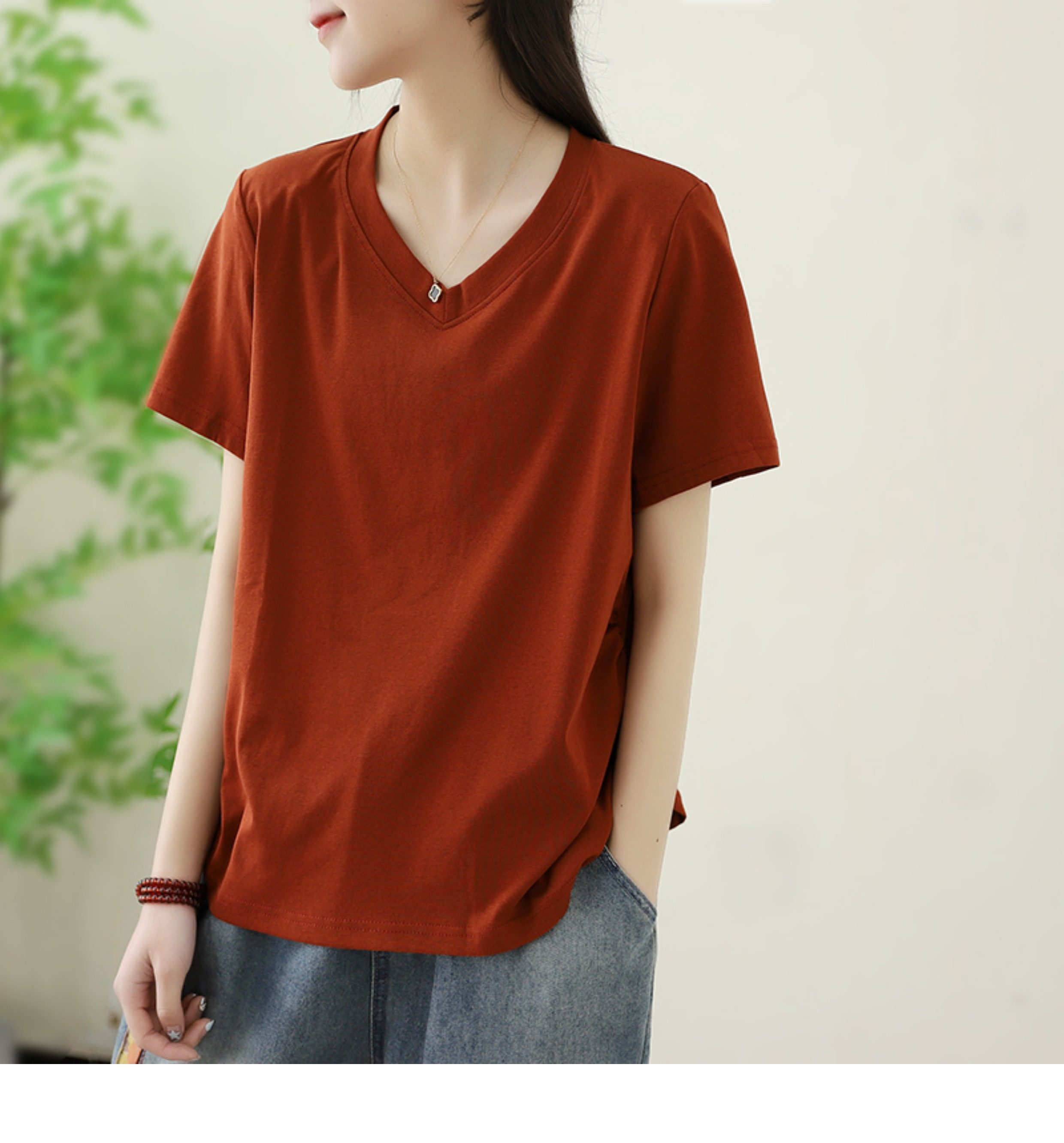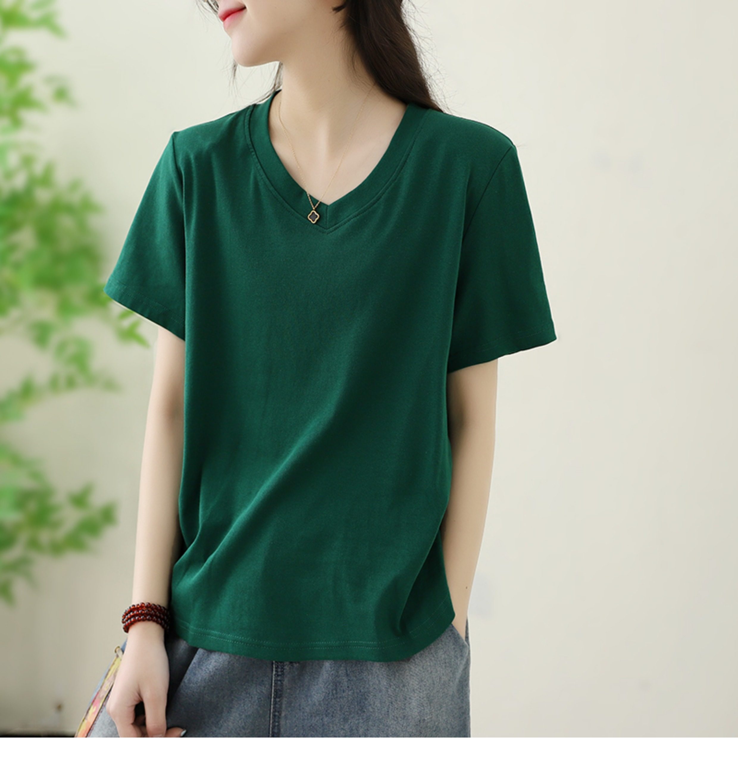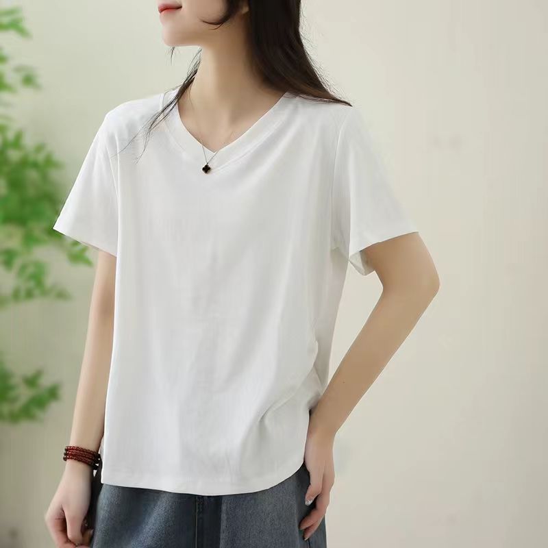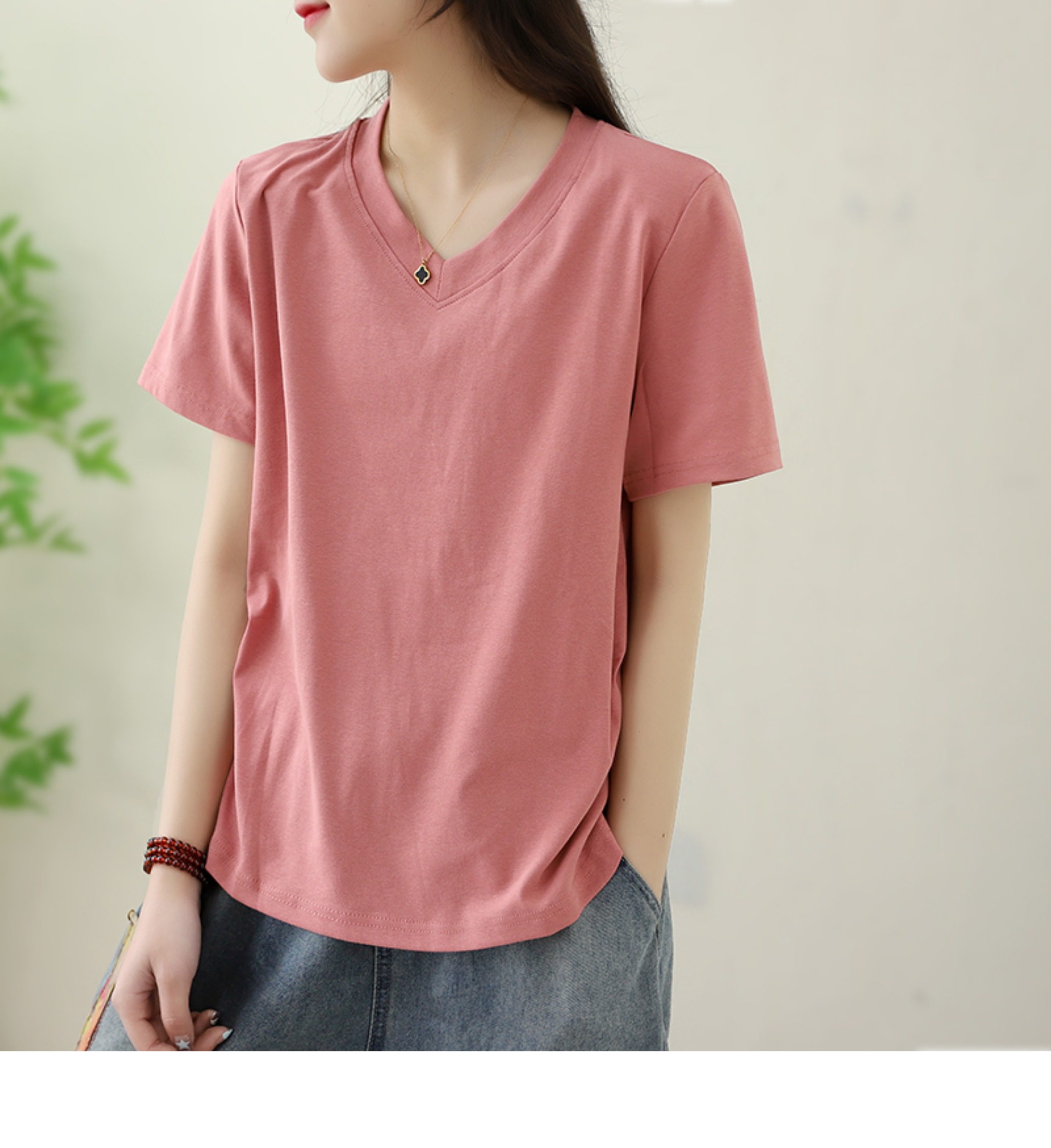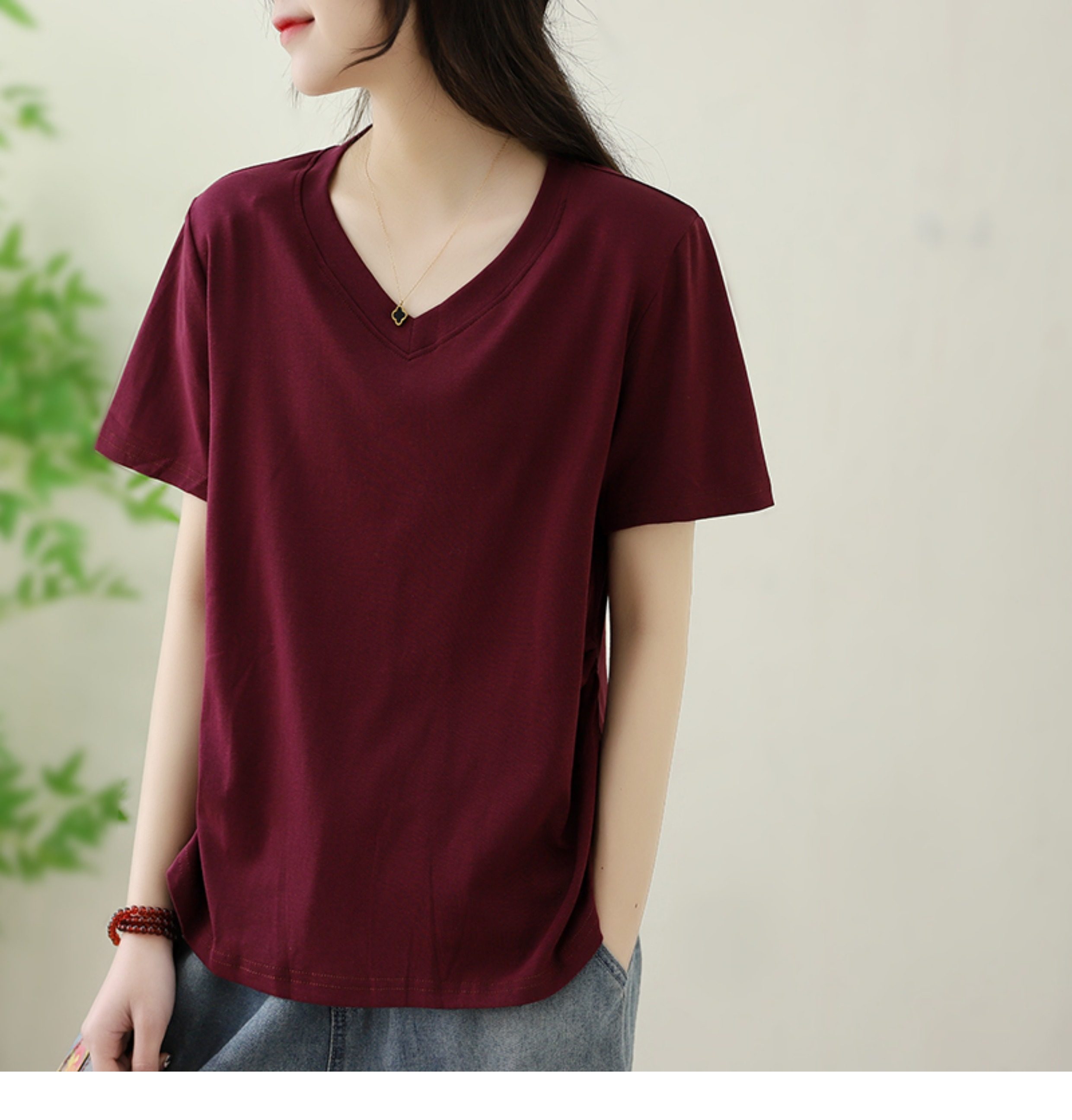 여름 V-넥 솔리드 컬러 코튼 탑 올 매치 루즈 핀치, 코튼 얇은 티셔츠 중국 전나무 여성용 반팔 캐주얼스토어 가기