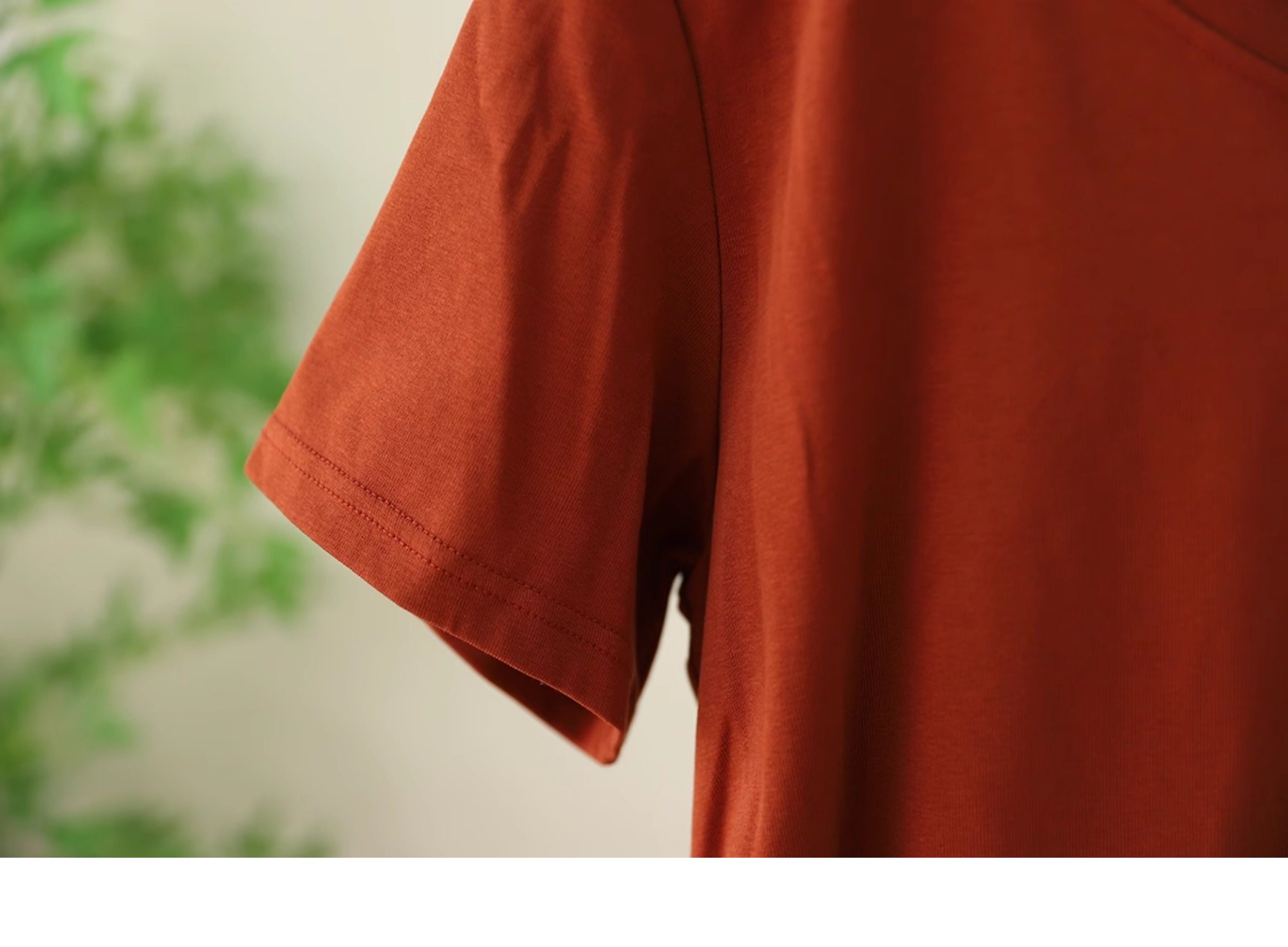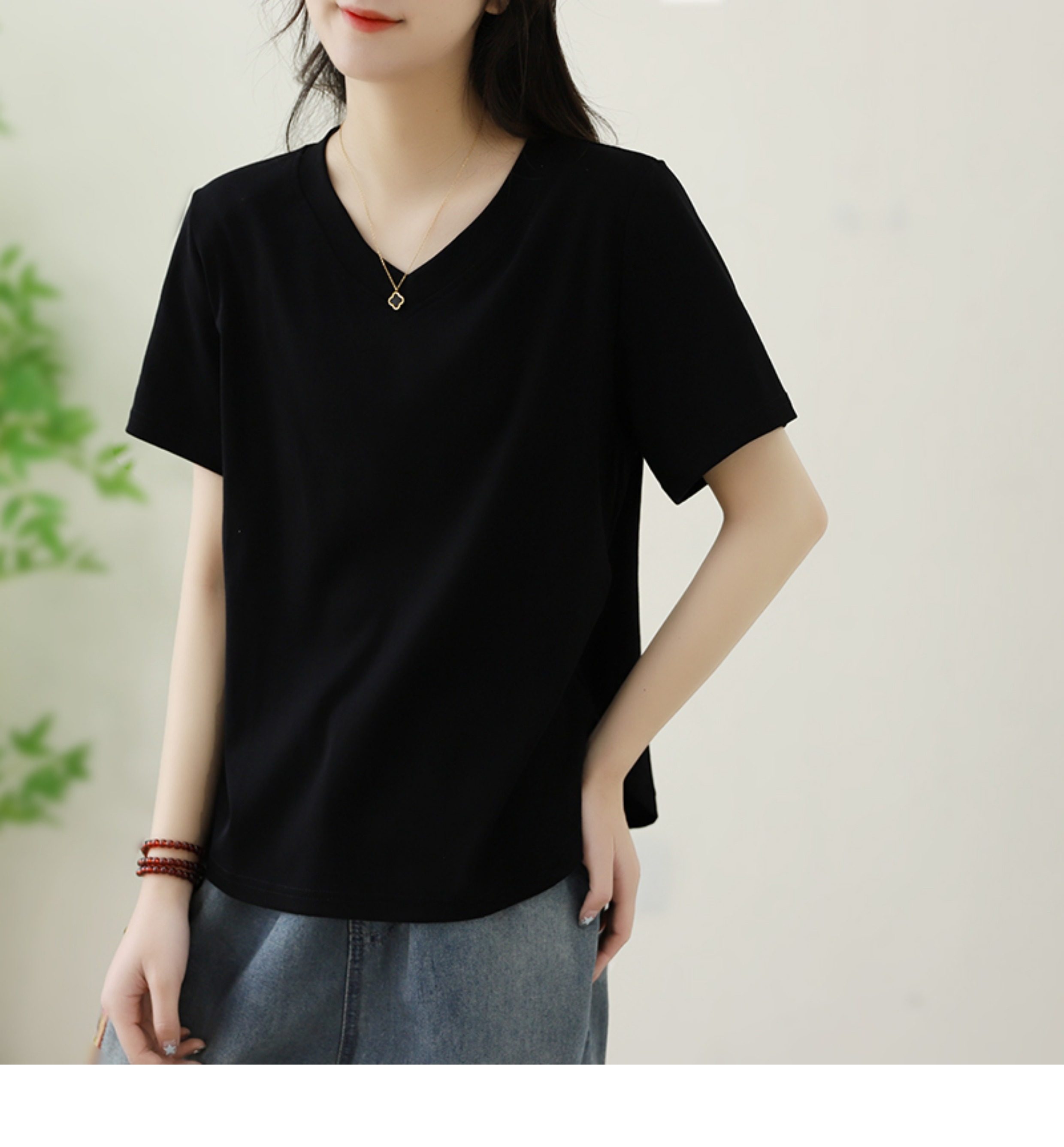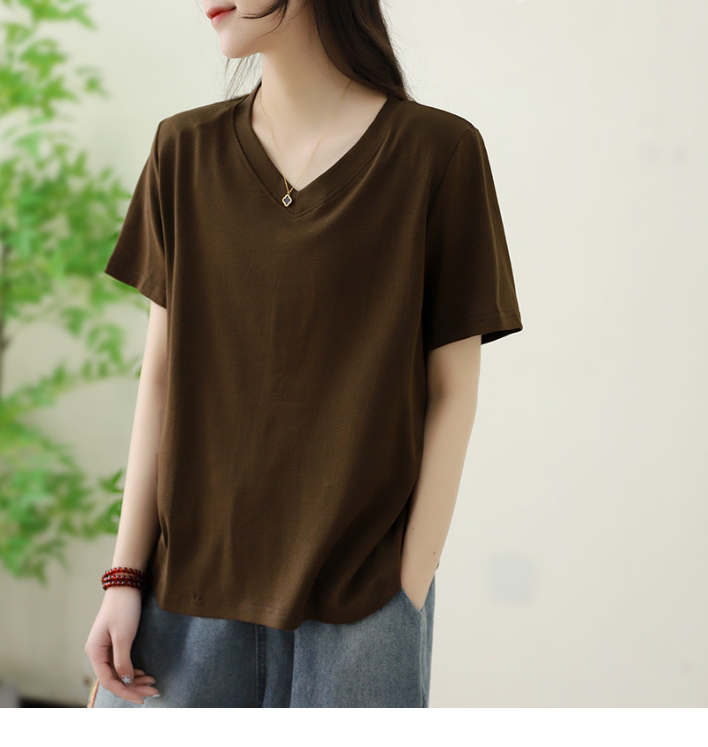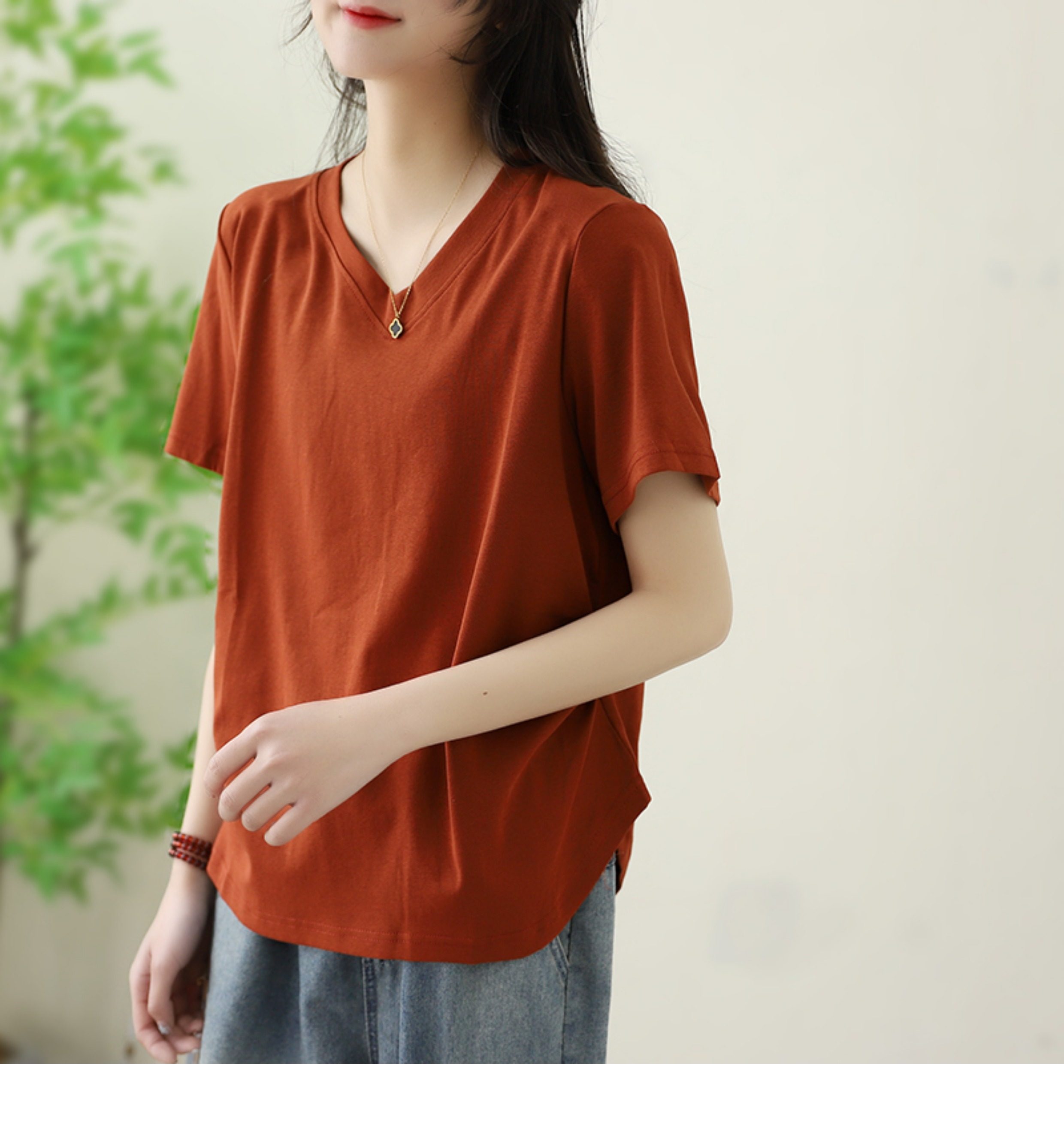 여름 V-넥 솔리드 컬러 코튼 탑 올 매치 루즈 핀치, 코튼 얇은 티셔츠 중국 전나무 여성용 반팔 캐주얼스토어 가기