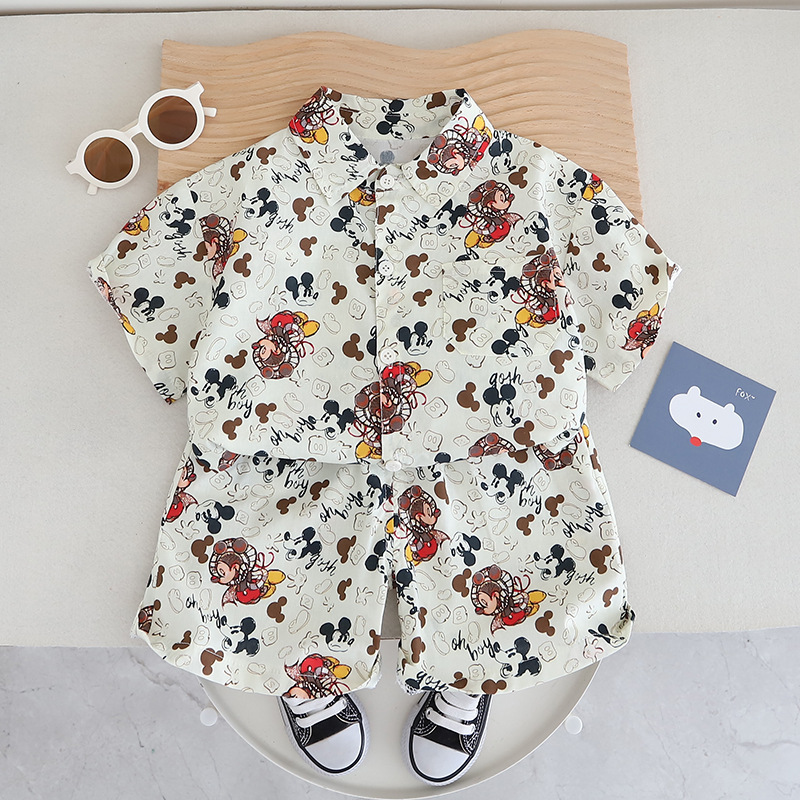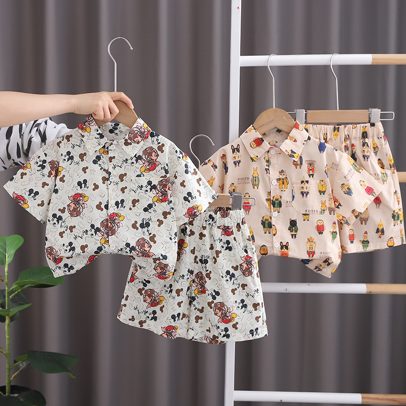 대외 무역 어린이 셔츠 세트 여름 2024 소년 소녀 아기 꽃 셔츠 반팔 투피스 세트 유럽과 미국 어린이 여름 옷