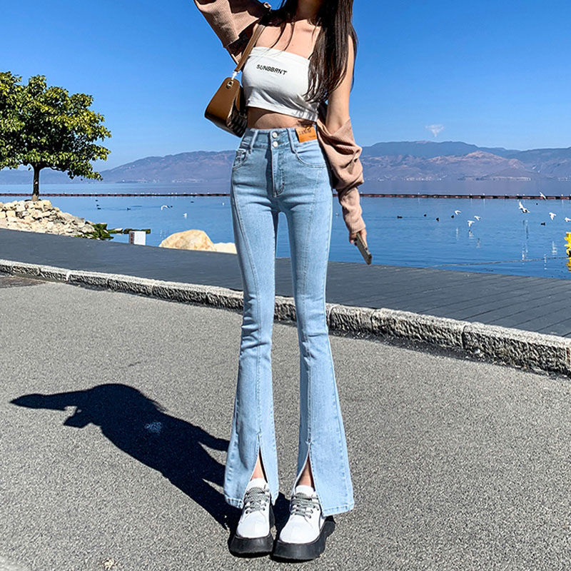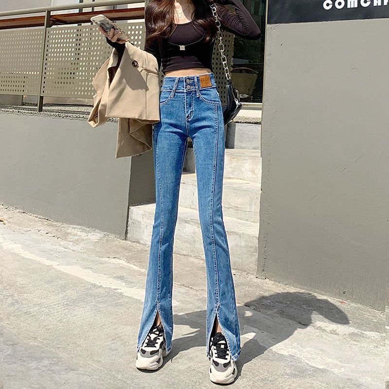 블랙 더블 버클 슬림 스플릿 디자인 플라 드 팬츠 여성의 새로운 청바지 2024 스트레치 걸레 바지스토어 가기