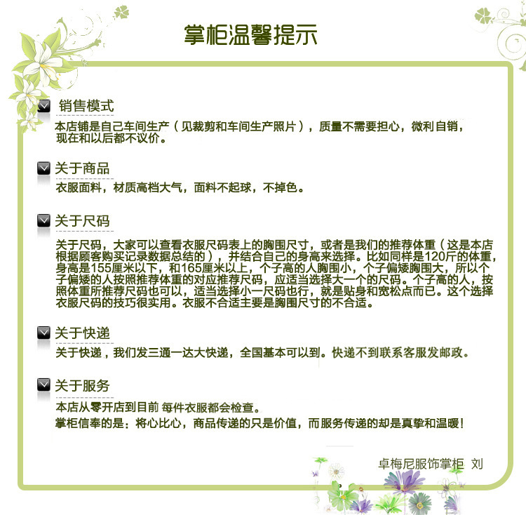 本店自产自销,见上面生产,仓库和打包台等图片。全部仔细检查才发货,每一件衣服都有检查发货清晰的监控视频可随时查看。目前所知,没有比我们对品质检查更仔细的店铺。尺码选择,按照尺码推荐体重范围再根据自己身高适当调节。面料,不掉色,不起球。默认发韵达,不到批注或者联系客服发邮政。