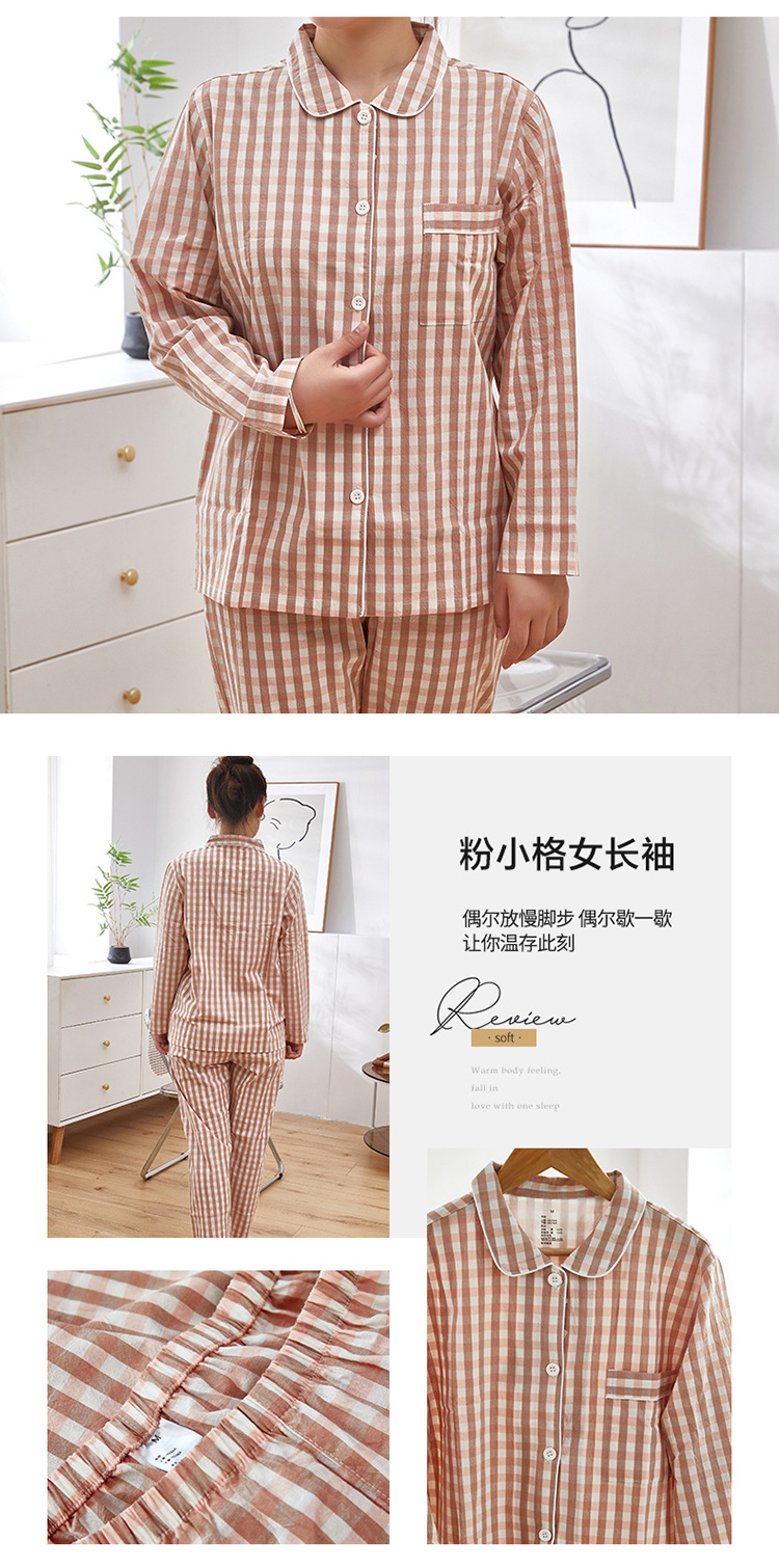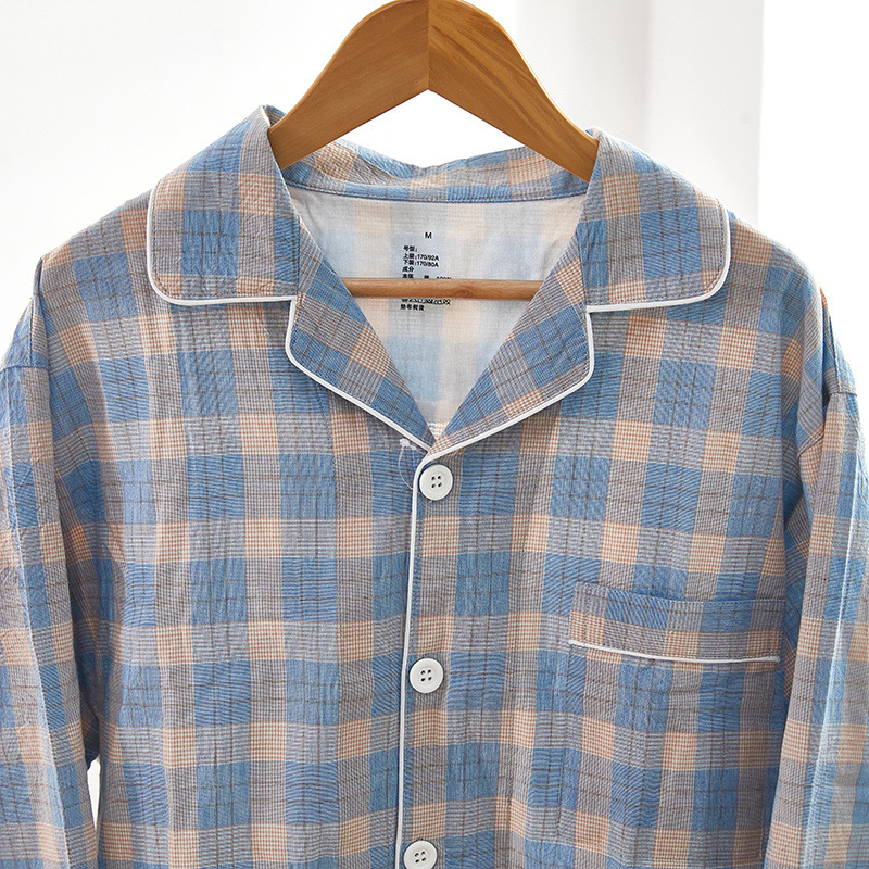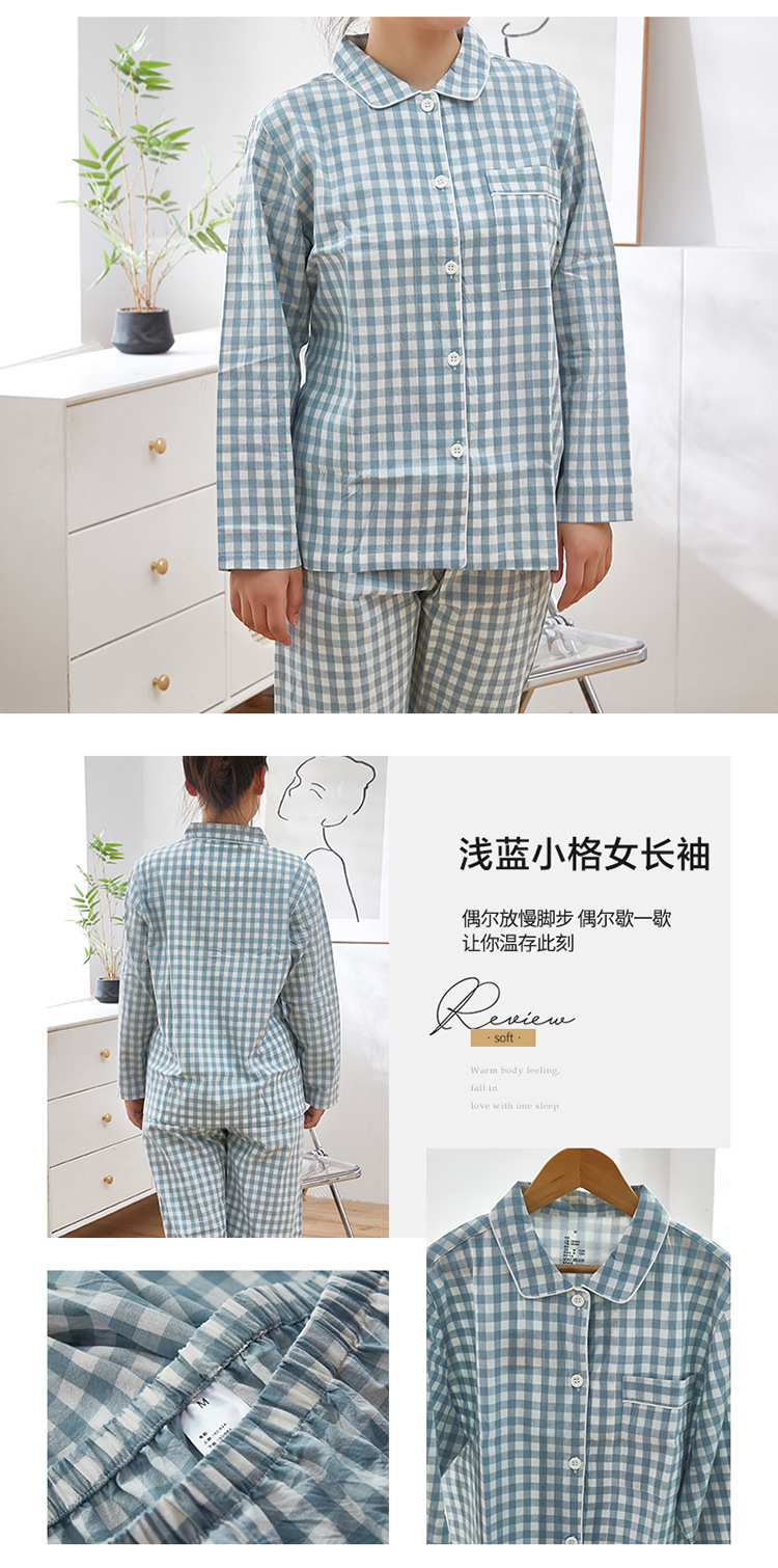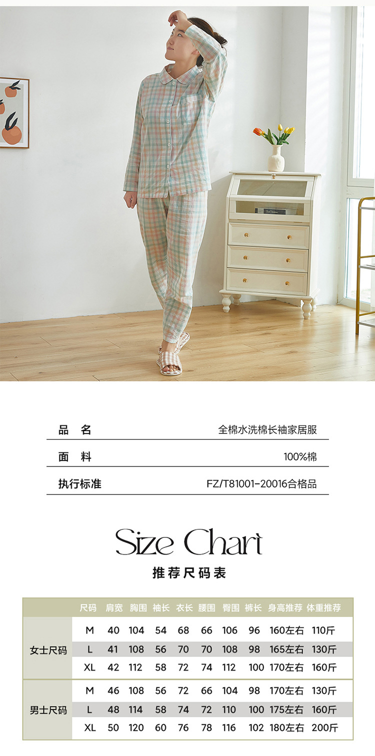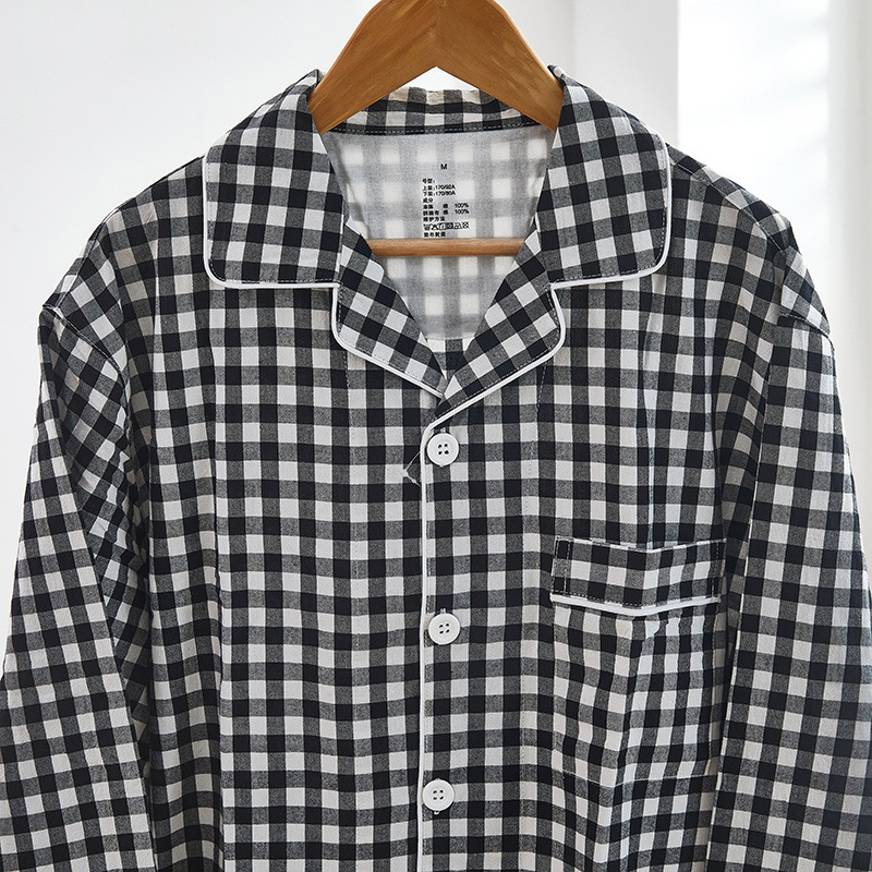 MUJI 일본식 퓨어 코튼 파자마 여성용 긴팔 체크 무늬 봄 및 여름 얇은 면 홈 의류 남성용스토어 가기