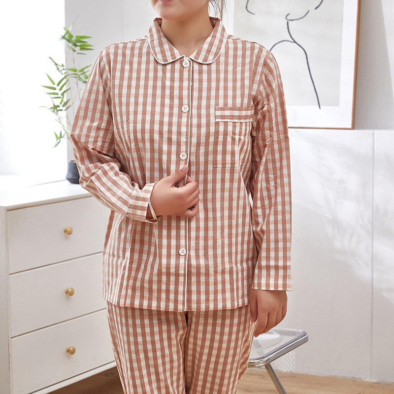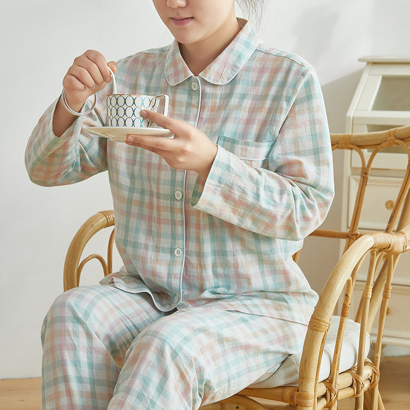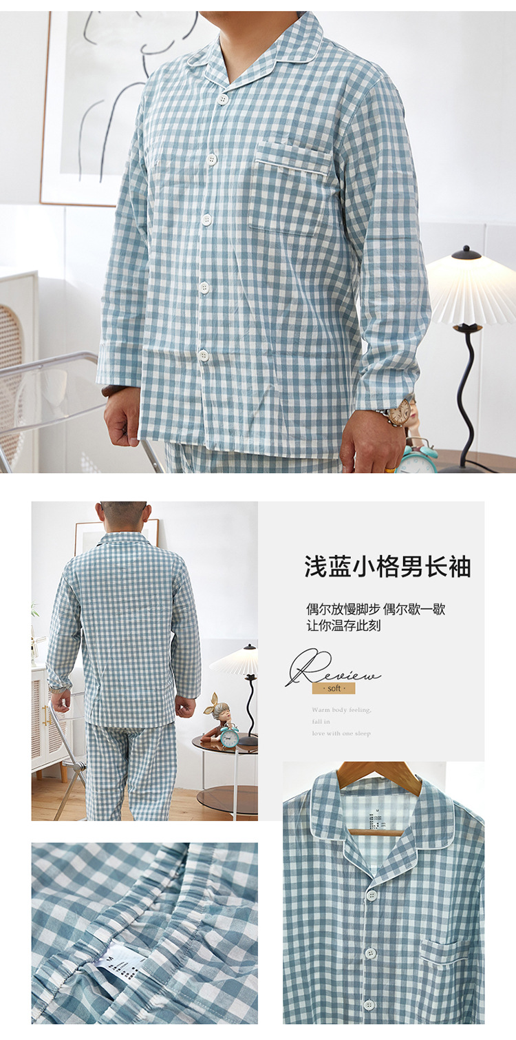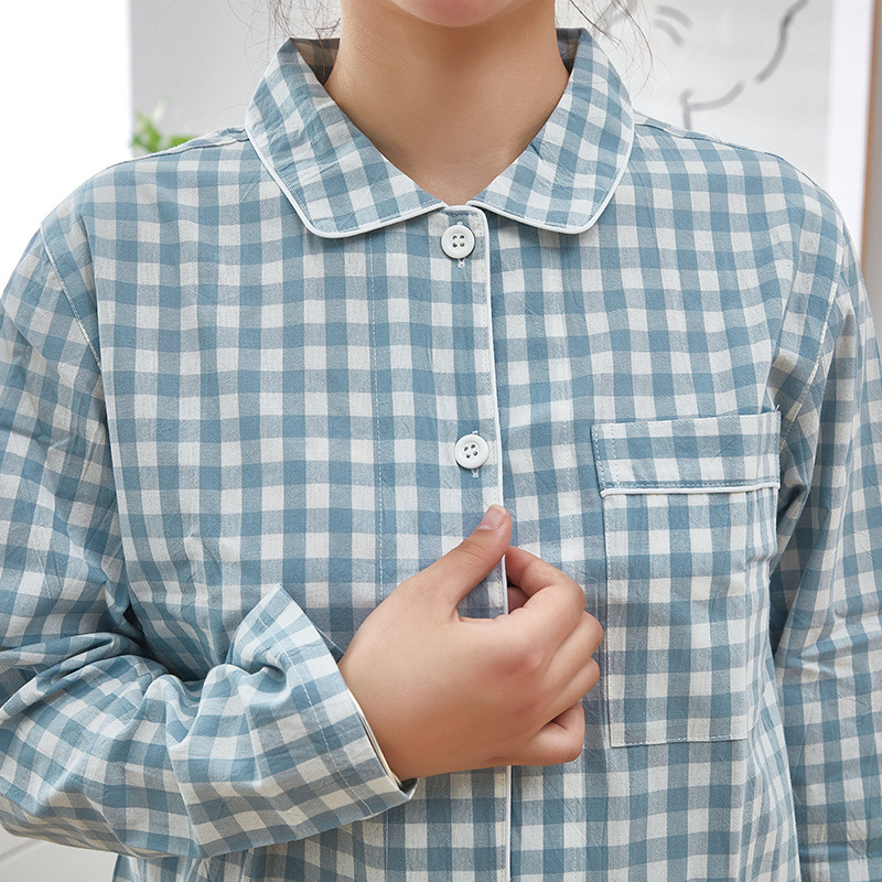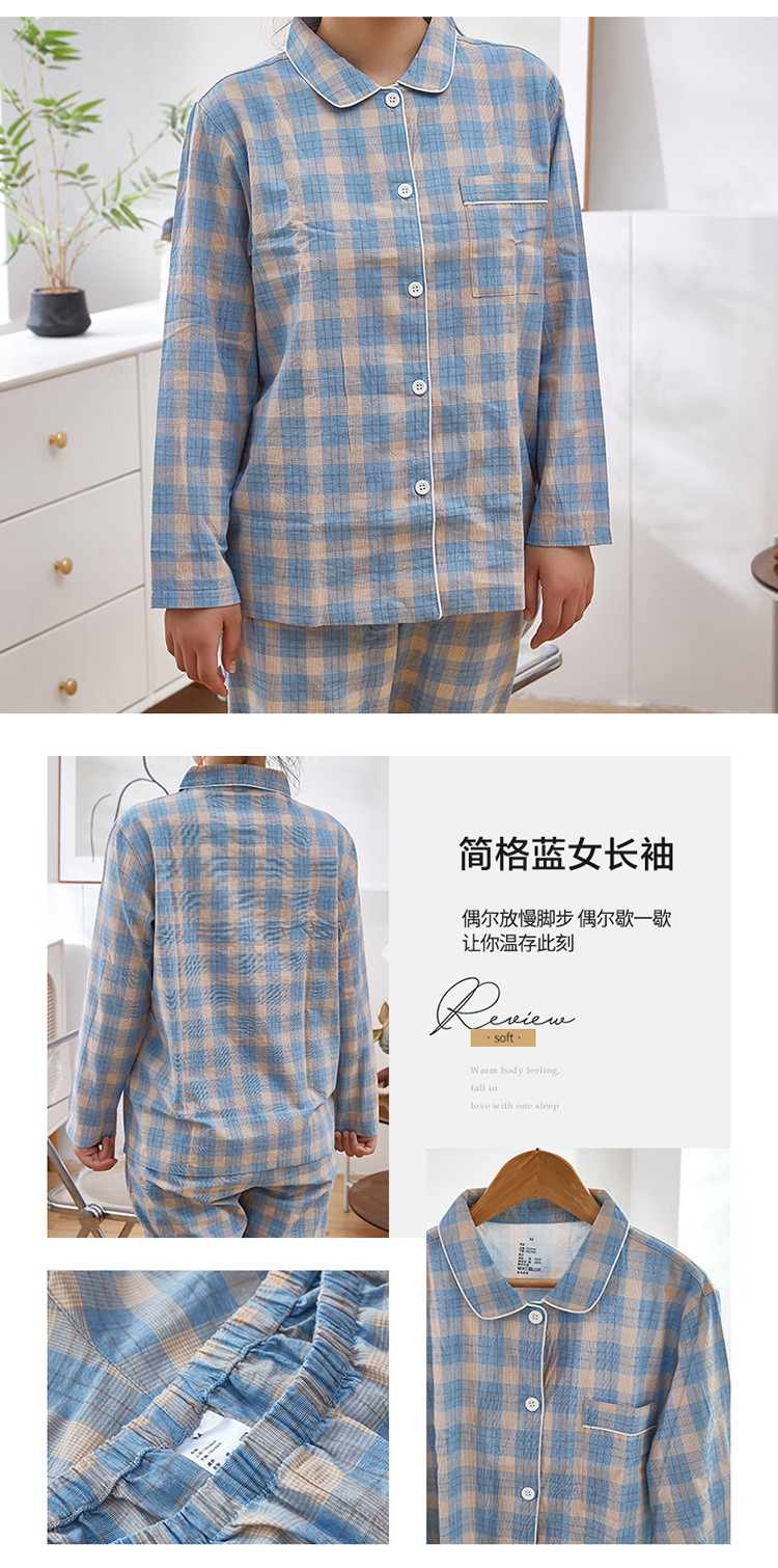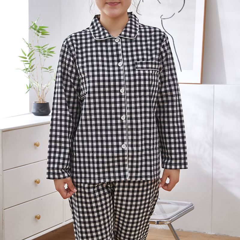 MUJI 일본식 퓨어 코튼 파자마 여성용 긴팔 체크 무늬 봄 및 여름 얇은 면 홈 의류 남성용스토어 가기