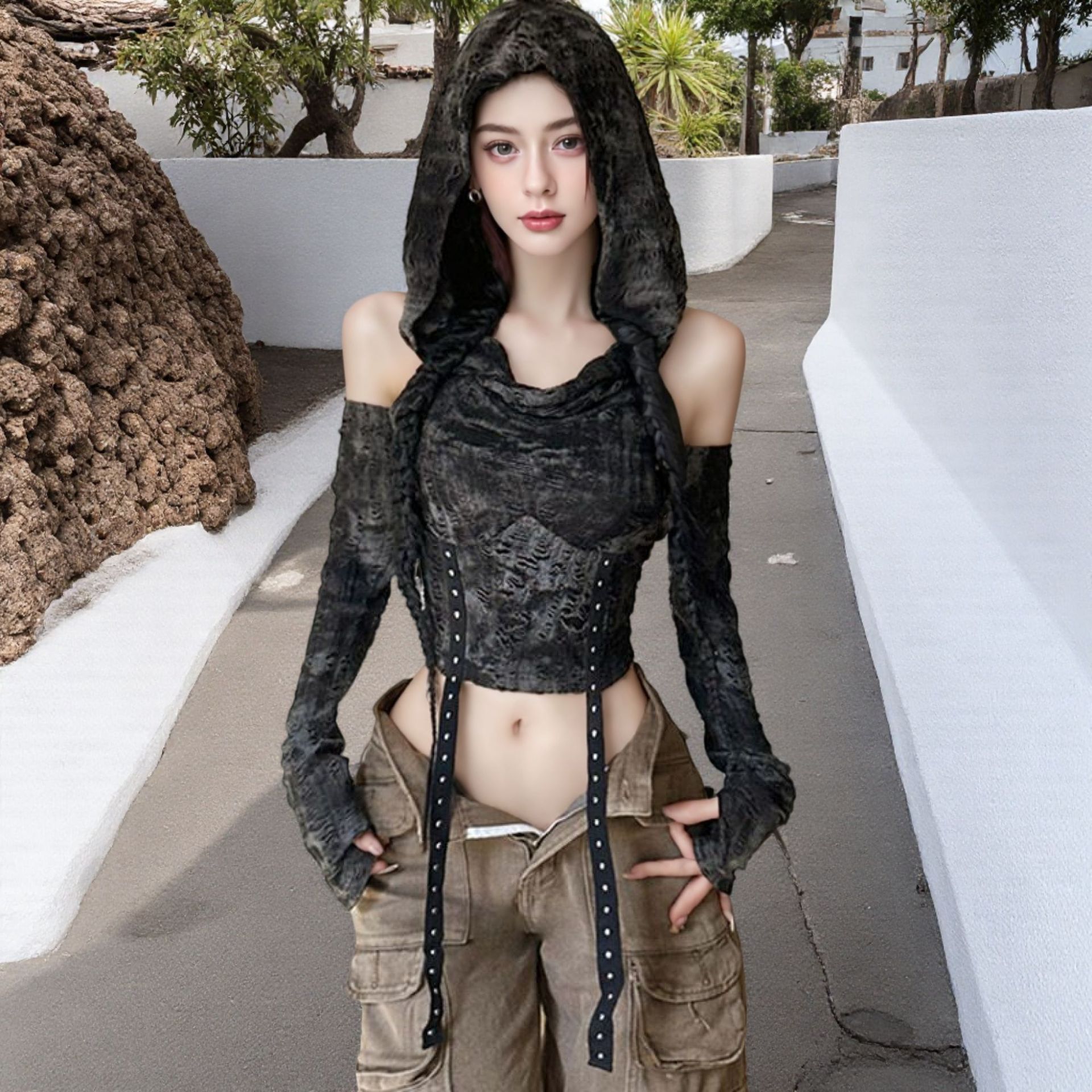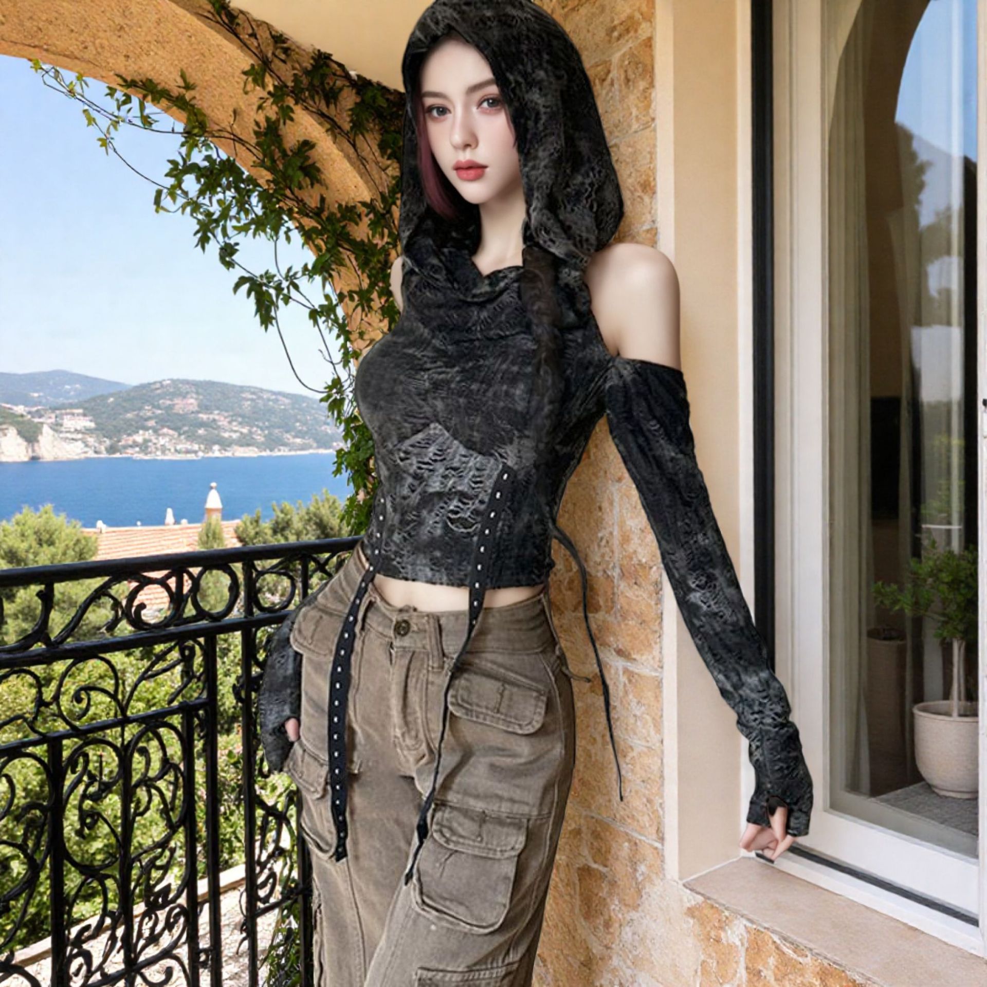Cross-border 2024 새로운 도착 WASTE 스타일 손으로 착용 한 후드 숄더 긴팔 티셔츠 여성용 슬리밍 독특한 쇼트 탑