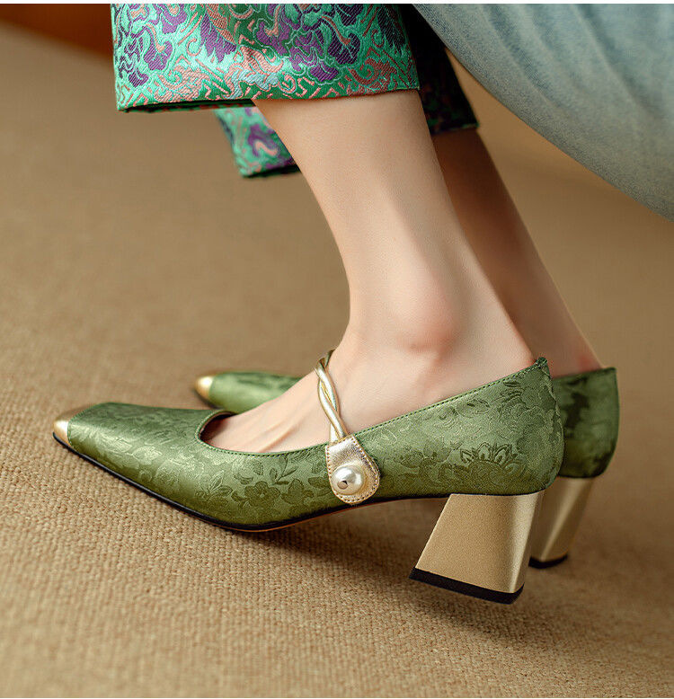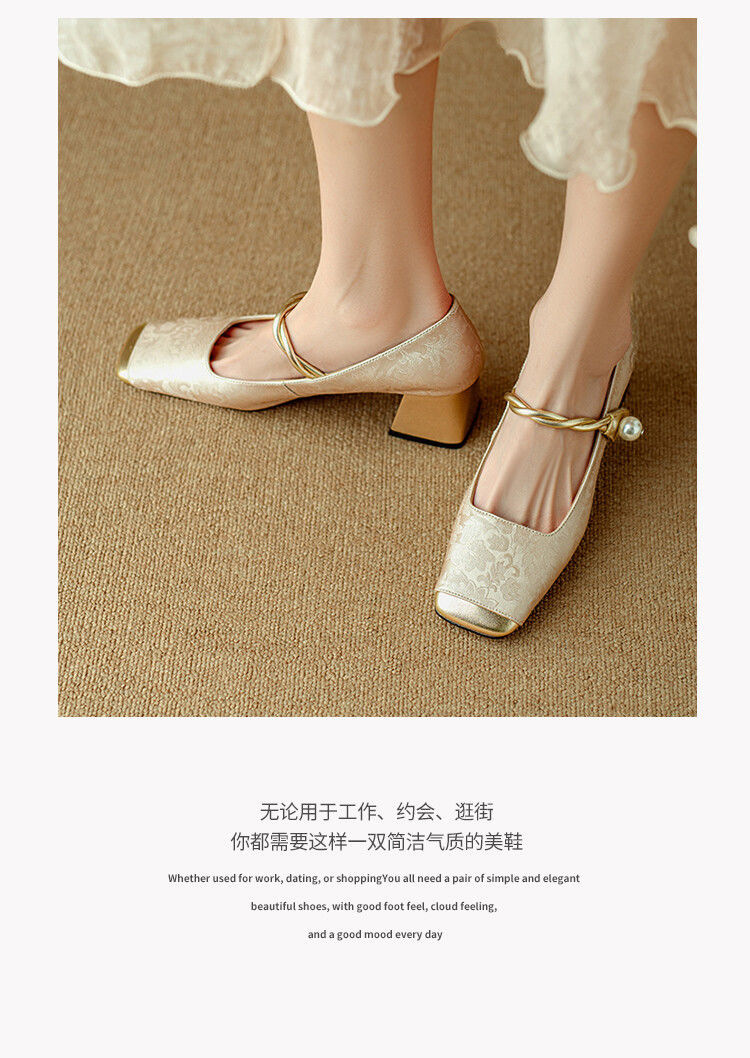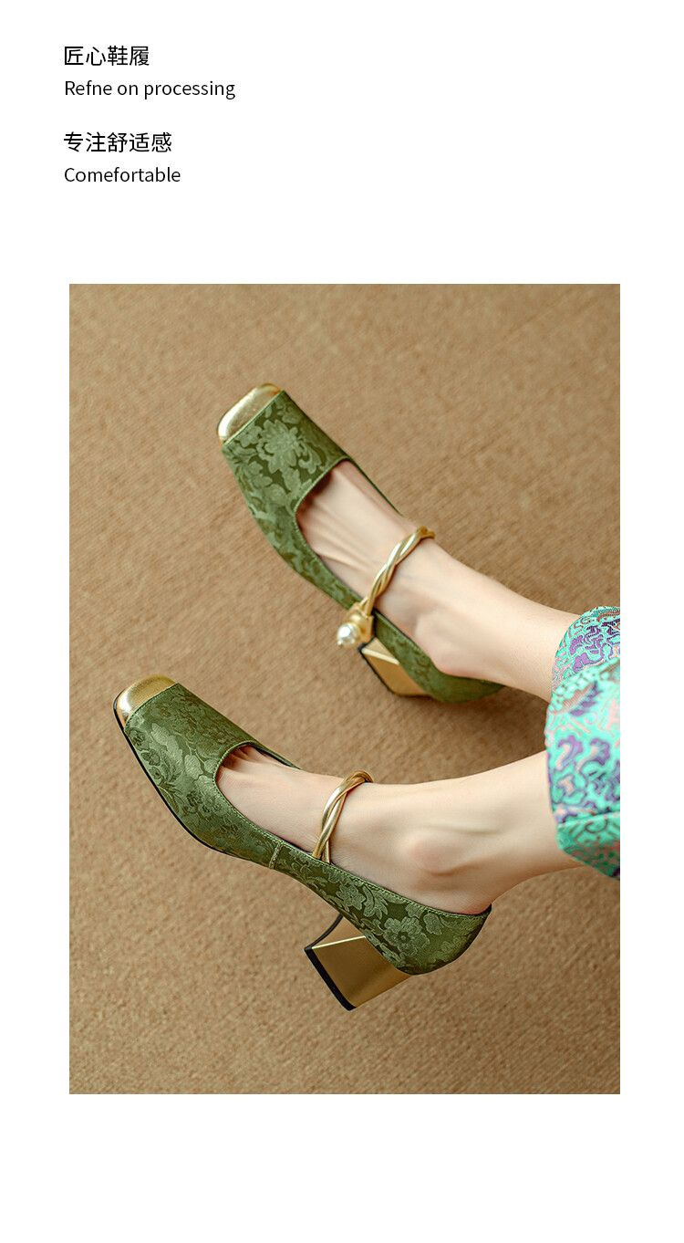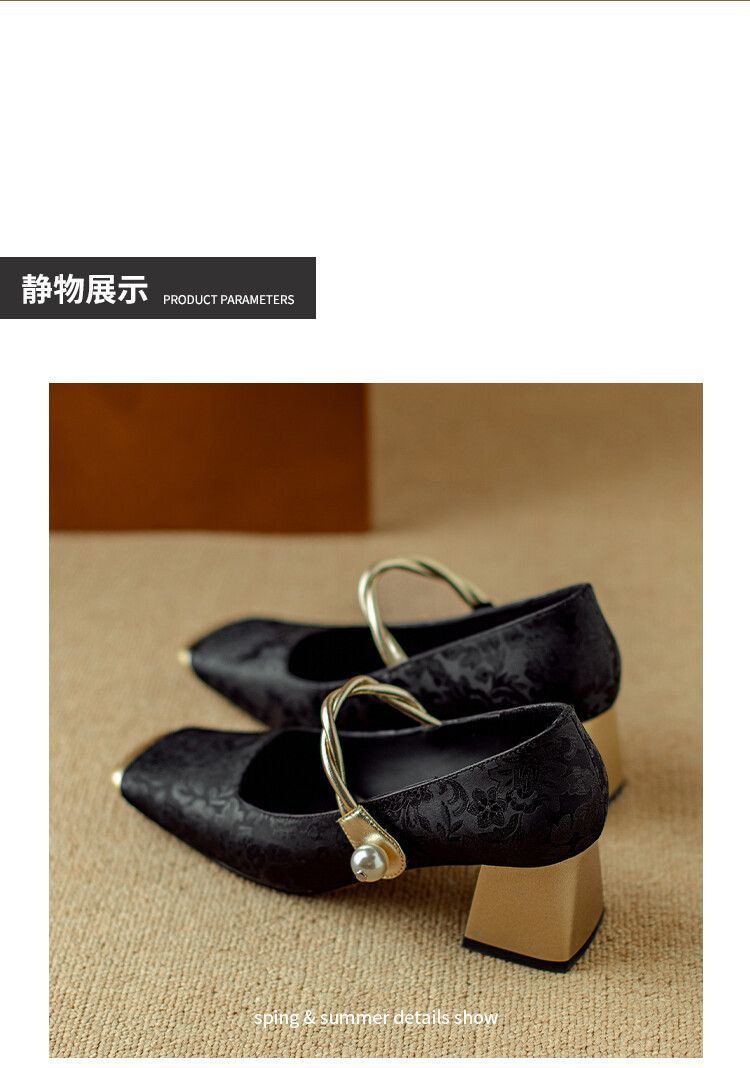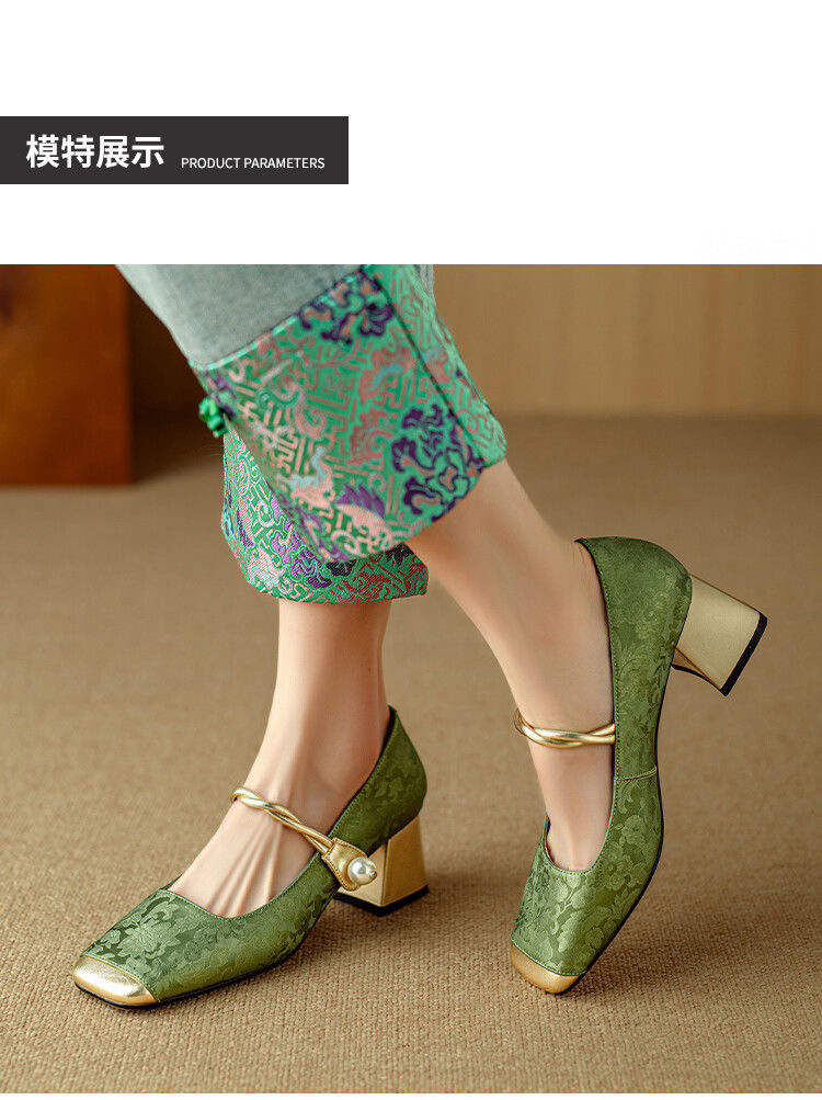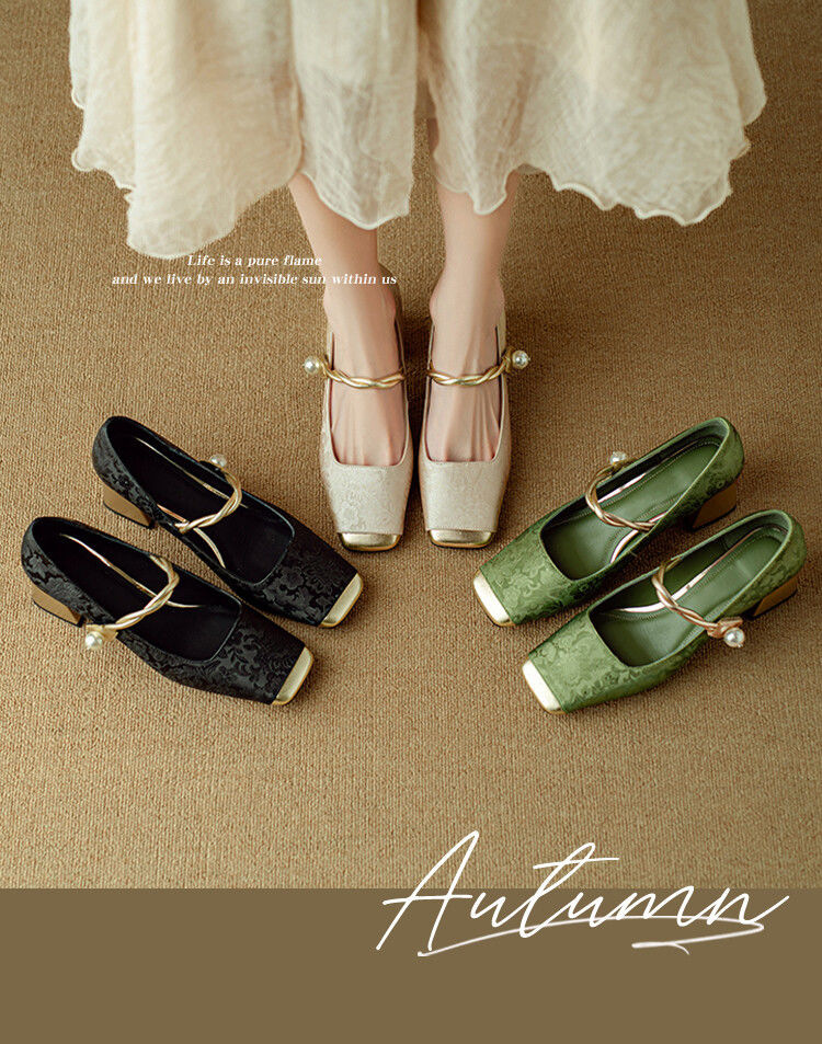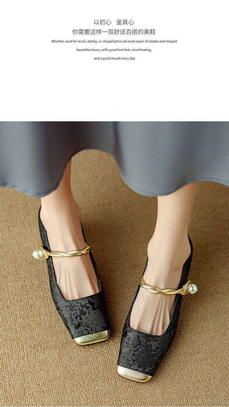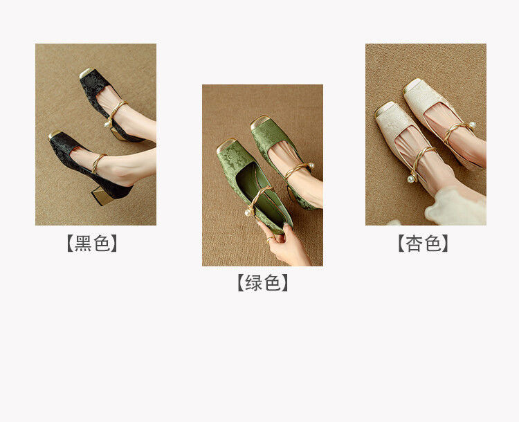 신중국풍 진주 단화 2025 봄 신상 레트로 다용도 굵은 굽 사각코 얕은 굽 여성화 도매스토어 가기