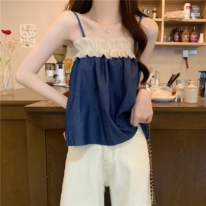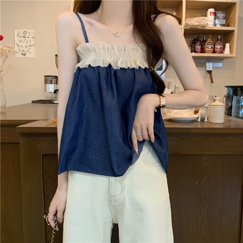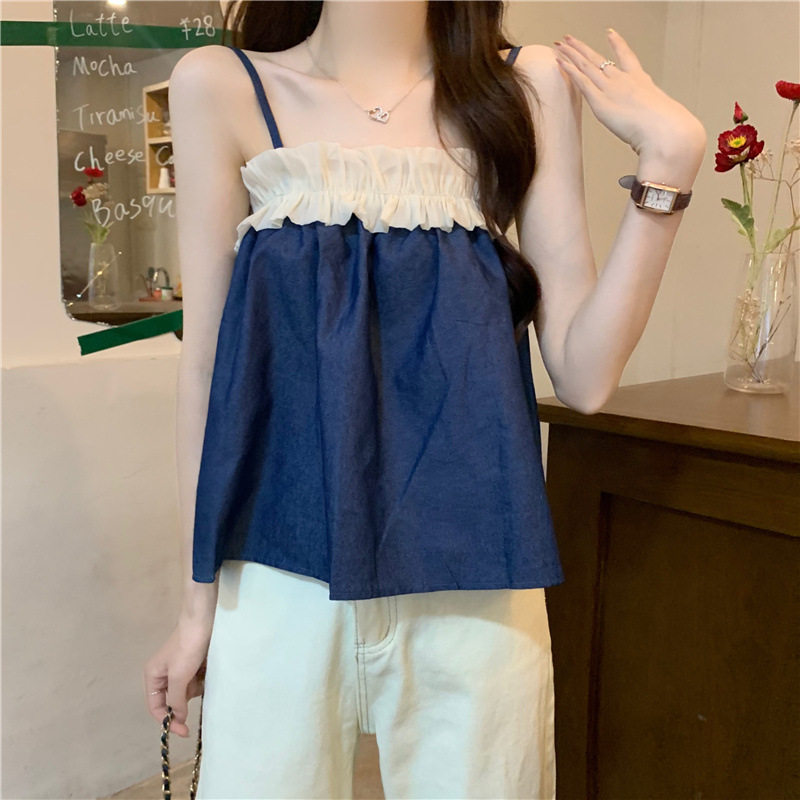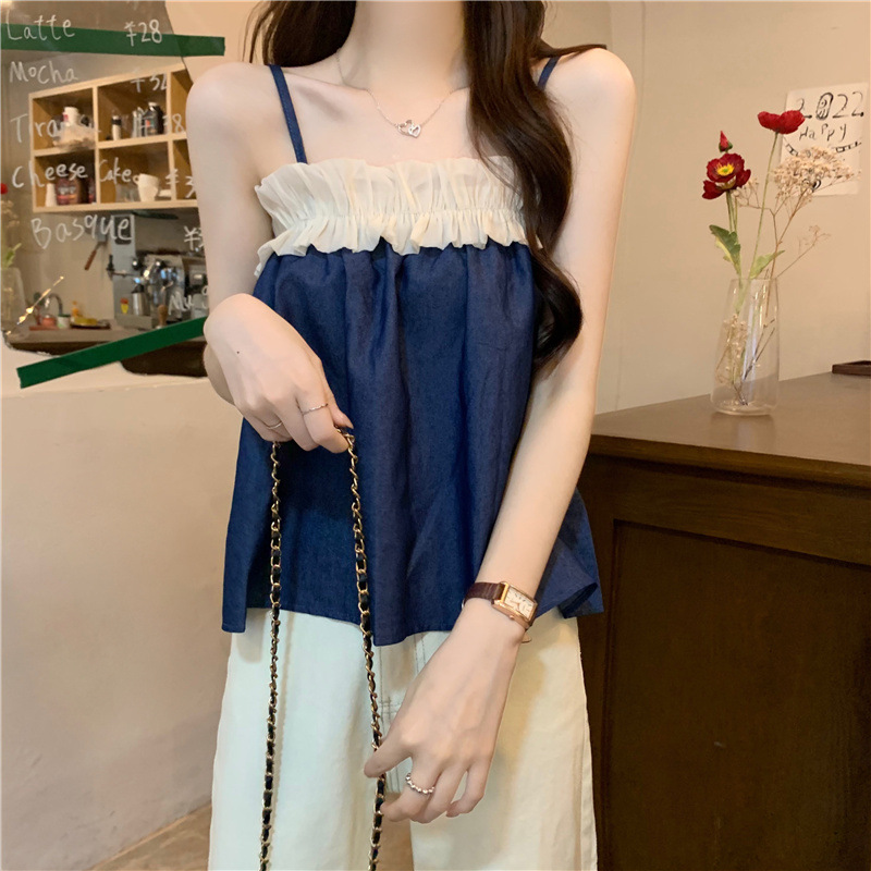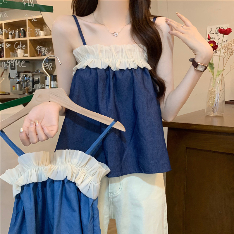 달콤한 쉬폰 바느질 러플 카미솔 탑 여름 레트로 한국 스타일 느슨한 인형 셔츠 데님 작은 조끼스토어 가기