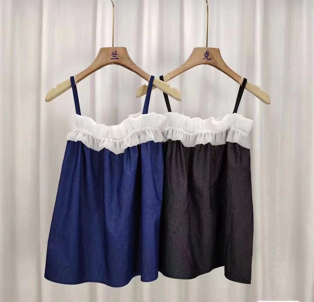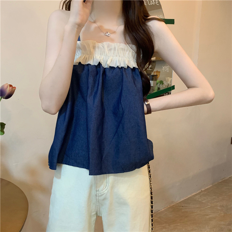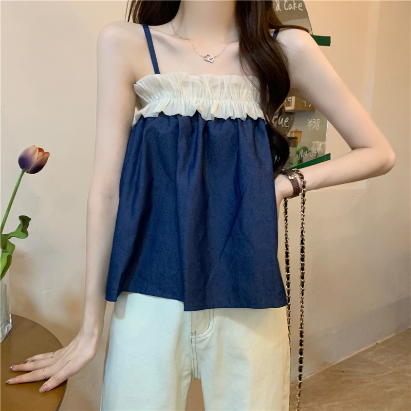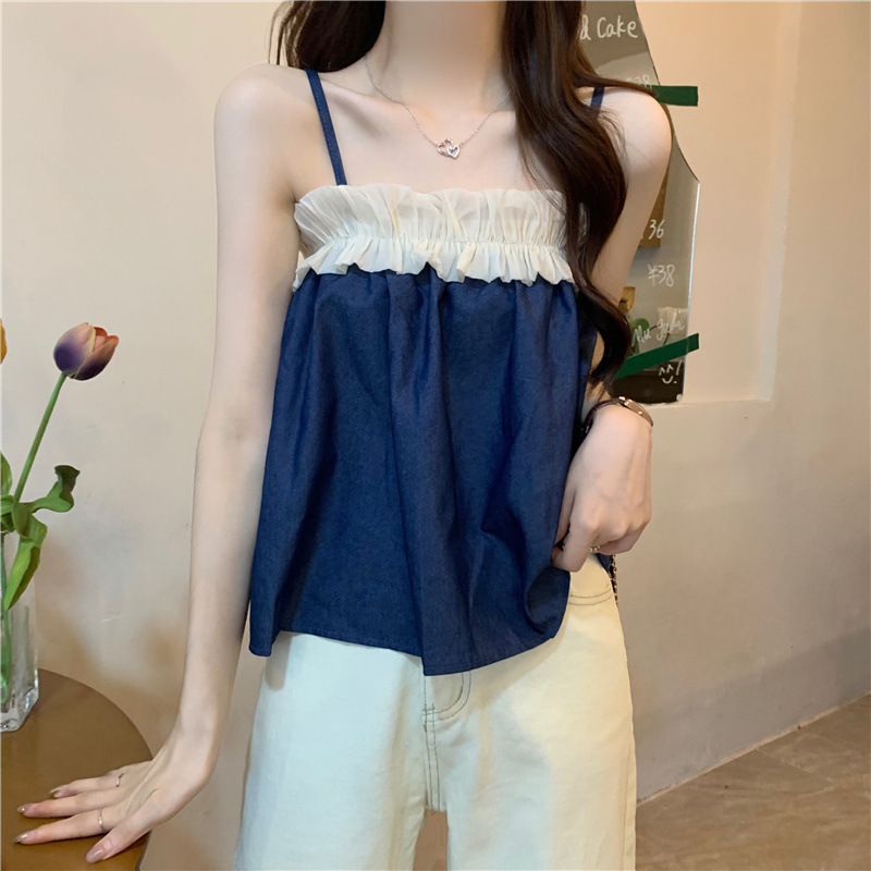 달콤한 쉬폰 바느질 러플 카미솔 탑 여름 레트로 한국 스타일 느슨한 인형 셔츠 데님 작은 조끼스토어 가기