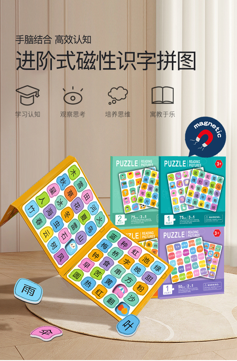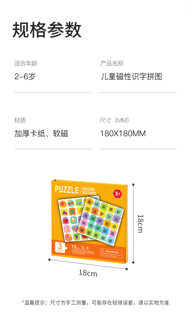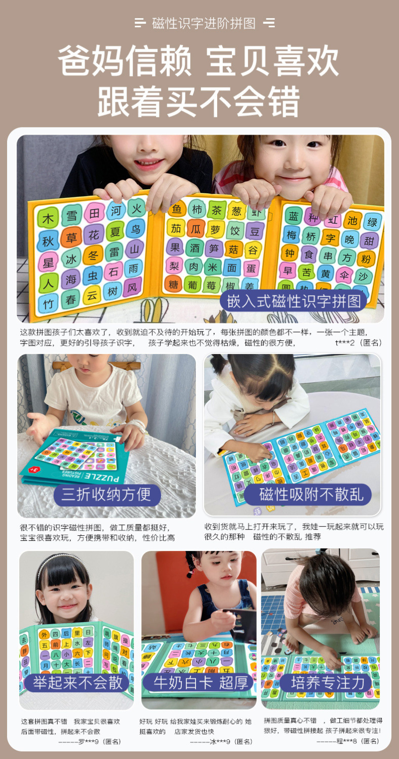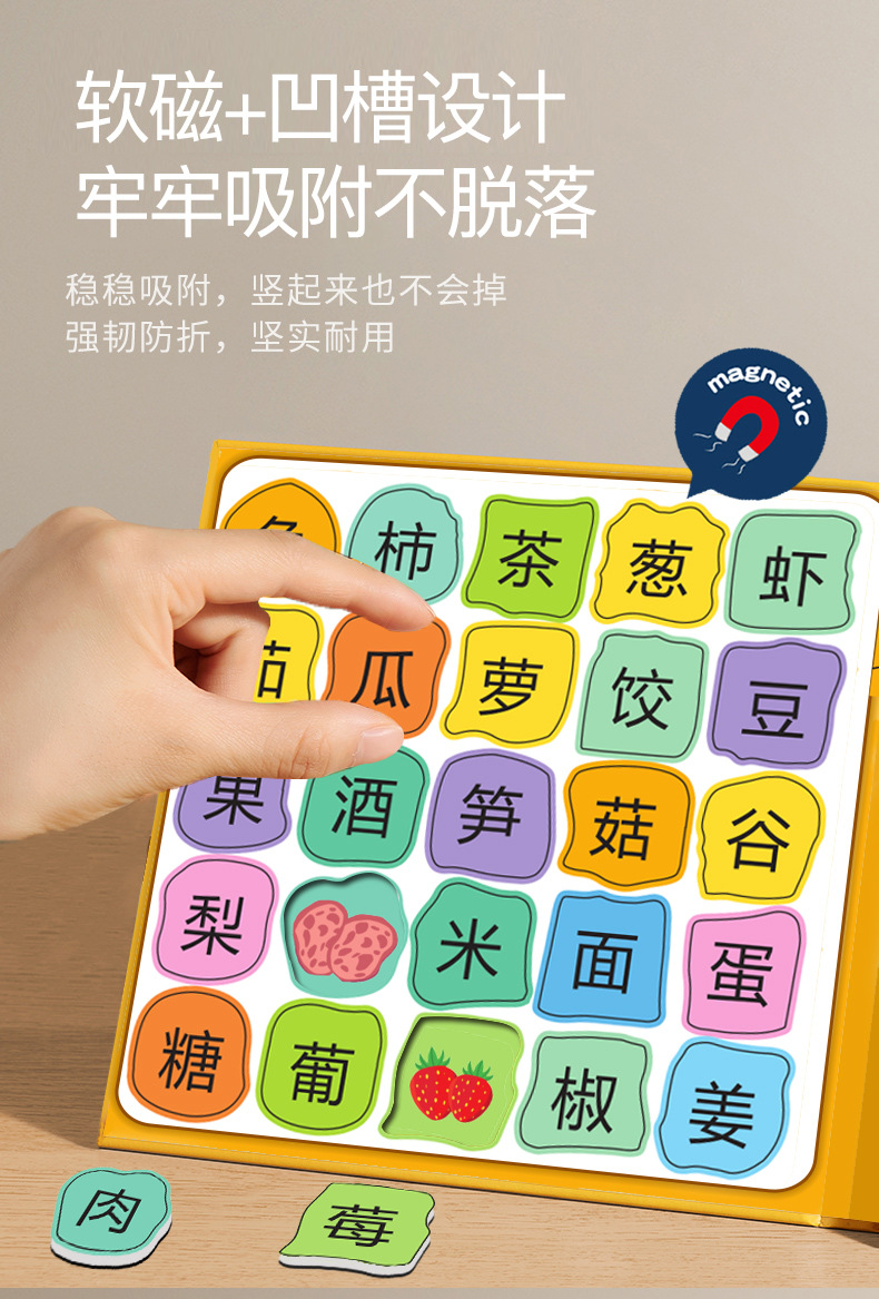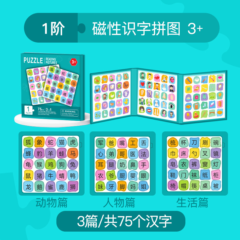 特别提醒:本厂产品激光切割,光滑无毛刺,非常贴合不易开裂,磁性强,放心玩,全套275个常用字体,看图识字,是一款让孩子爱上识字的磁性拼图书。