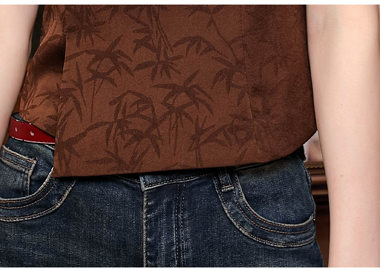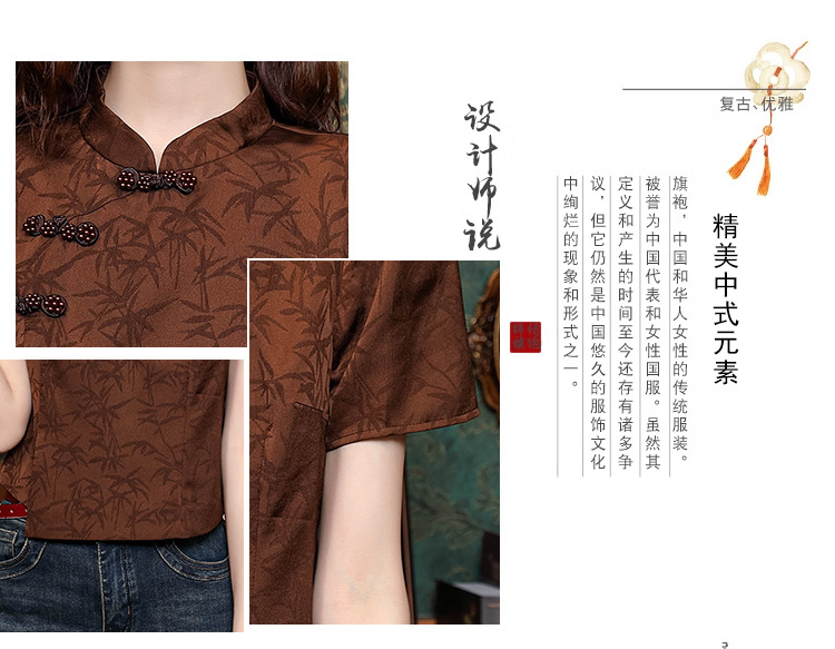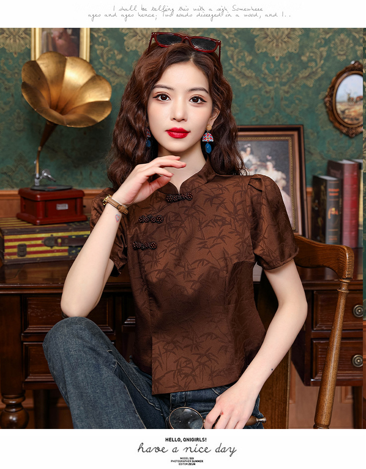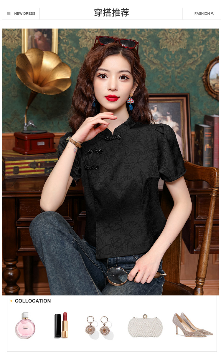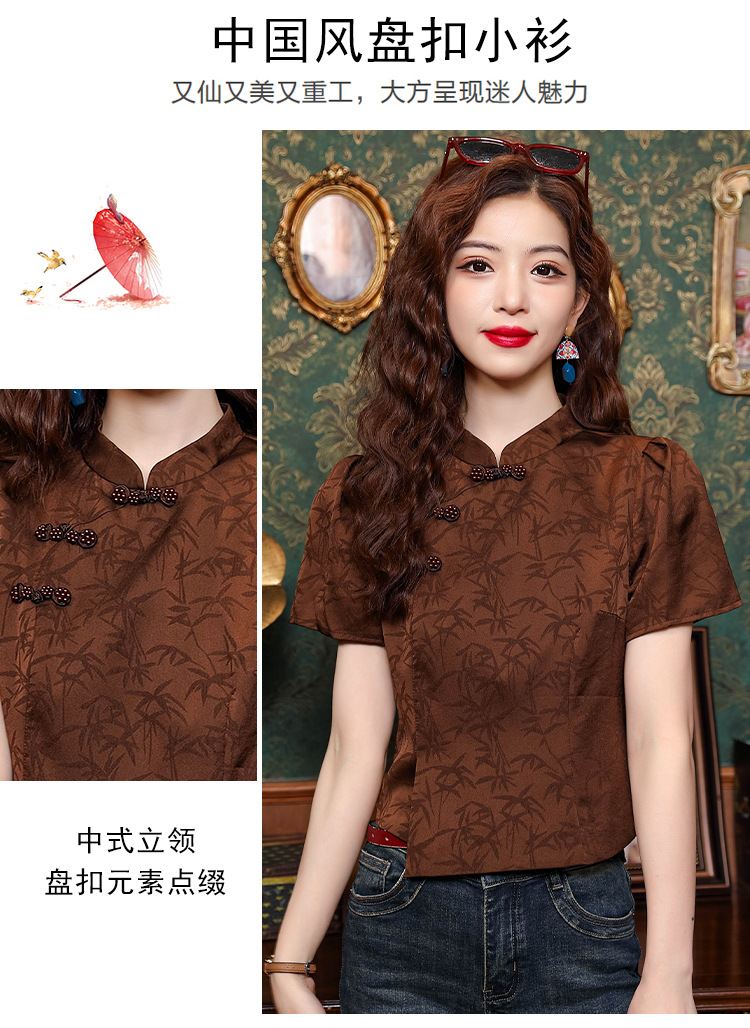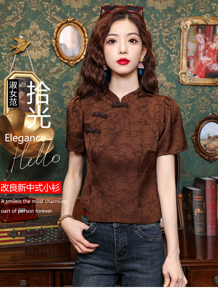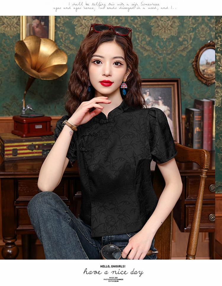 새로운 중국 스타일 국가 스타일 버클 셔츠 여성의 개선 된 청삼 여름 새로운 세련된 독특한 짧은 인쇄 짧은 소매 탑스토어 가기
