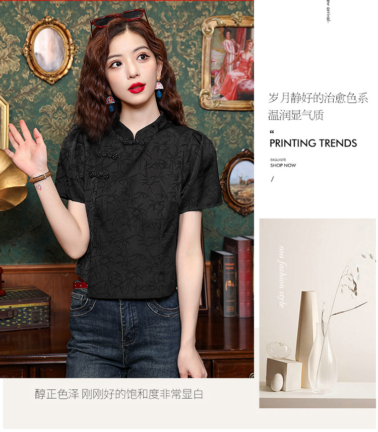 새로운 중국 스타일 국가 스타일 버클 셔츠 여성의 개선 된 청삼 여름 새로운 세련된 독특한 짧은 인쇄 짧은 소매 탑