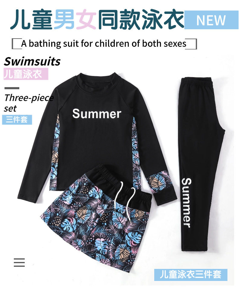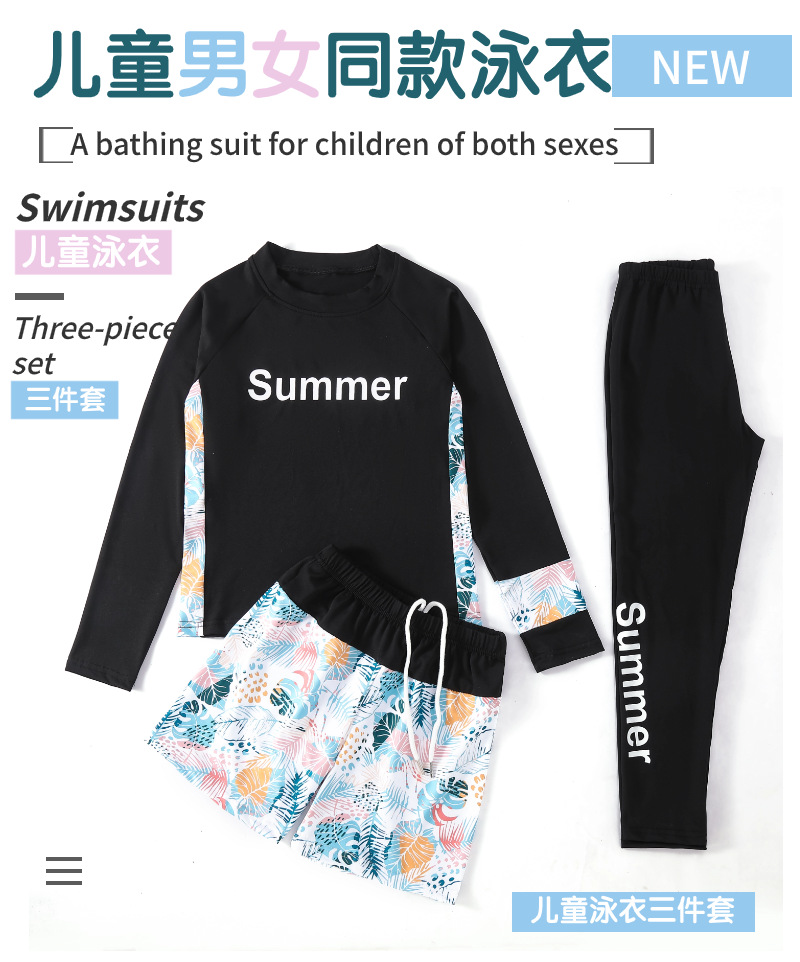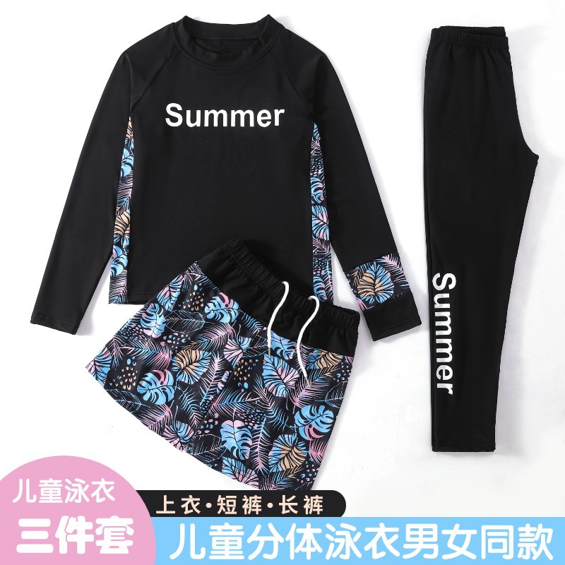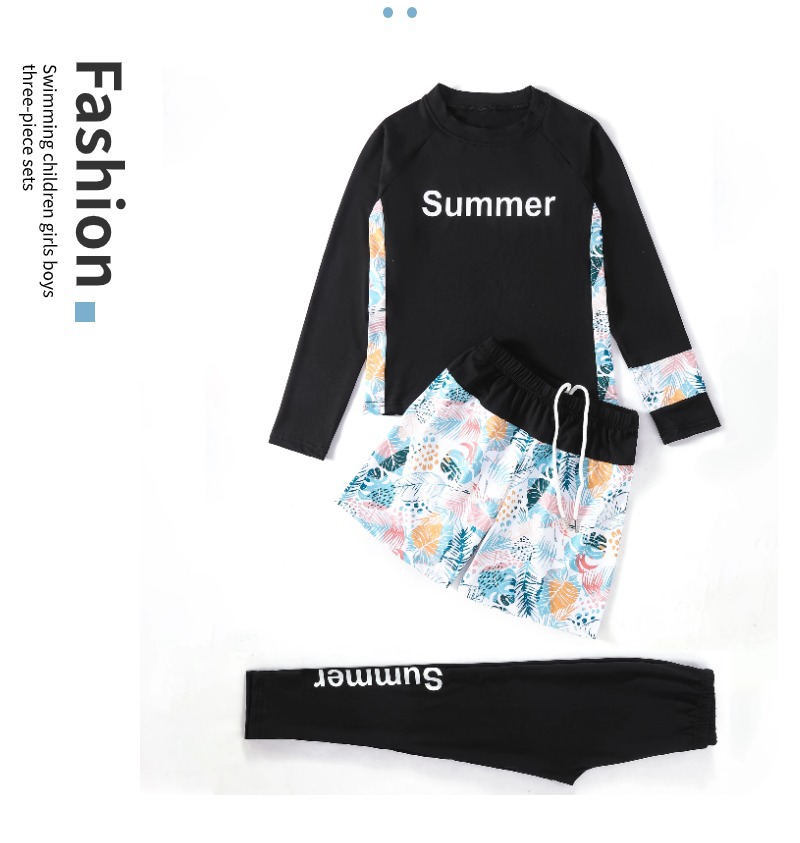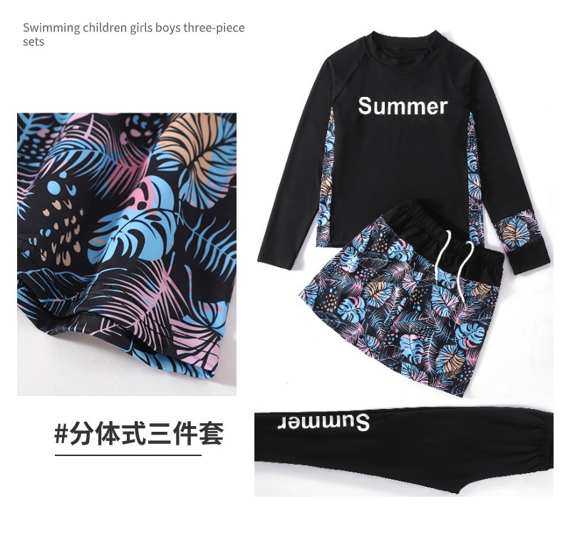 어린이 새로운 소형, 중 및 대형 어린이 긴팔 트렁크 수영복 여성 및 남성 학생을위한 썬 스크린 분할 수영복 여름용 온천 3 피스 세트