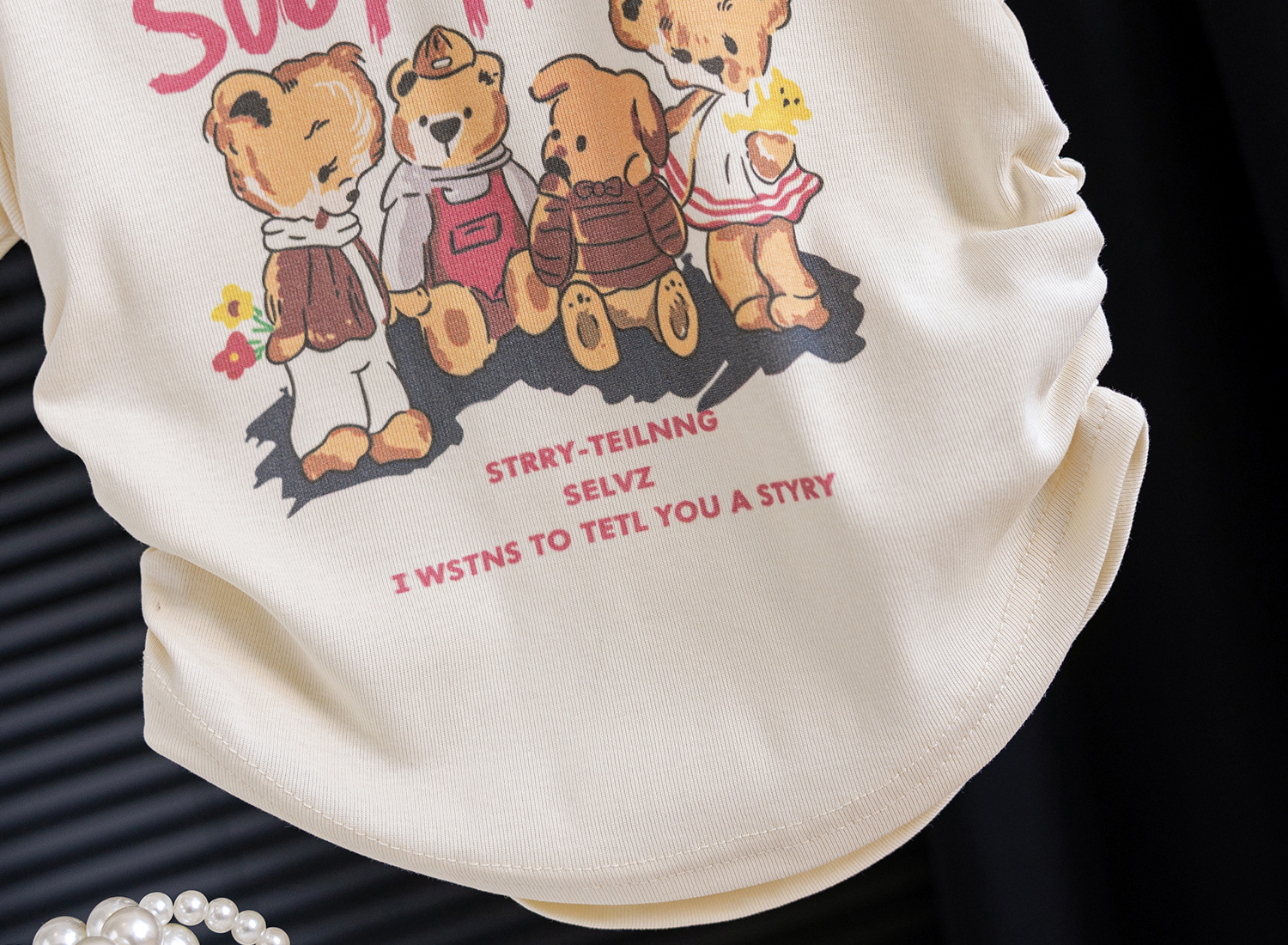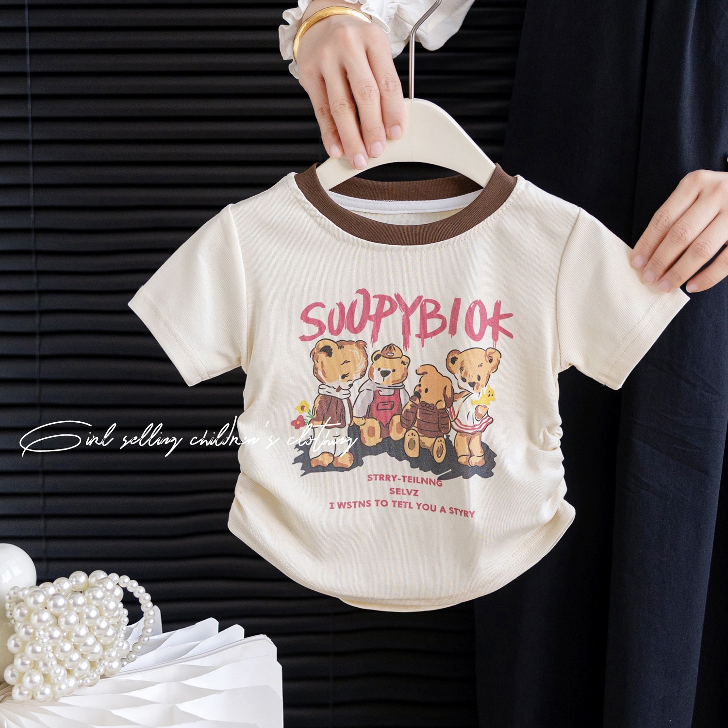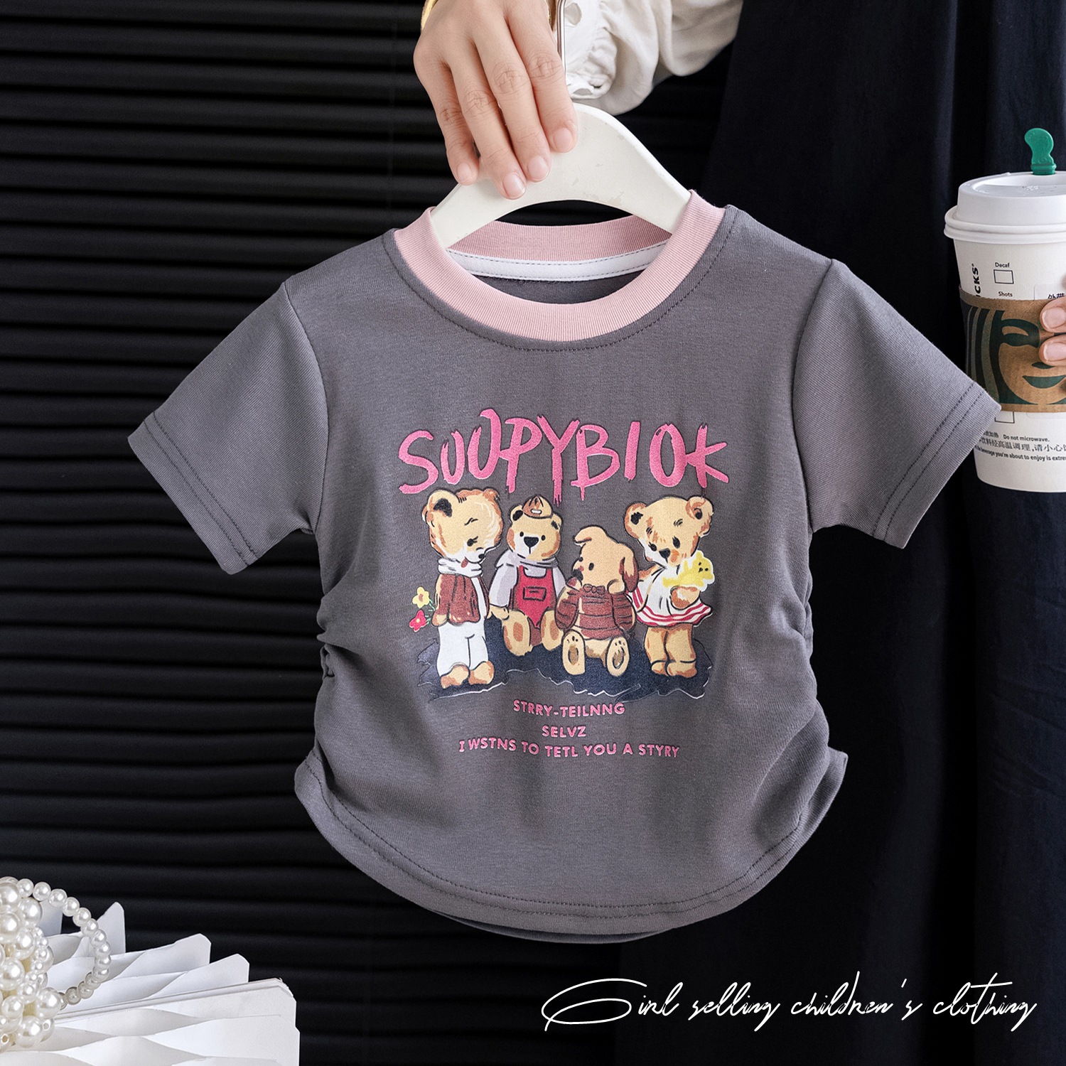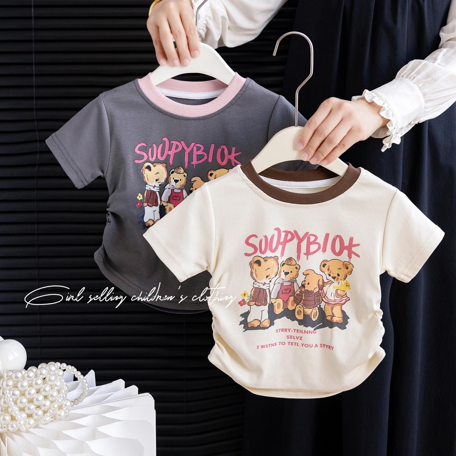 2024 소녀의 새로운 여름 한국 스타일 올 매치 유치한 스타일 4 곰 인쇄 러플 반팔 사이버 인기 티셔츠 트렌디스토어 가기