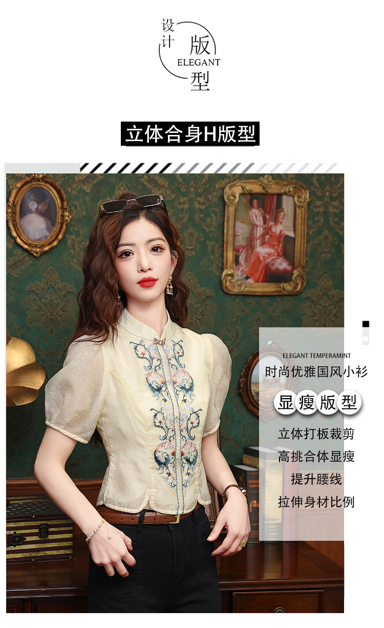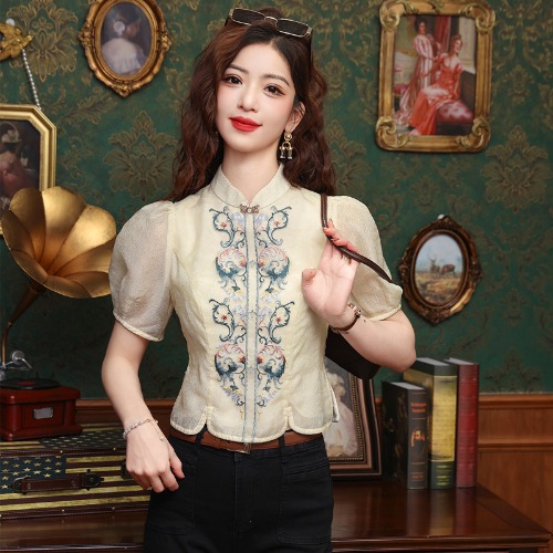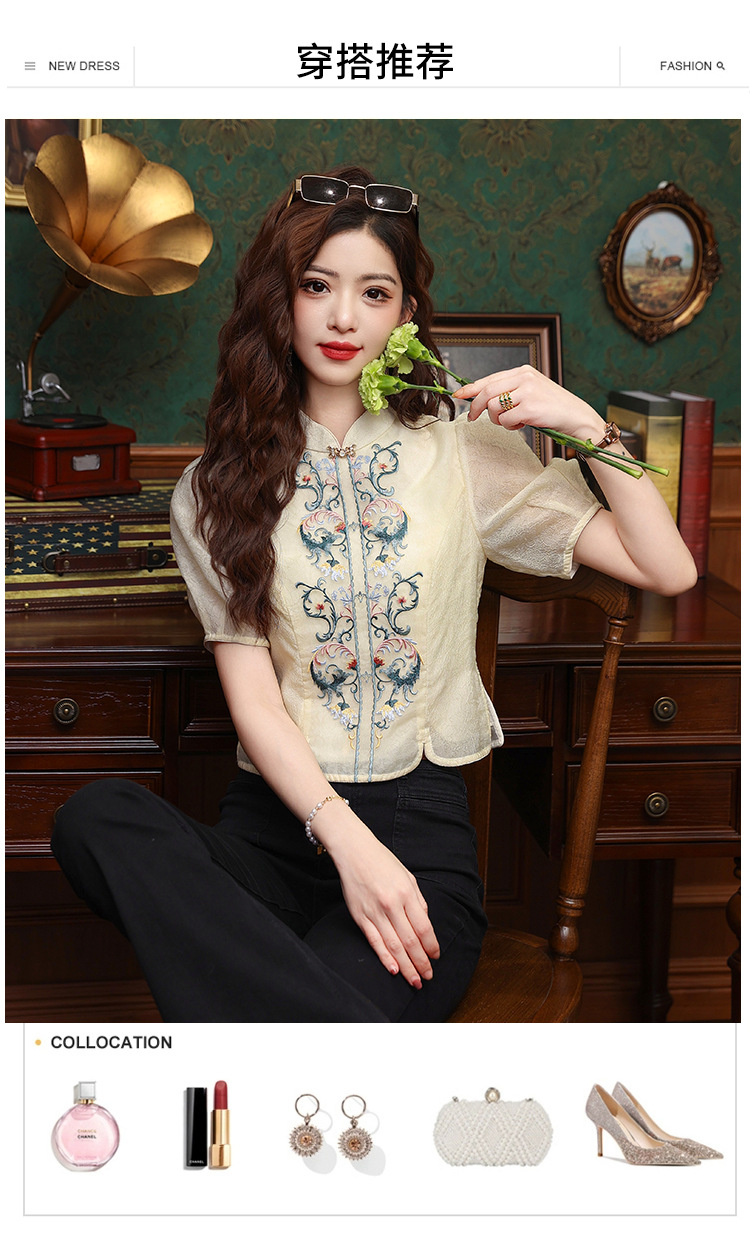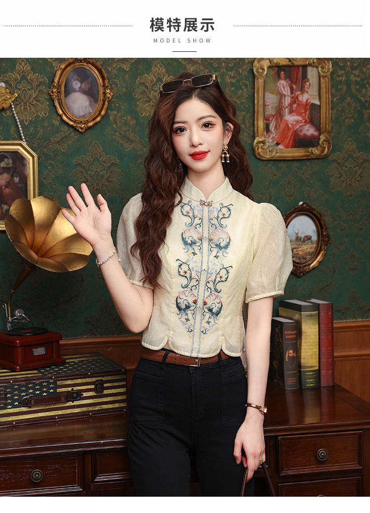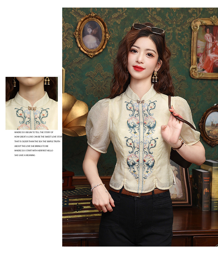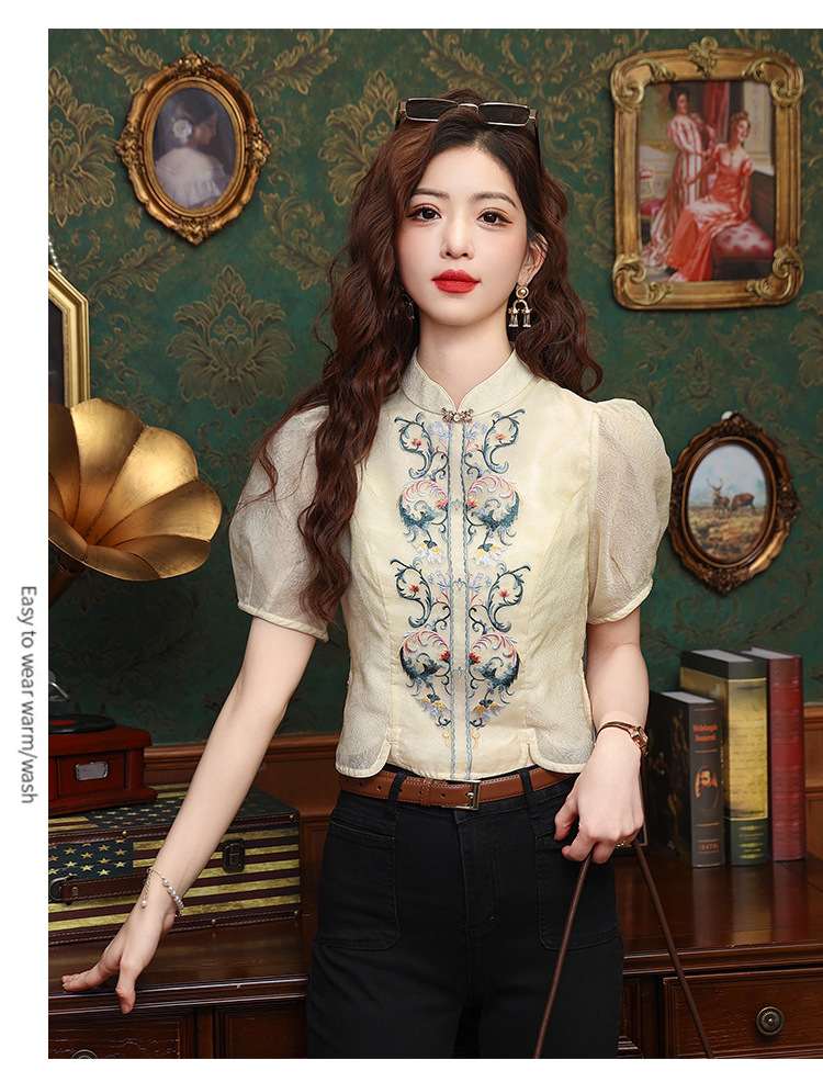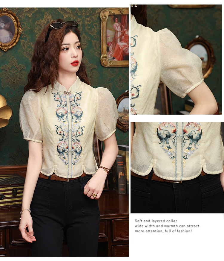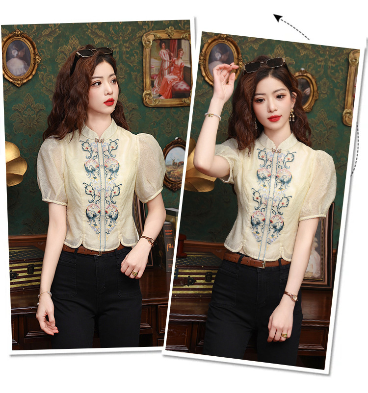 새로운 중국 스타일 수직 칼라 자수 반팔 셔츠 여성의 2024 여름 원피스 디자인 센스 국가 스타일 버클 빅 버블 슬리브 탑스토어 가기