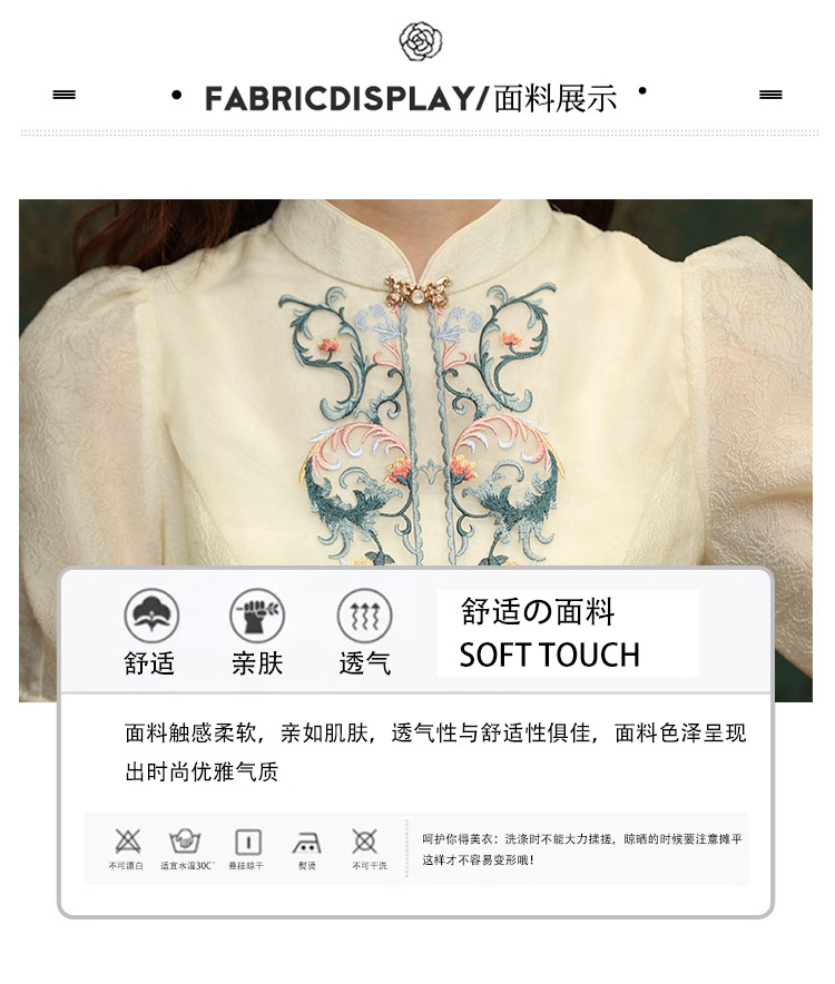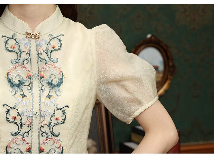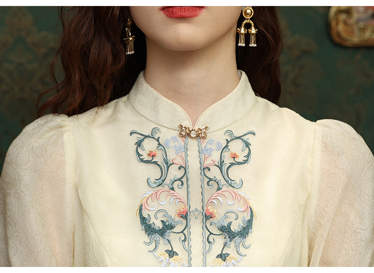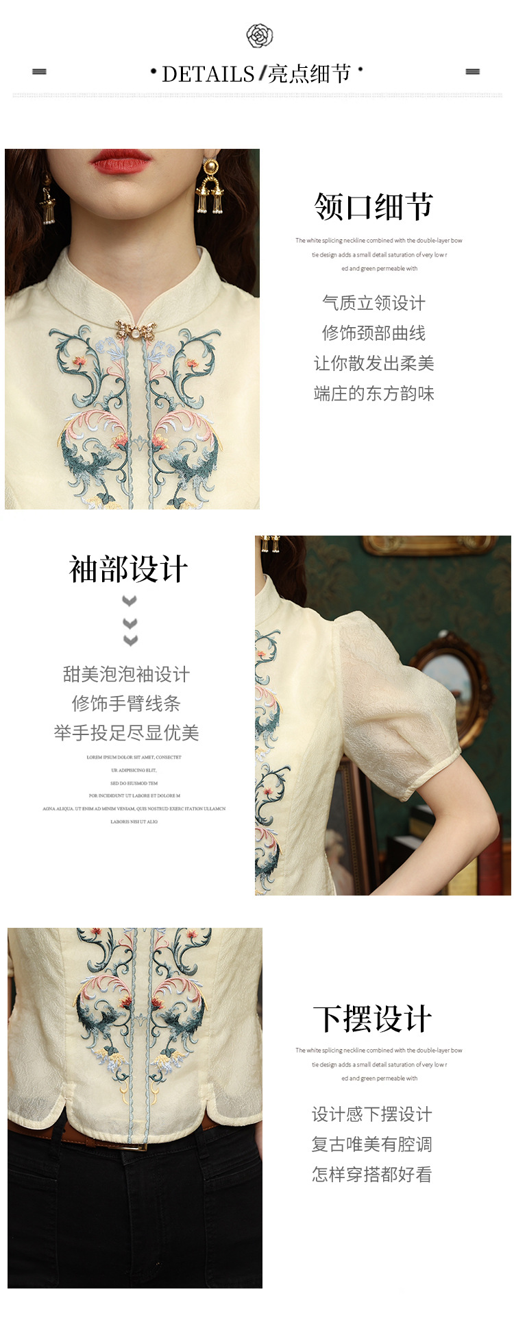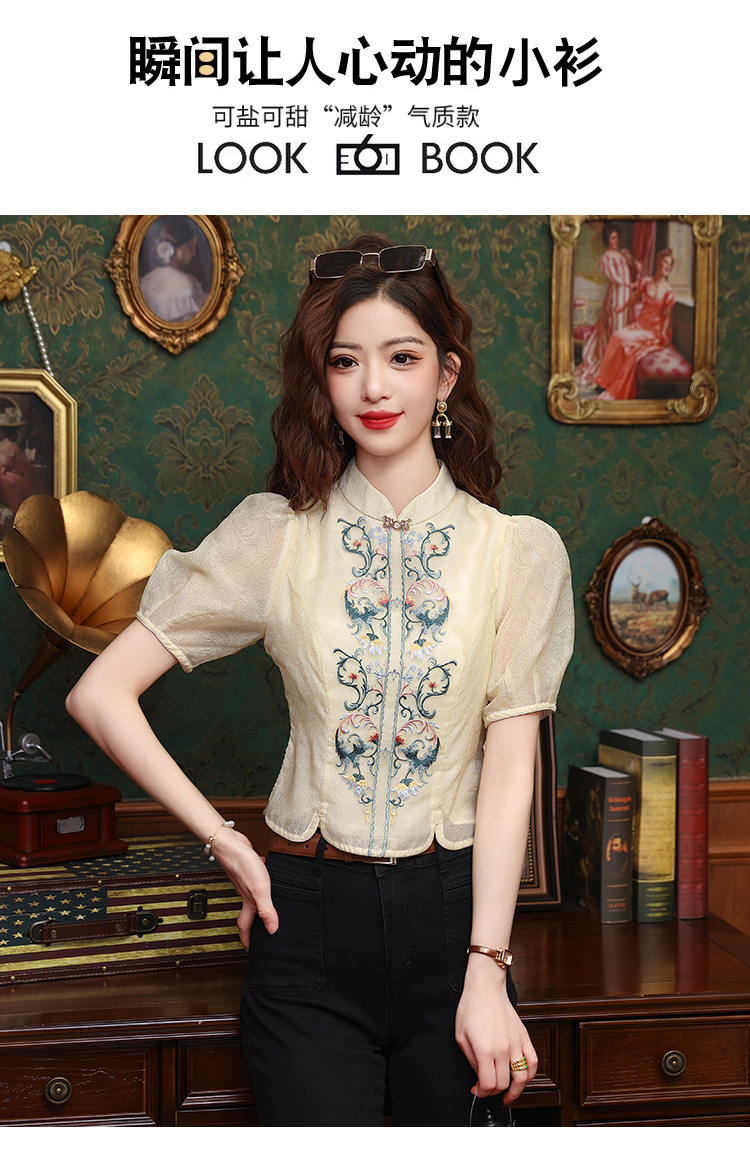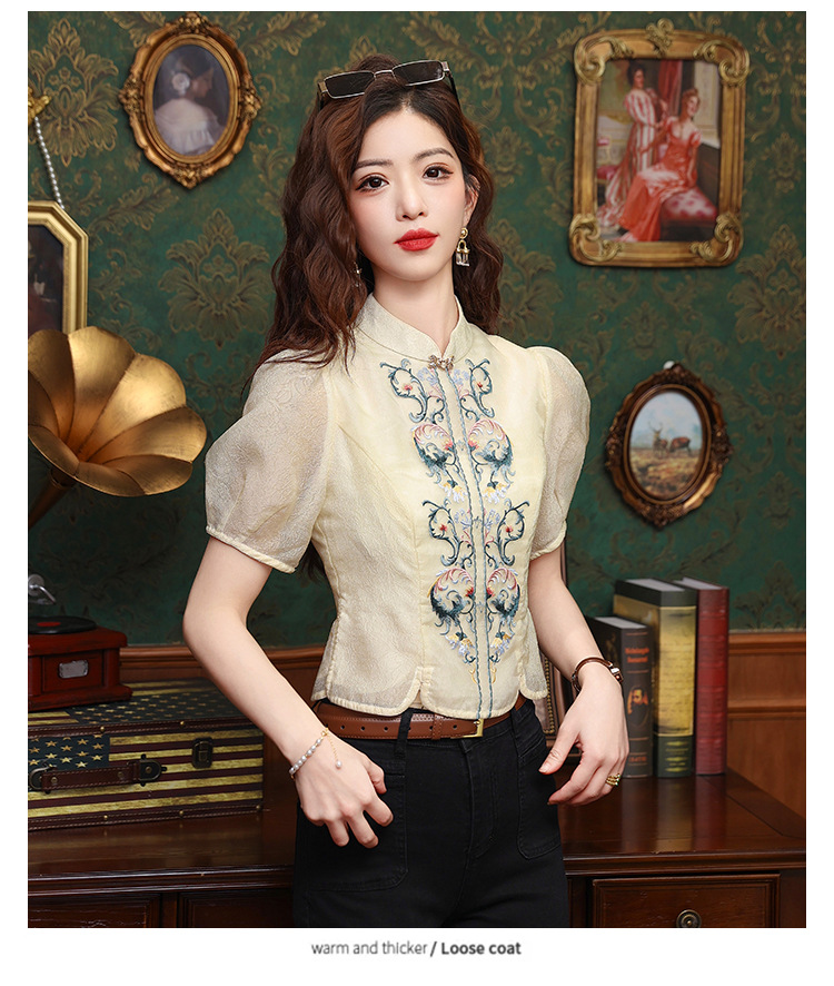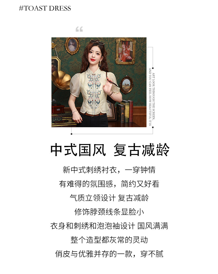 새로운 중국 스타일 수직 칼라 자수 반팔 셔츠 여성의 2024 여름 원피스 디자인 센스 국가 스타일 버클 빅 버블 슬리브 탑스토어 가기