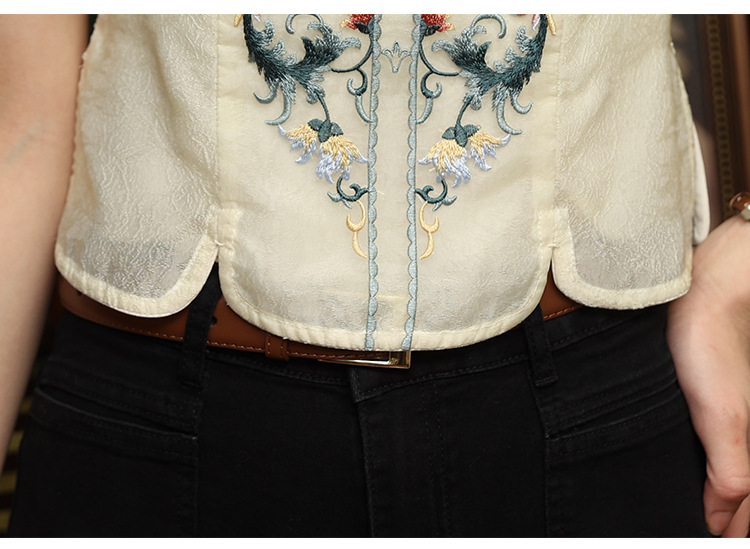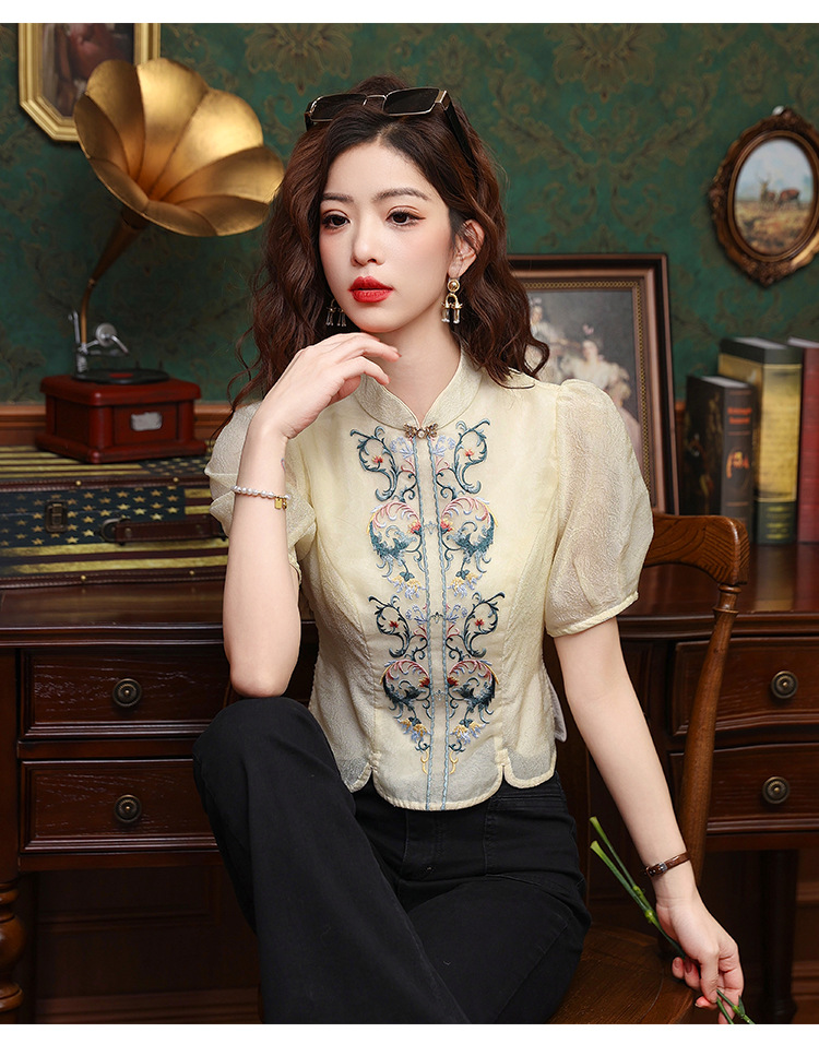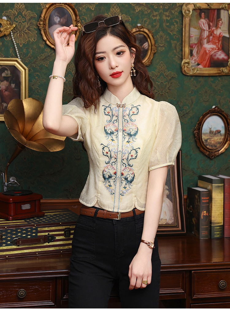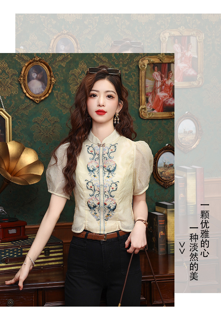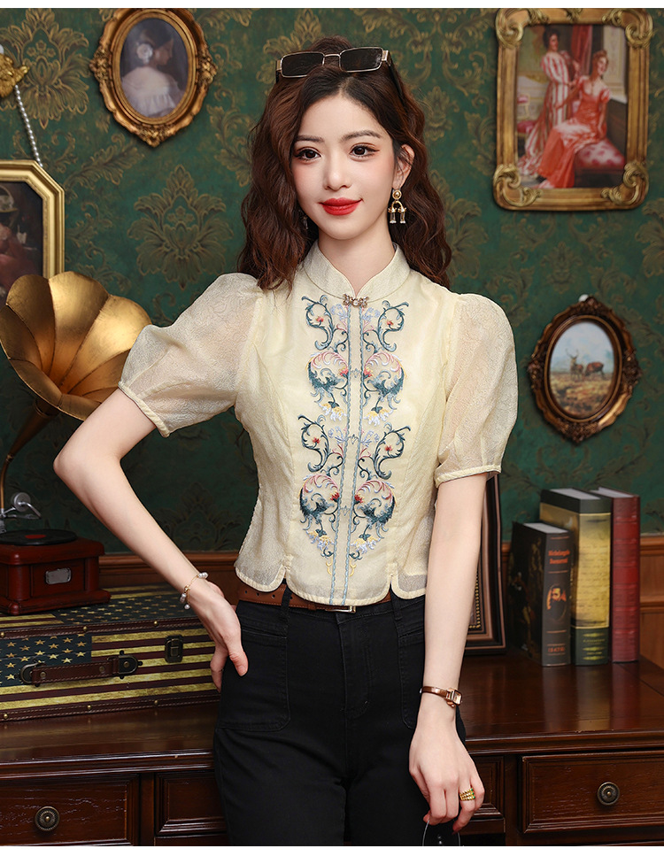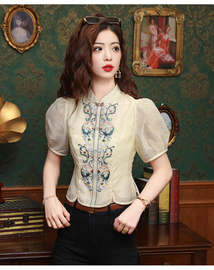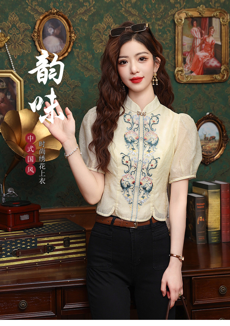 새로운 중국 스타일 수직 칼라 자수 반팔 셔츠 여성의 2024 여름 원피스 디자인 센스 국가 스타일 버클 빅 버블 슬리브 탑