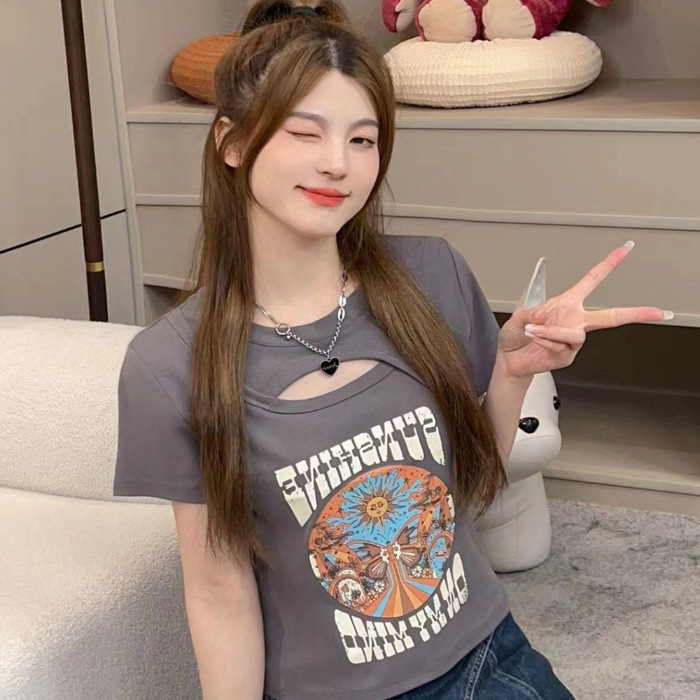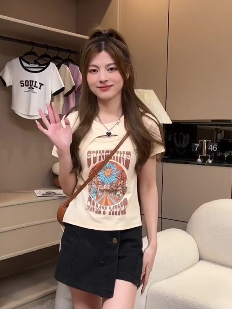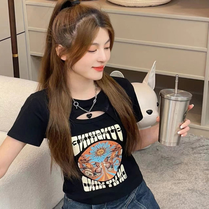 D07 # 대형 여성 2024 여름 새로운 미국 슬림 웨스턴 스타일 최고 지방 mm 작은 어깨 짧은 소매 티셔츠스토어 가기