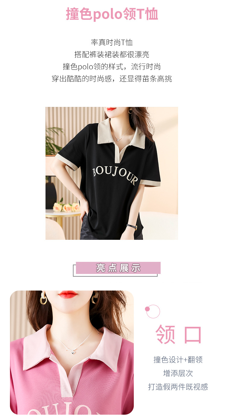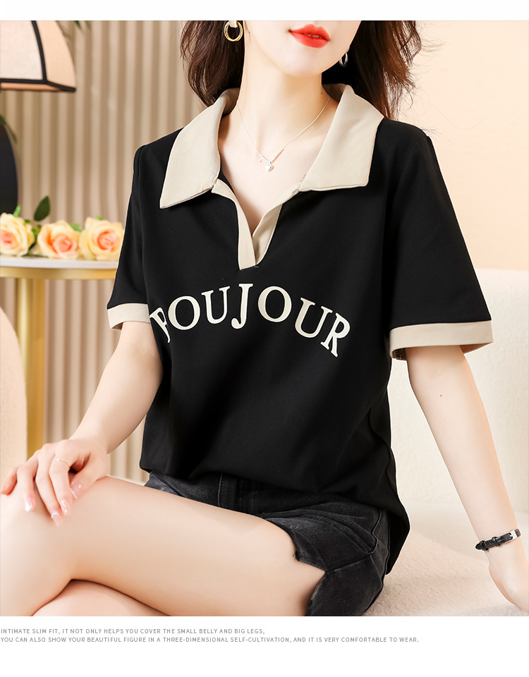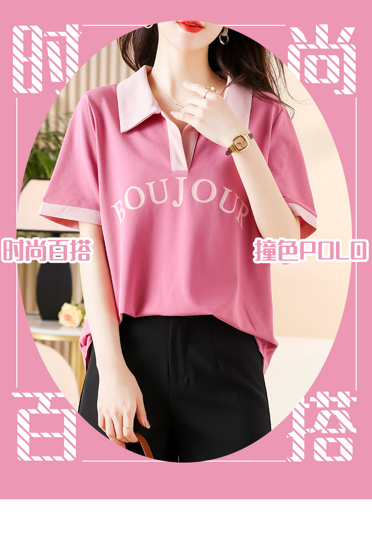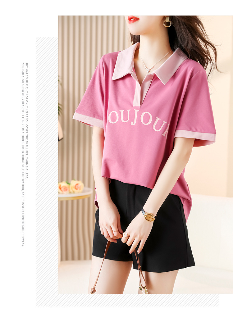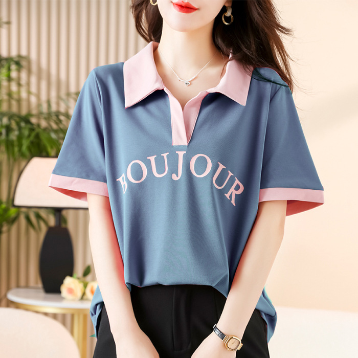 D08 # 뚱뚱한 자매 폴로 셔츠 큰 크기 여성의 2024 여름 느슨한 슬림 대비 컬러 어깨 티셔츠의 새로운 한국어 버전