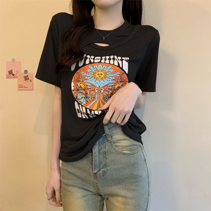 D07 # 대형 여성 2024 여름 새로운 미국 슬림 웨스턴 스타일 최고 지방 mm 작은 어깨 짧은 소매 티셔츠