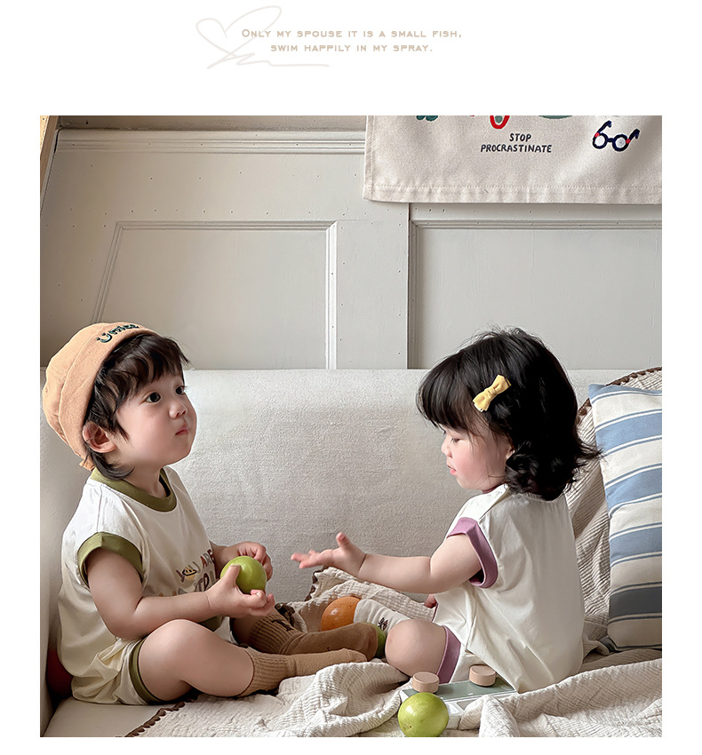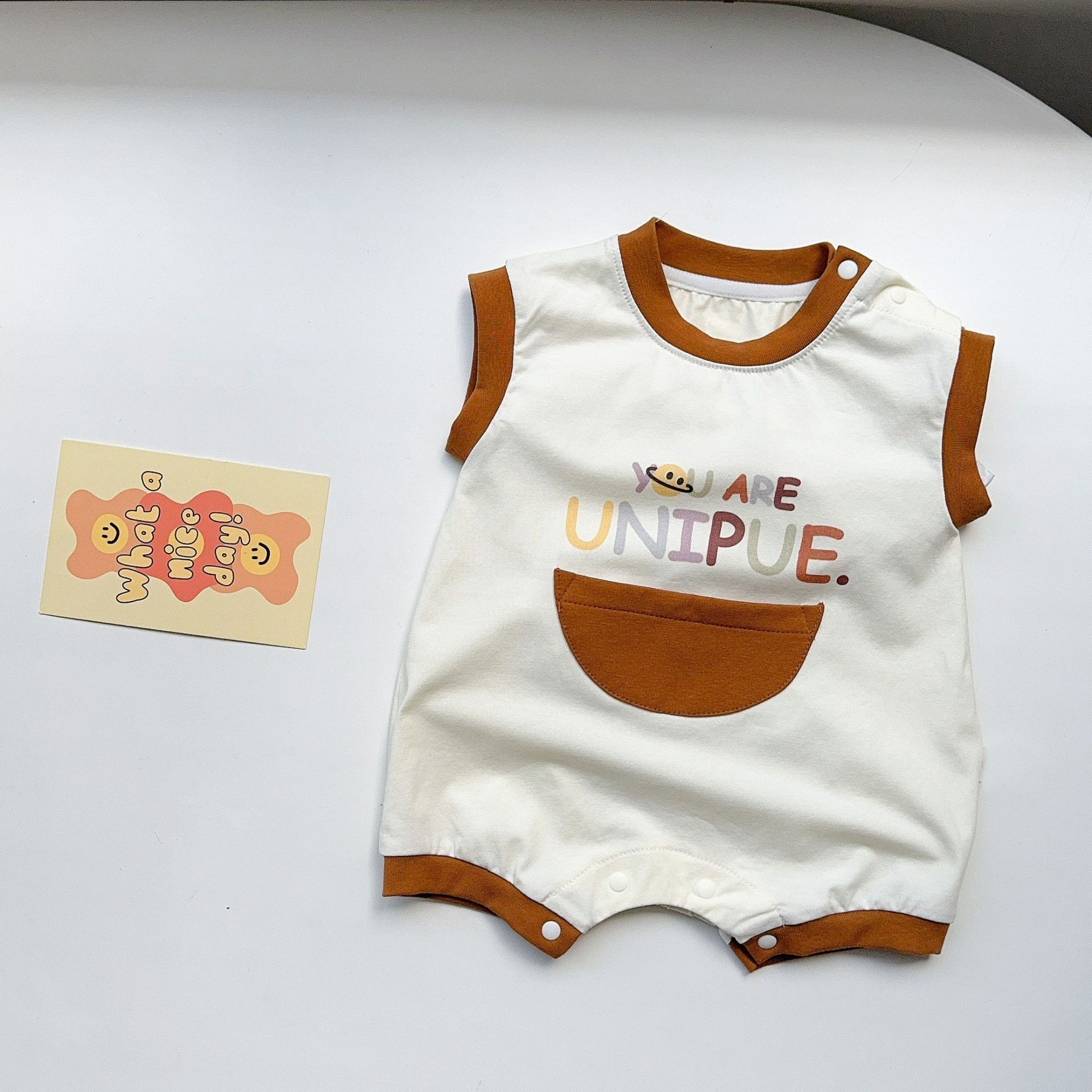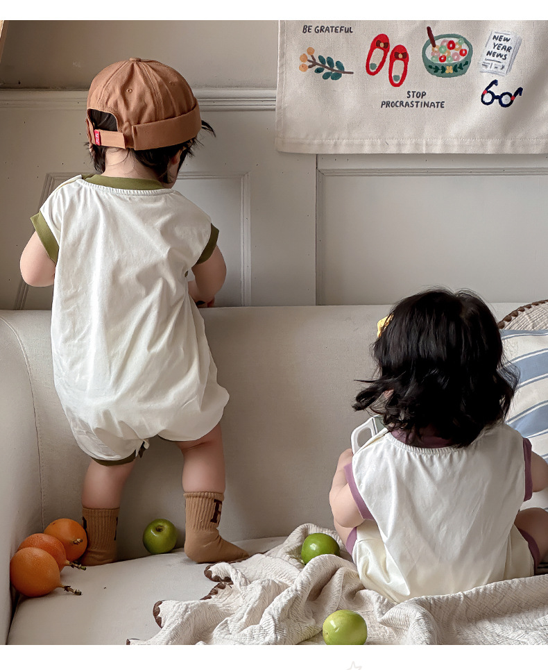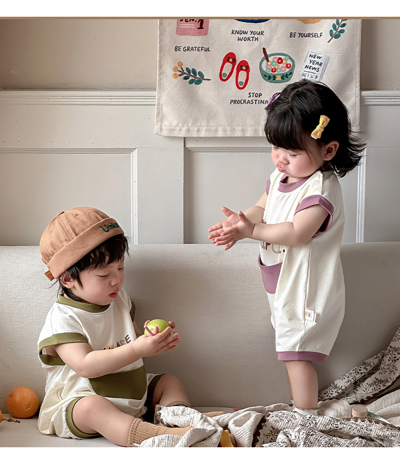 2024 여름 남녀 아기용 크롤링복 도파민 만화 인스 스타일 배색 레터 포켓 아기옷 반팔