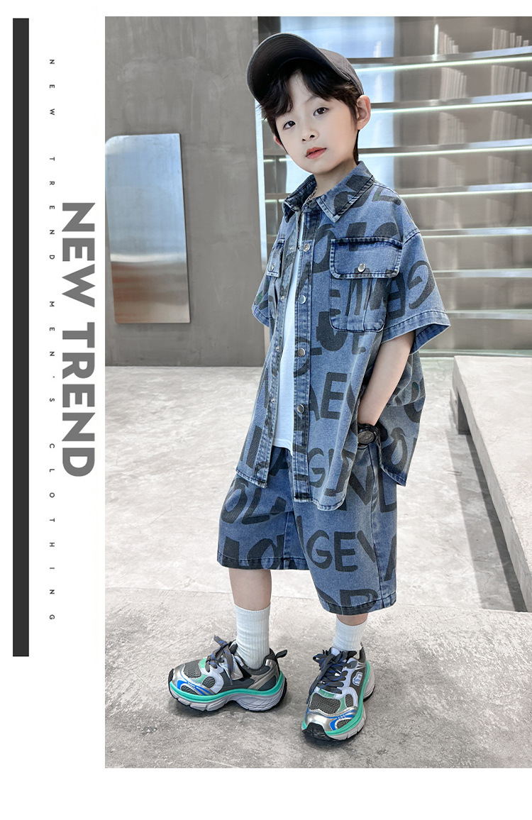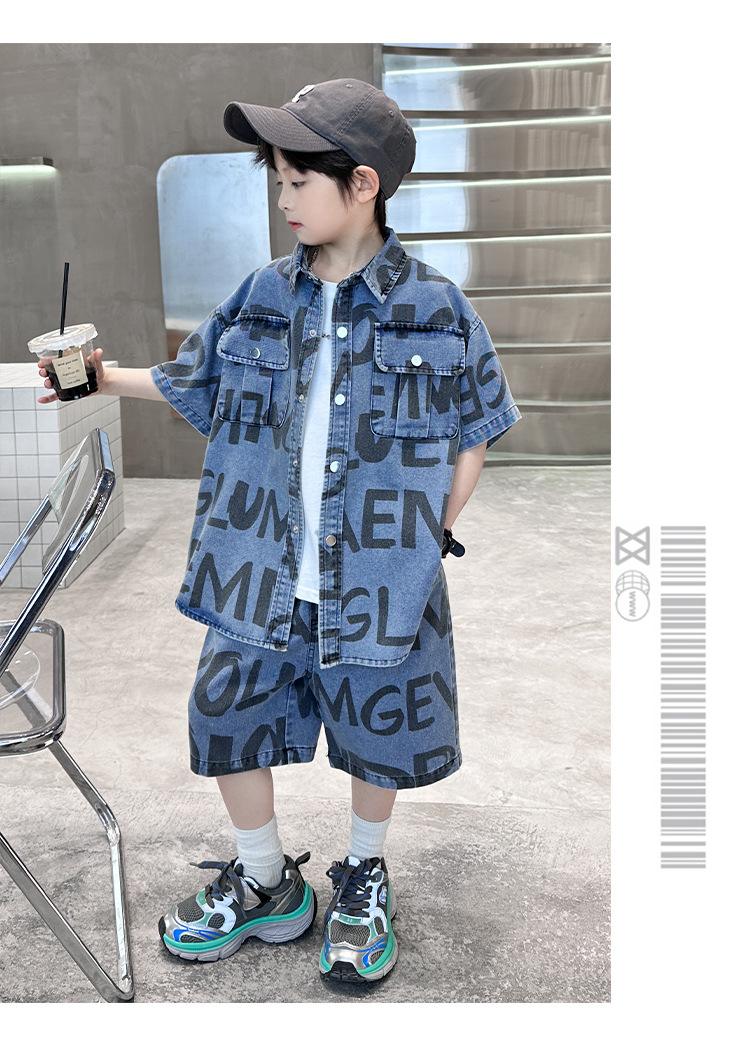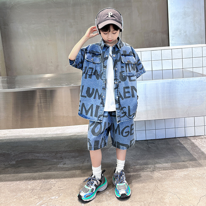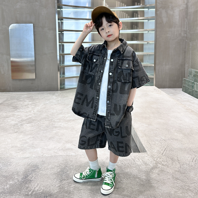 어린이 착용 세트 2024 여름 소년 데님 인쇄 반팔 셔츠 투피스 한국 스타일 트렌디 세트스토어 가기
