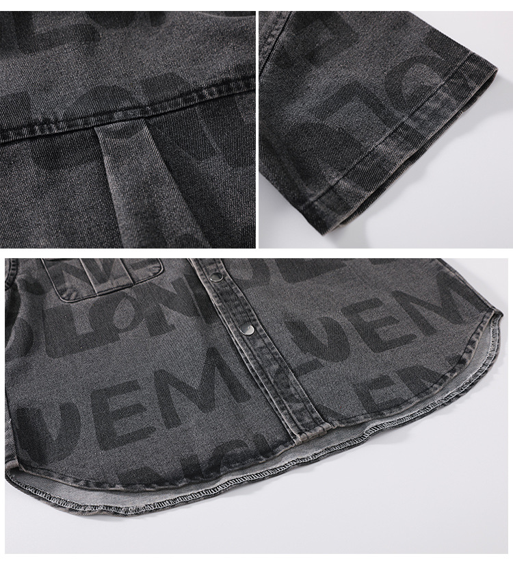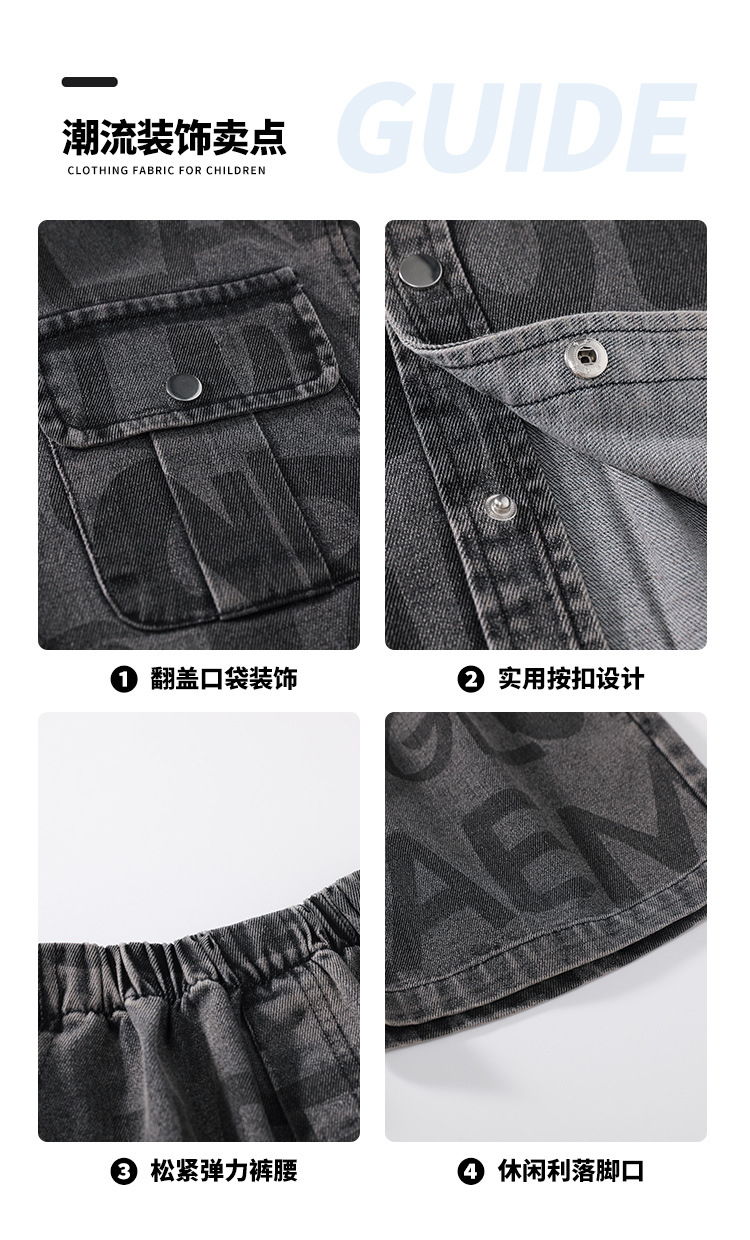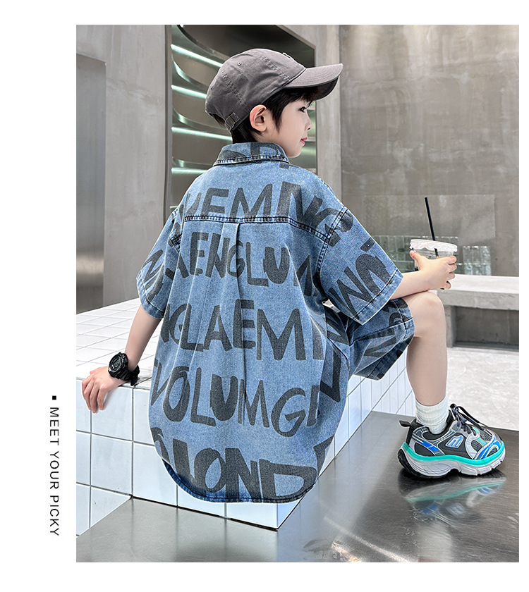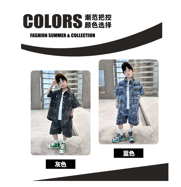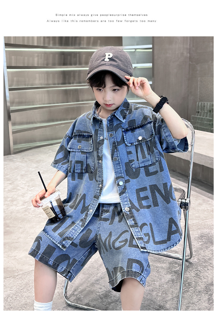 어린이 착용 세트 2024 여름 소년 데님 인쇄 반팔 셔츠 투피스 한국 스타일 트렌디 세트스토어 가기