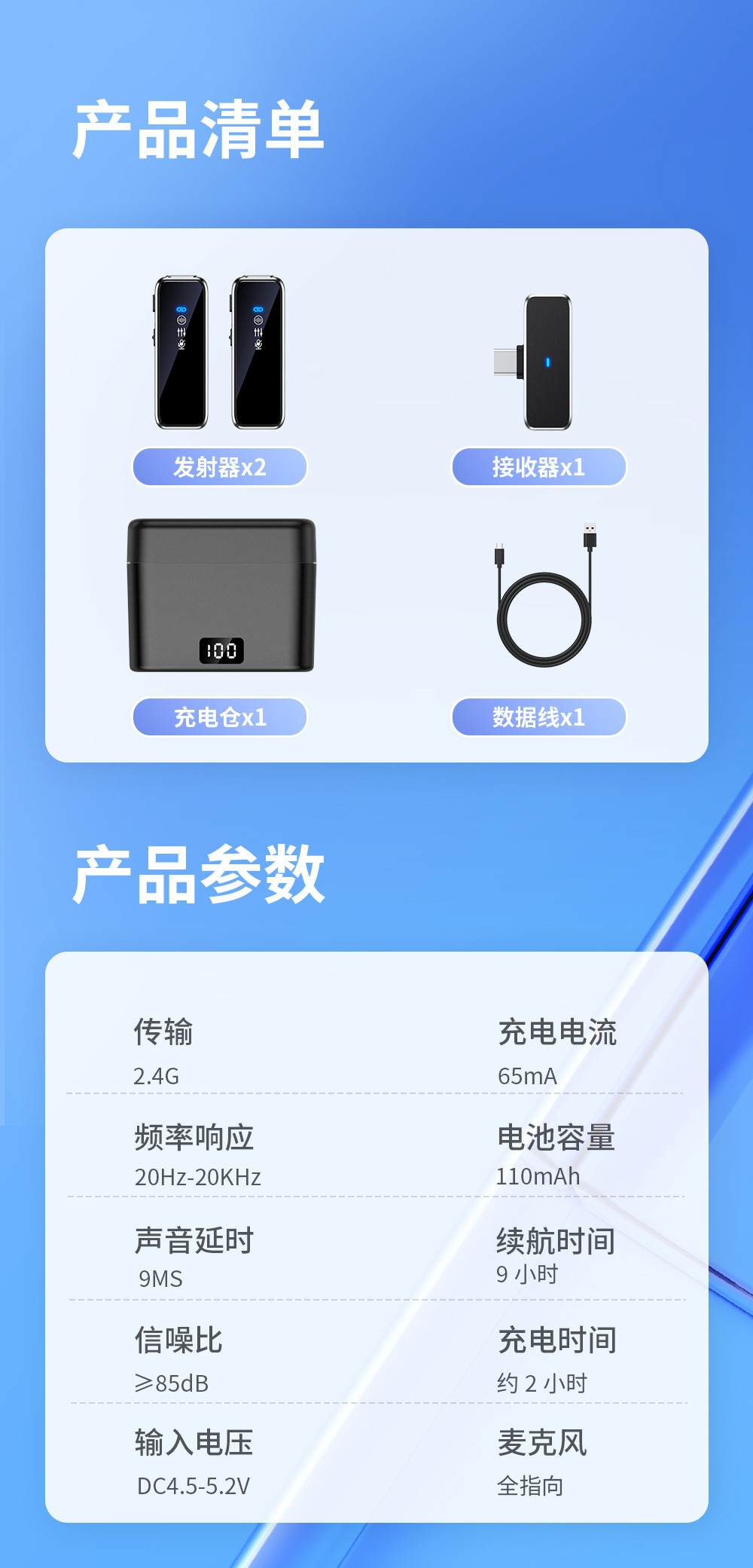 | 重量 | 发射器:10克×2 接收器:5克 充电仓:55克 |