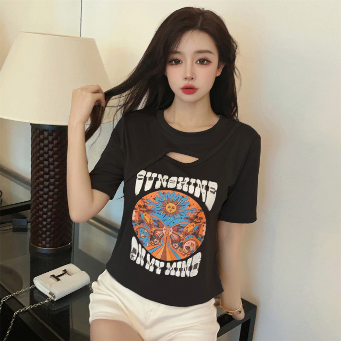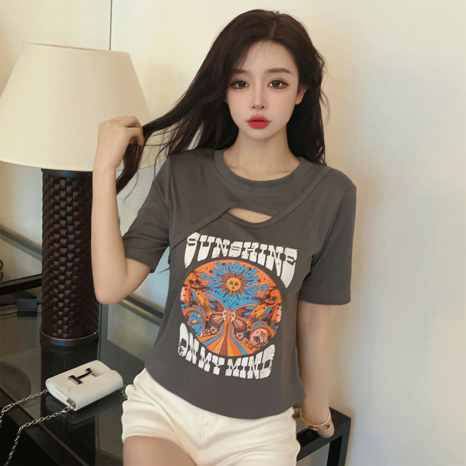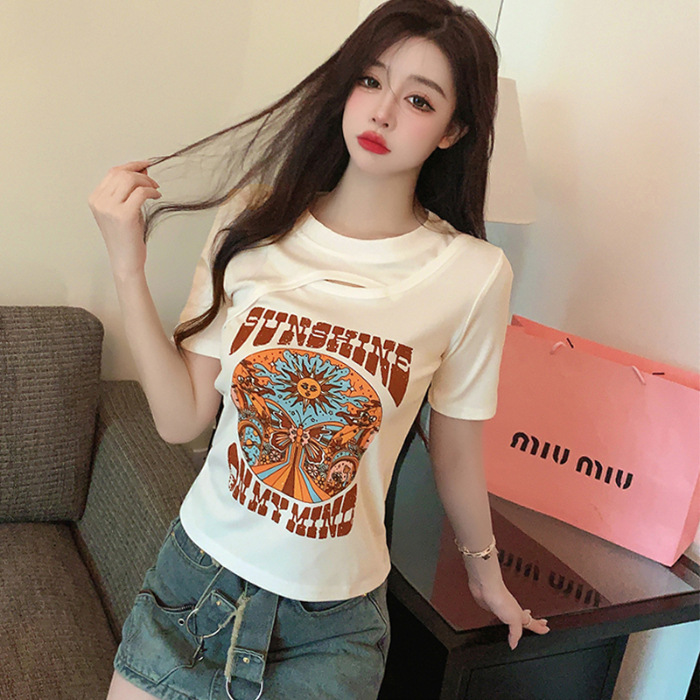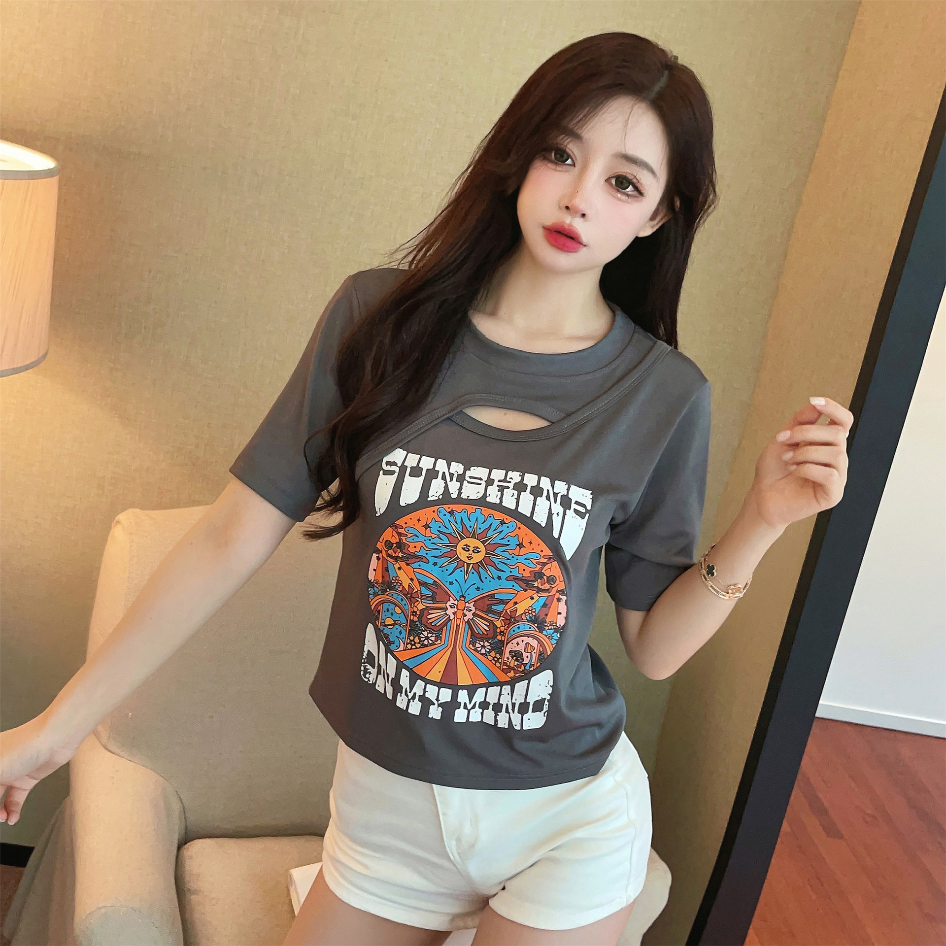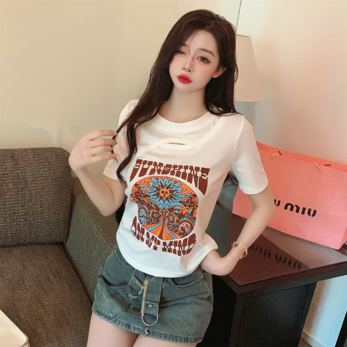 D07 # 대형 여성 2024 여름 새로운 미국 슬림 웨스턴 스타일 최고 지방 mm 작은 어깨 짧은 소매 티셔츠스토어 가기
