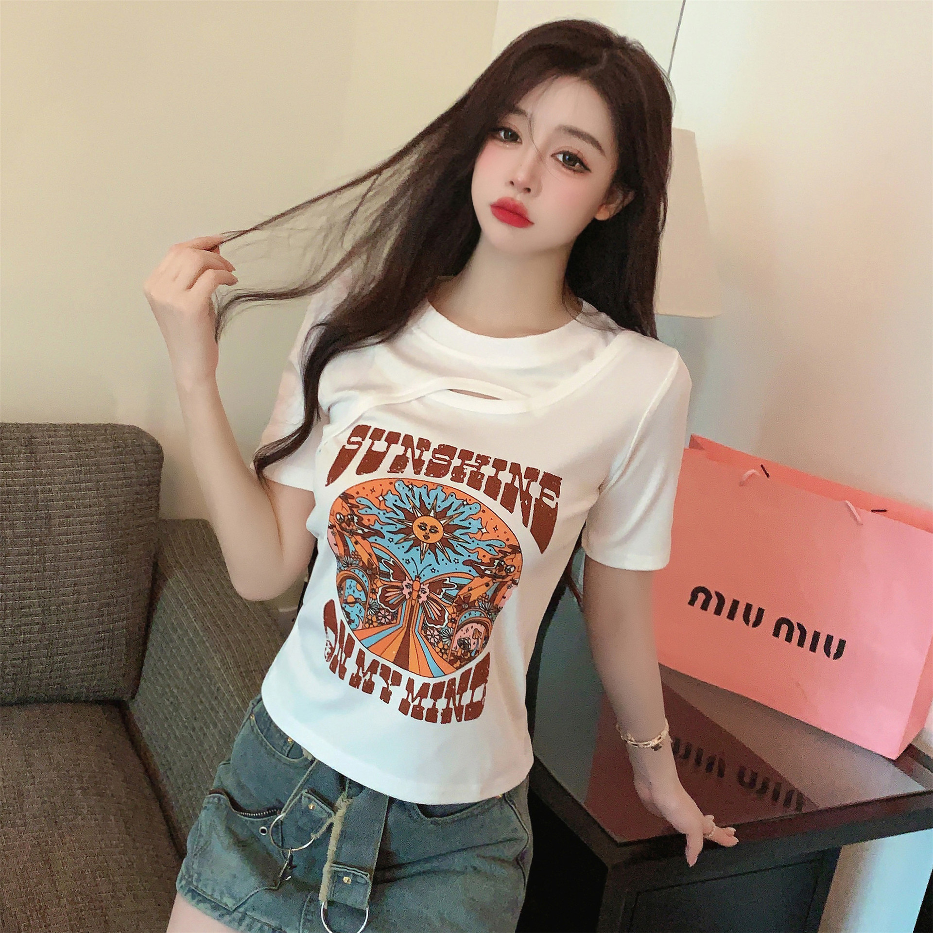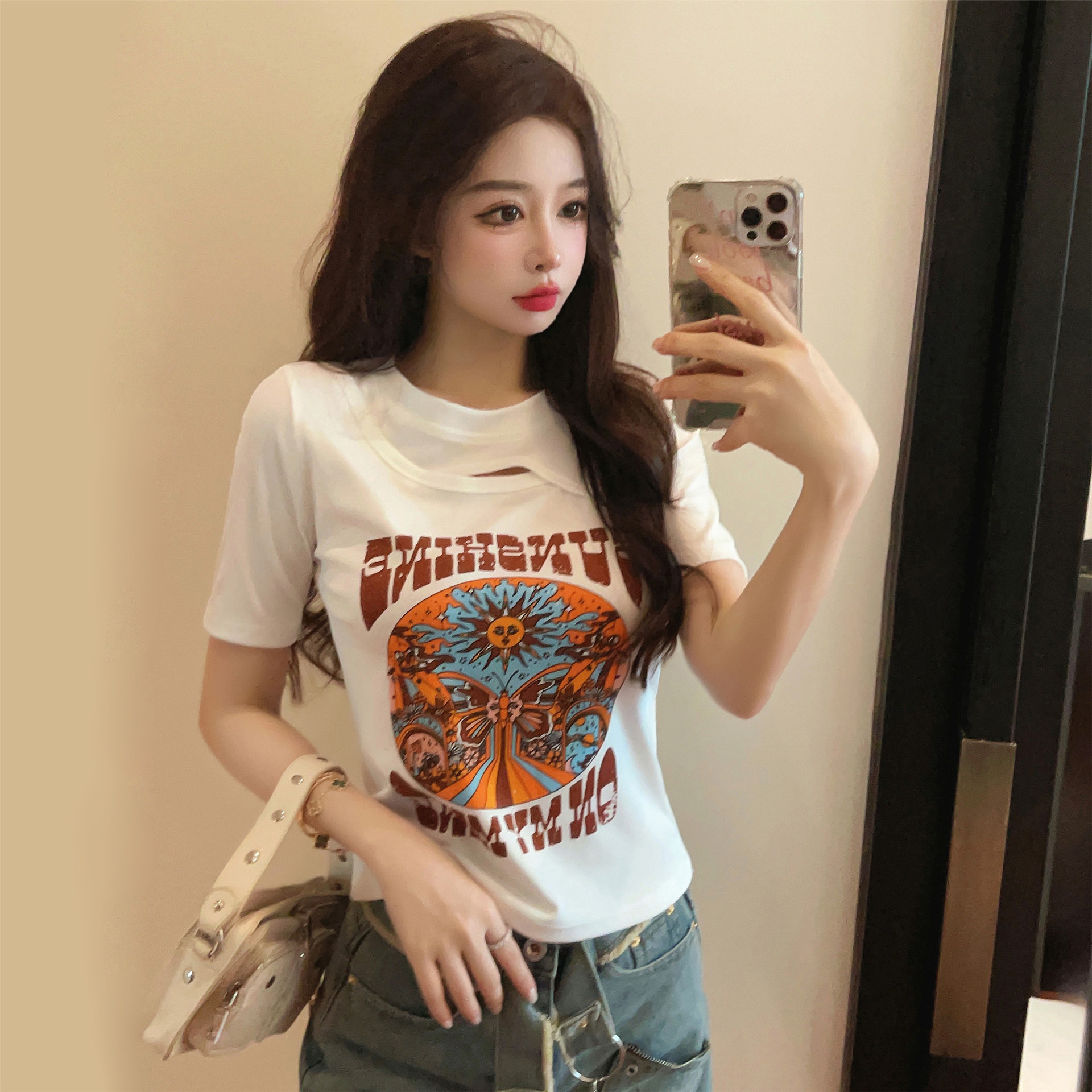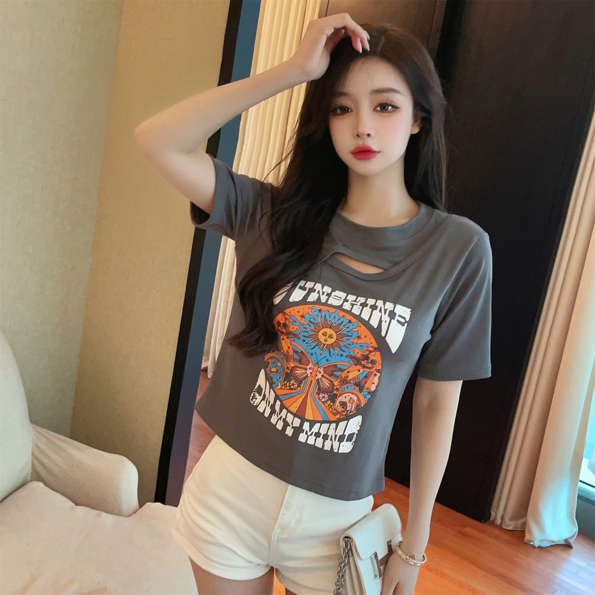 D07 # 대형 여성 2024 여름 새로운 미국 슬림 웨스턴 스타일 최고 지방 mm 작은 어깨 짧은 소매 티셔츠스토어 가기