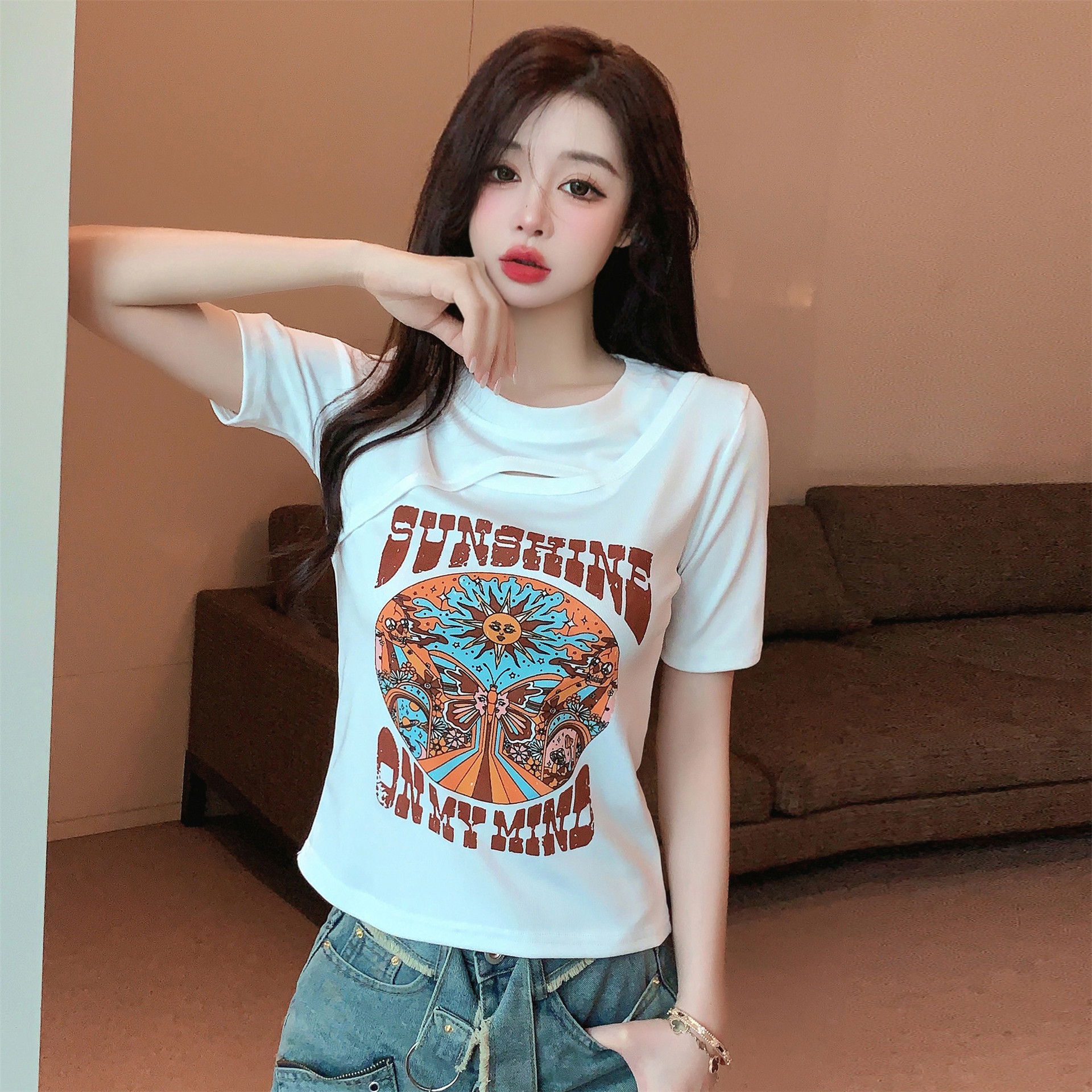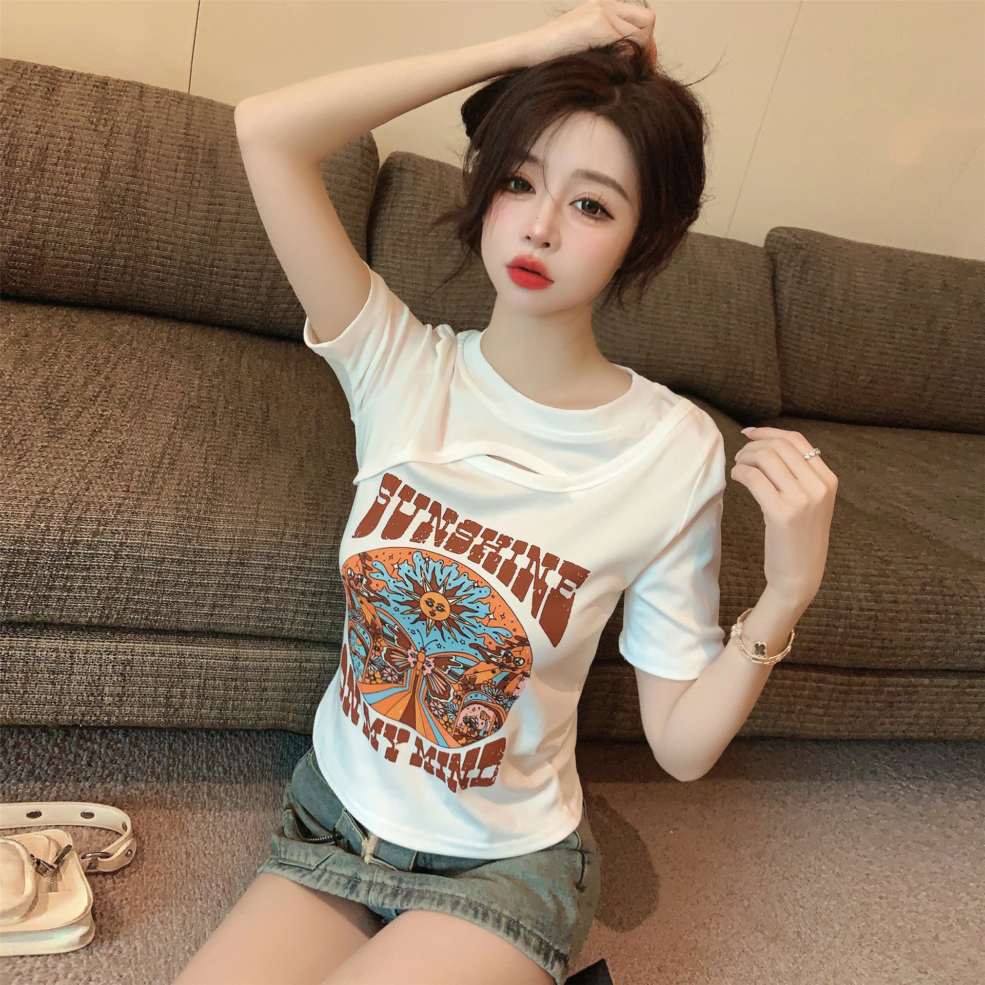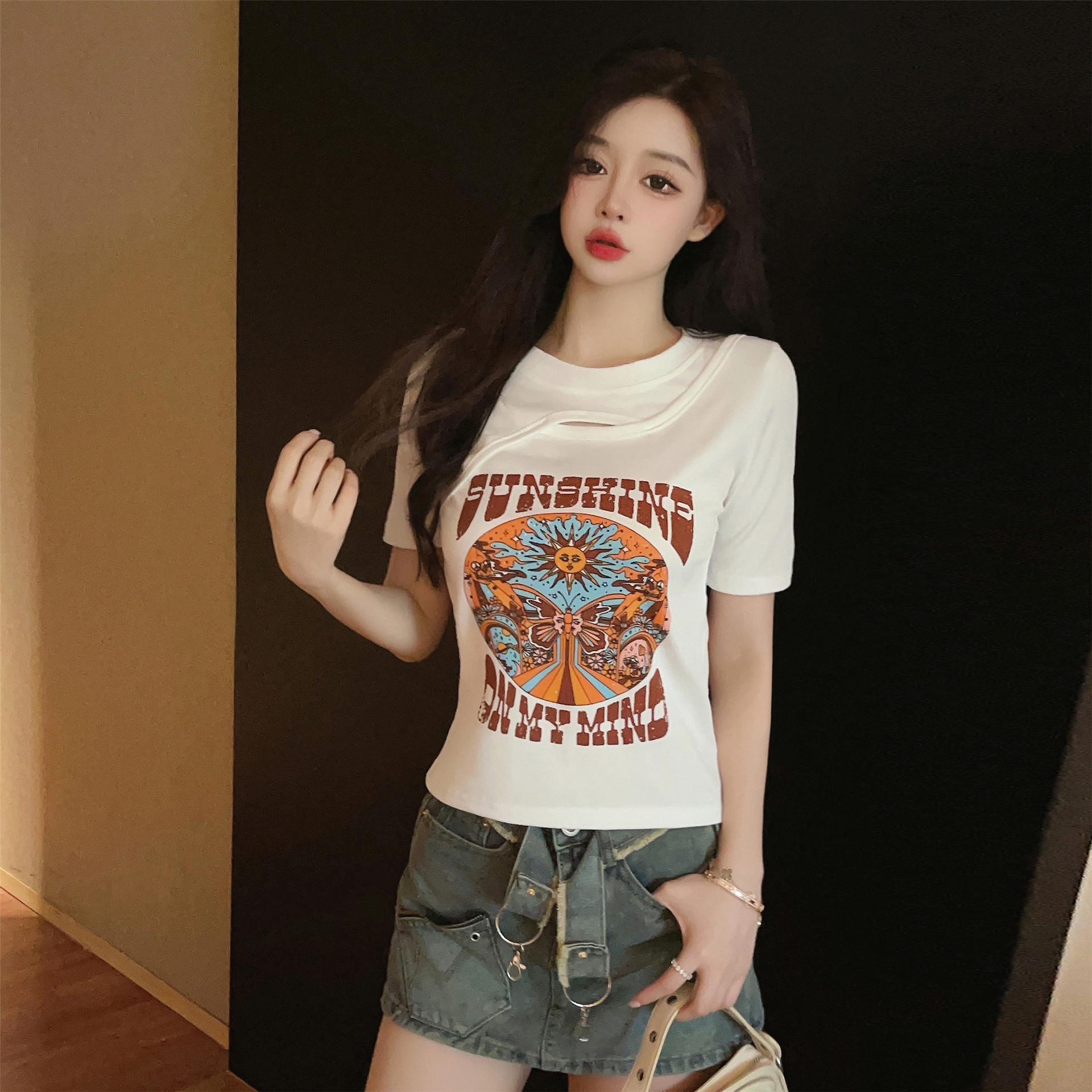 D07 # 대형 여성 2024 여름 새로운 미국 슬림 웨스턴 스타일 최고 지방 mm 작은 어깨 짧은 소매 티셔츠