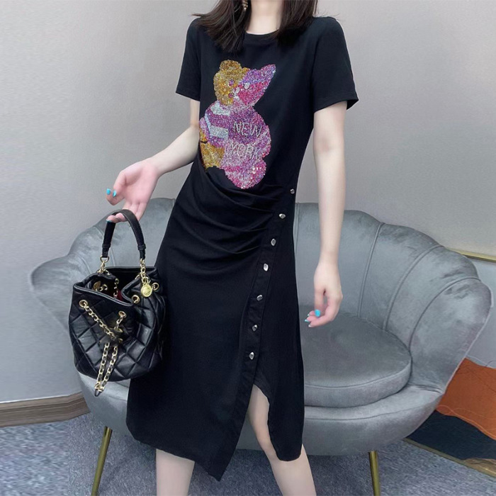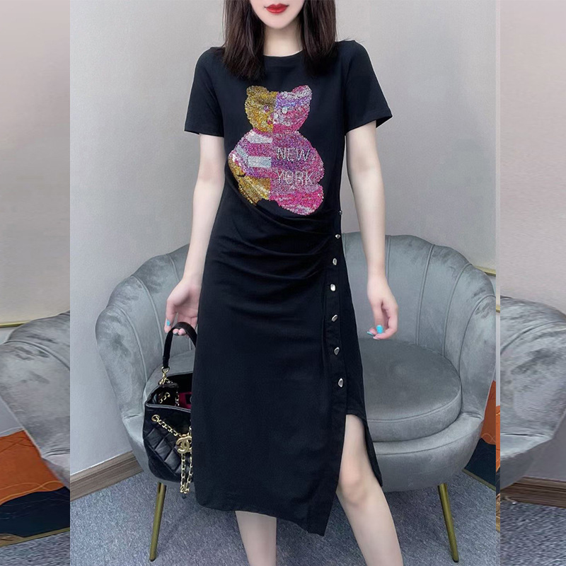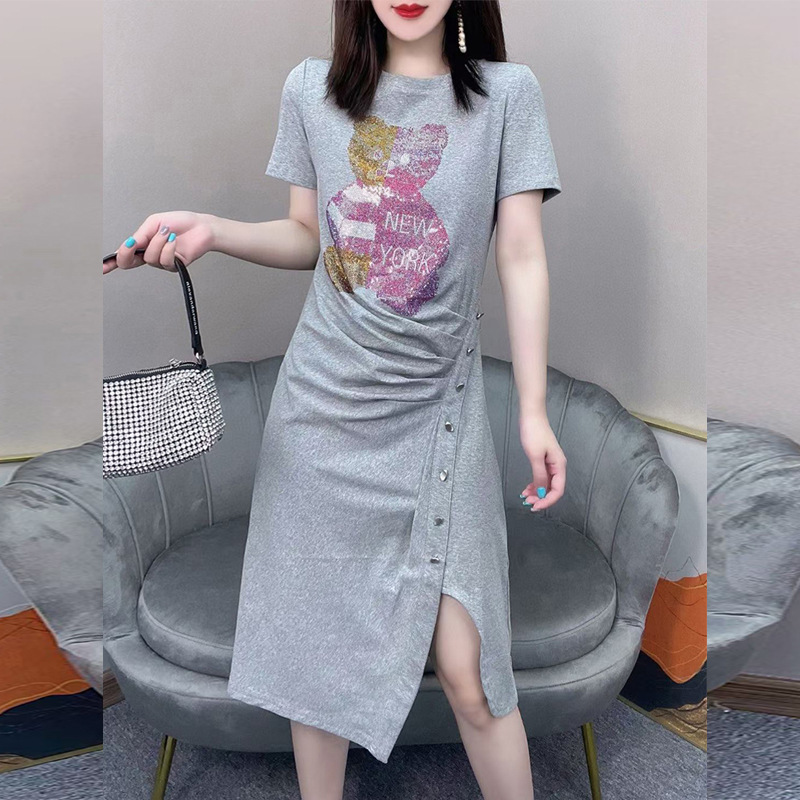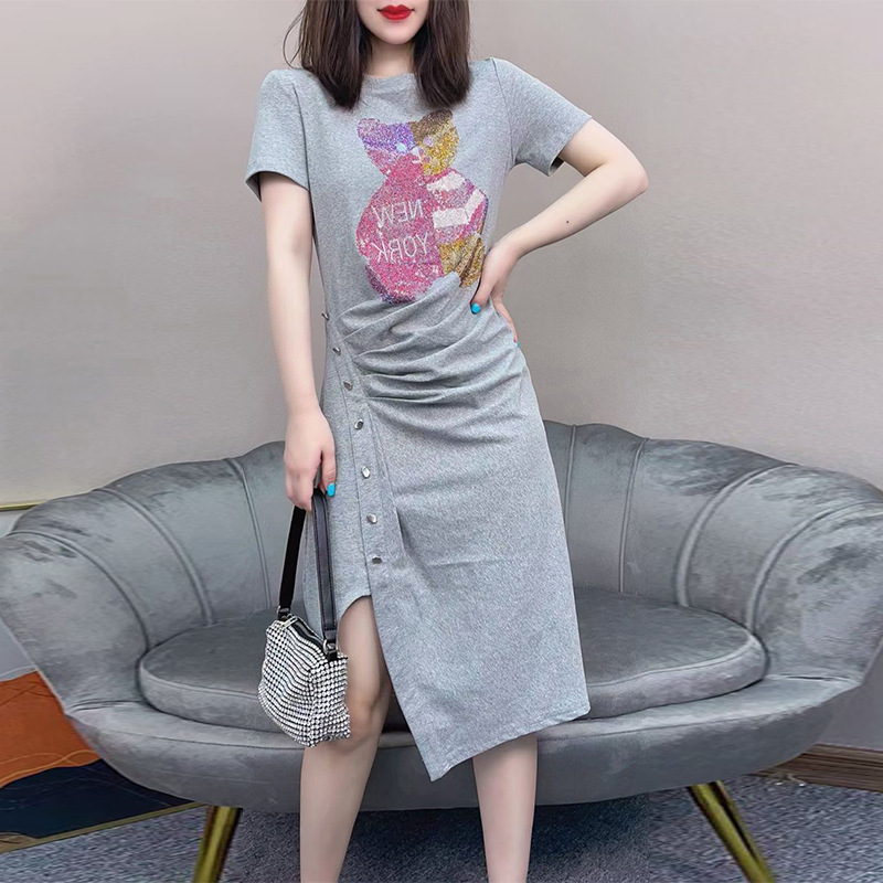 AL64 # 약간의 뚱뚱한 여자 여름 새로운 큰 크기 슬리밍 짧은 소매 티셔츠 스커트 불규칙한 분할 연령 감소 원피스