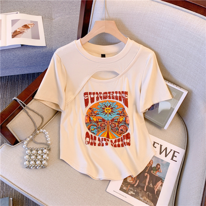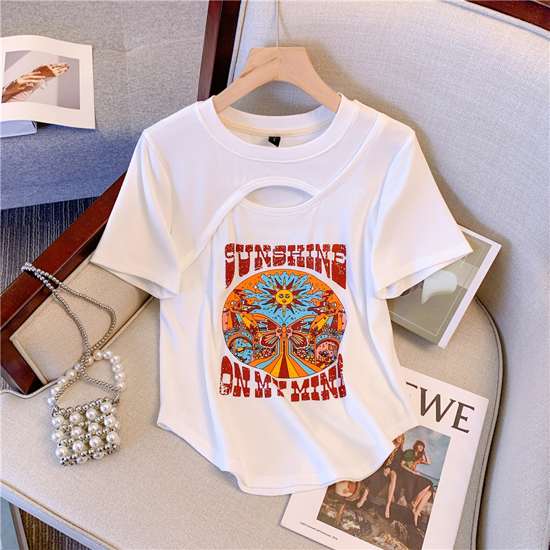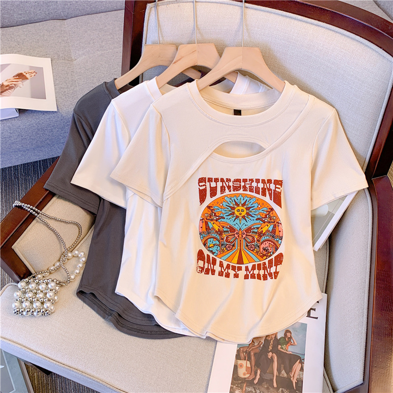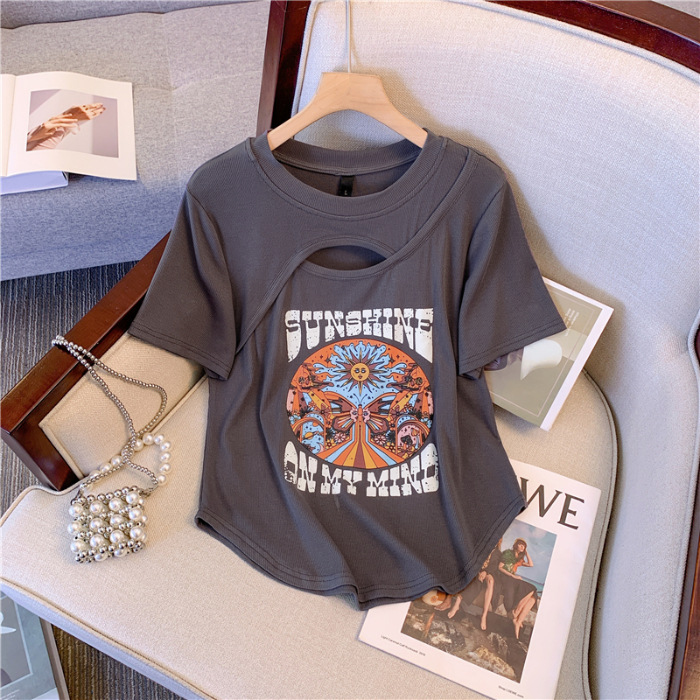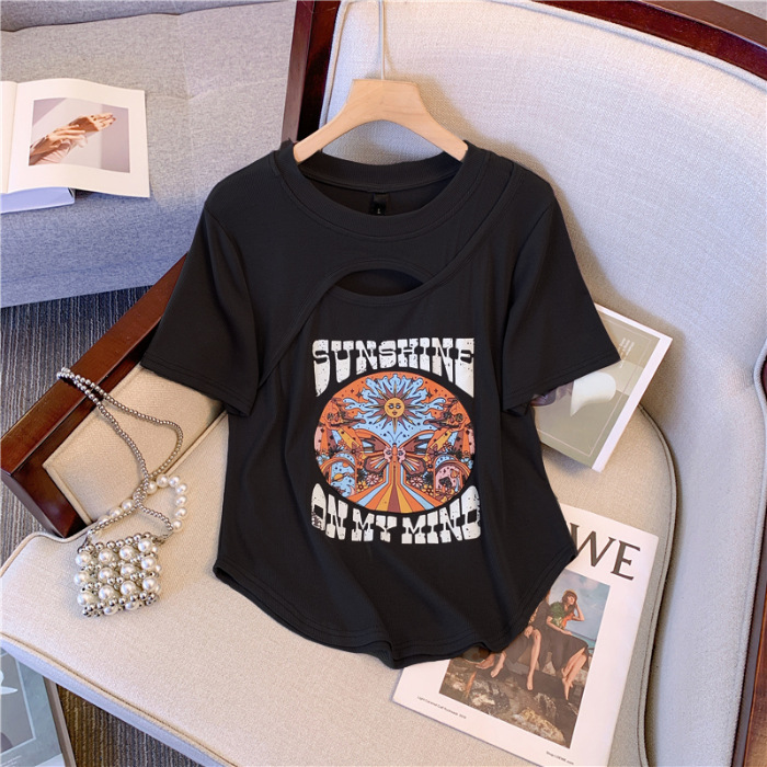 D07 # 대형 여성 2024 여름 새로운 미국 슬림 웨스턴 스타일 최고 지방 mm 작은 어깨 짧은 소매 티셔츠
