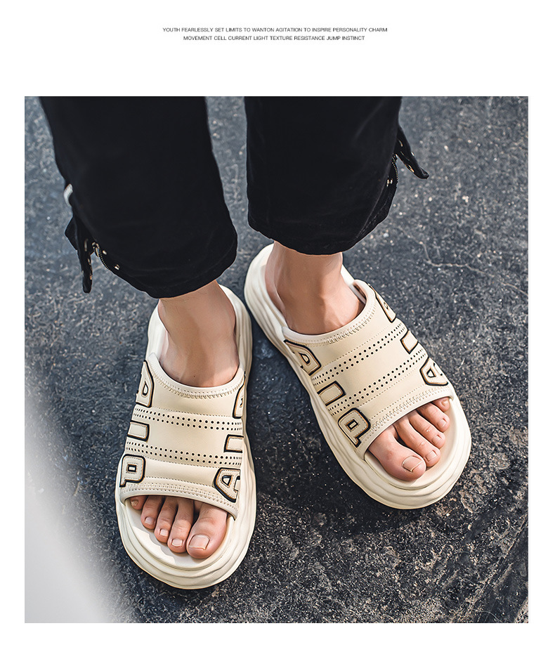 여름 새로운 소프트 솔 슬리퍼 외부 유행 브랜드 신발 간단한 스포츠 샌들 신발 슬립 온 느낌 홈 슬리퍼 남성용 통기성