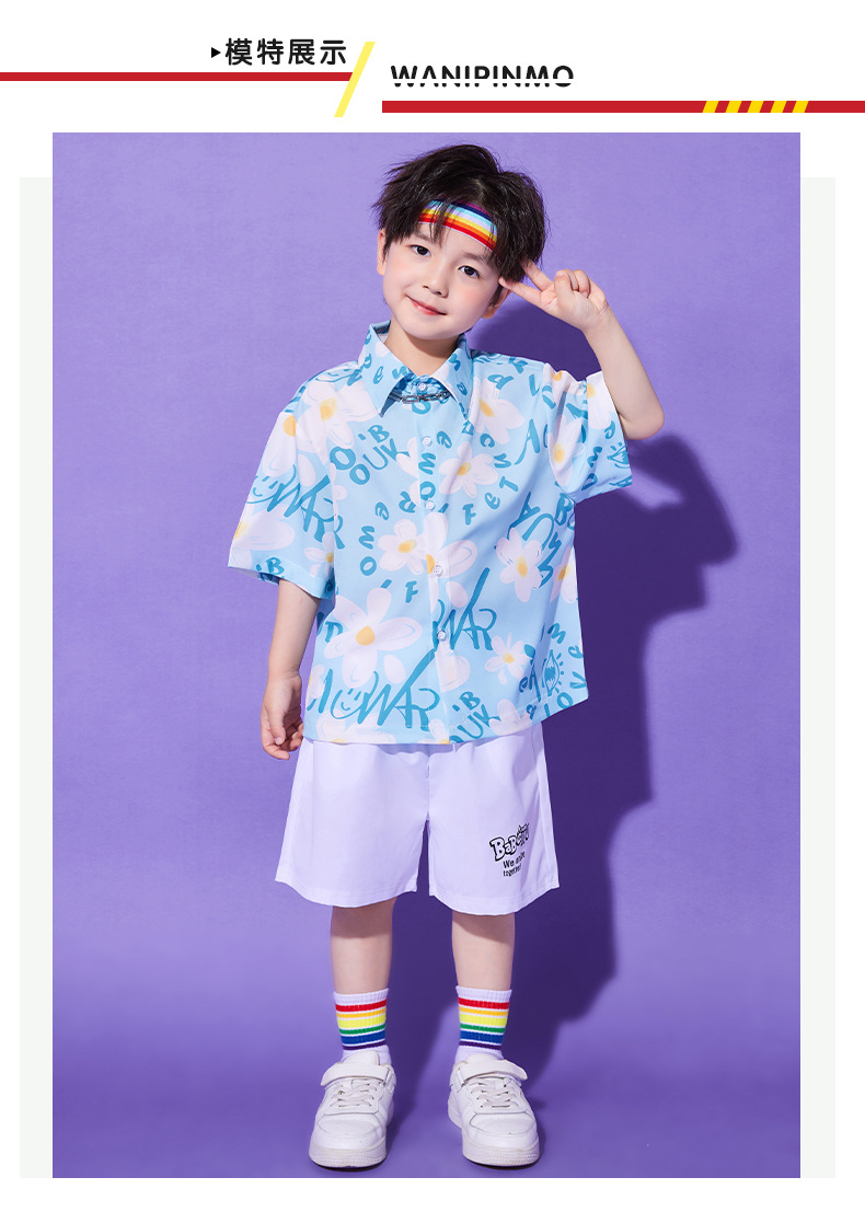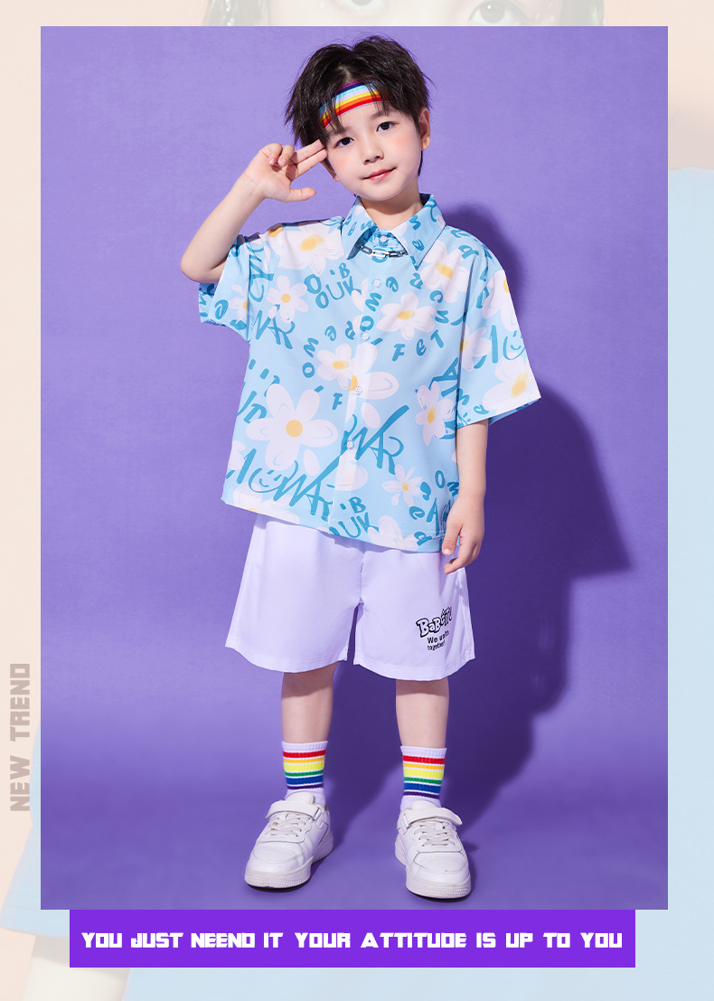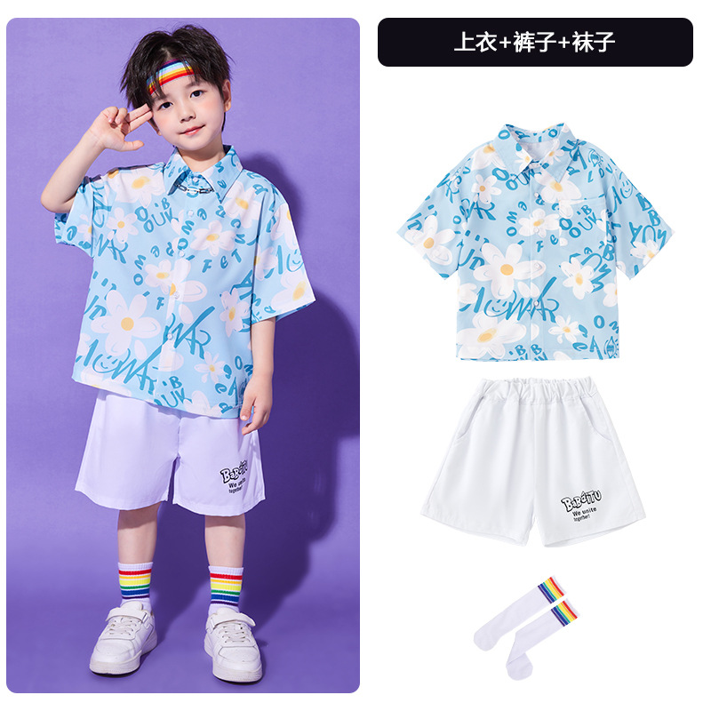• DL05 하늘 푸른 꽃 셔츠 D02 흰색 검은 반바지 컬러 스트립 튜브 양말