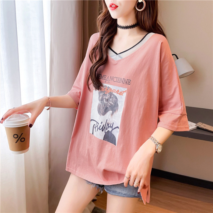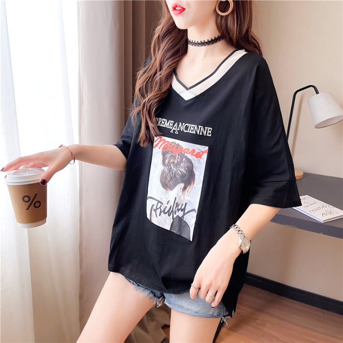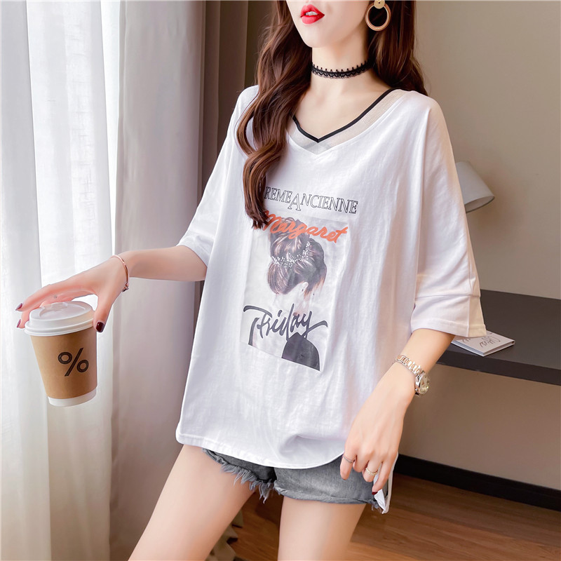 AL56 # 여름 새로운 대형 여성용 케어 V-Neck 짧은 소매 티셔츠 뚱뚱한 MM 느슨한 배꼽 커버 조커 탑스토어 가기