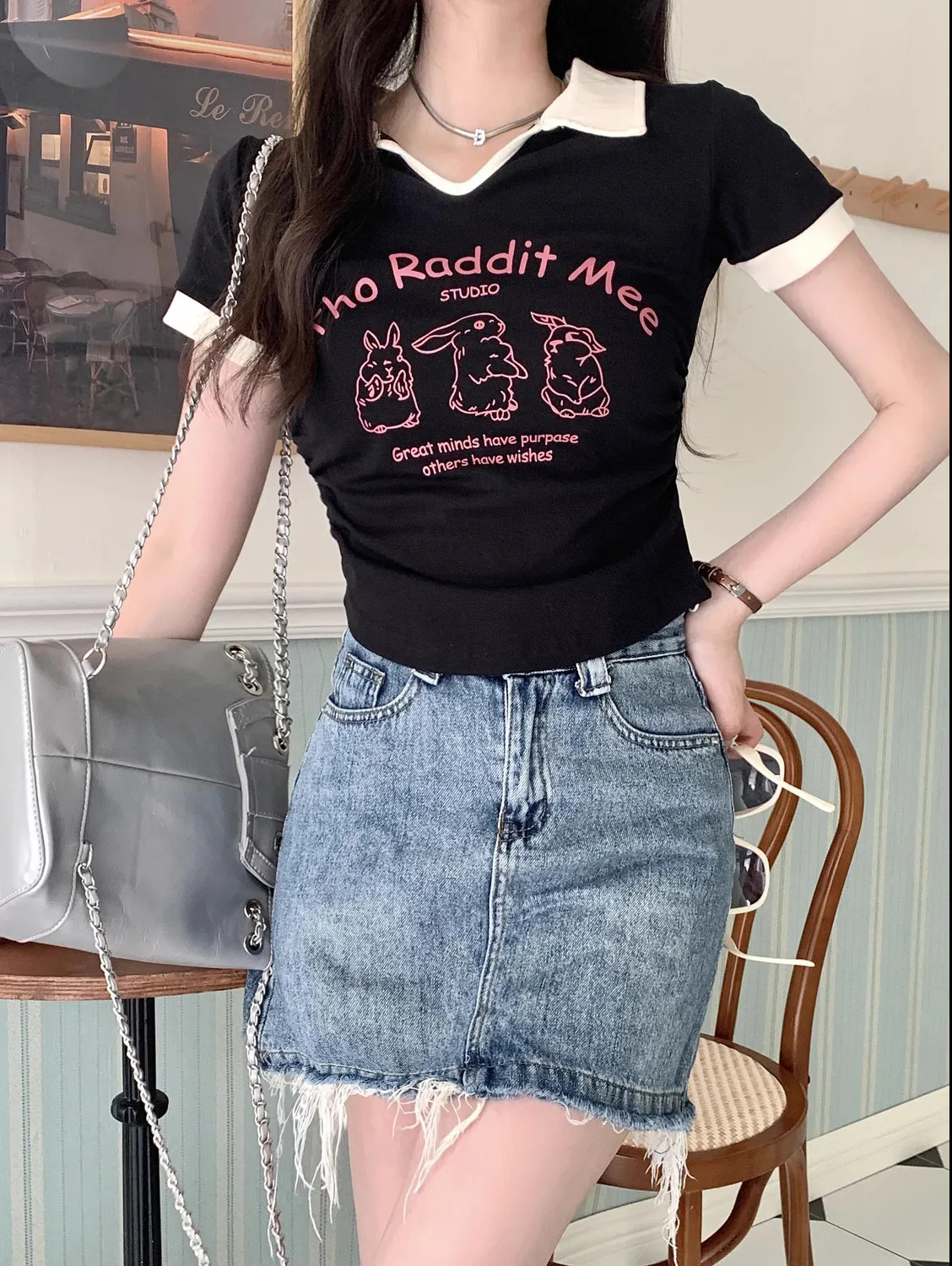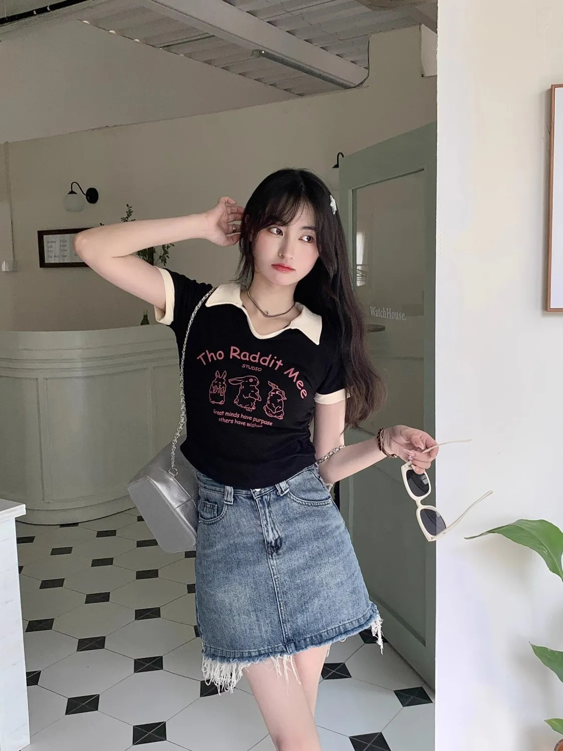 폴로 칼라 티셔츠 여성용 여름 간단한 귀여운 토끼베이스 셔츠 슬림핏 올매치 디자인 핫 걸 쇼트 탑
