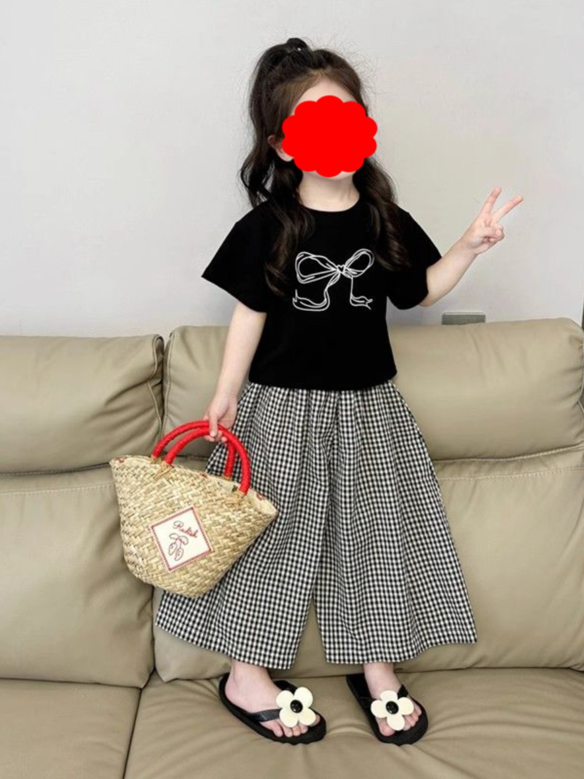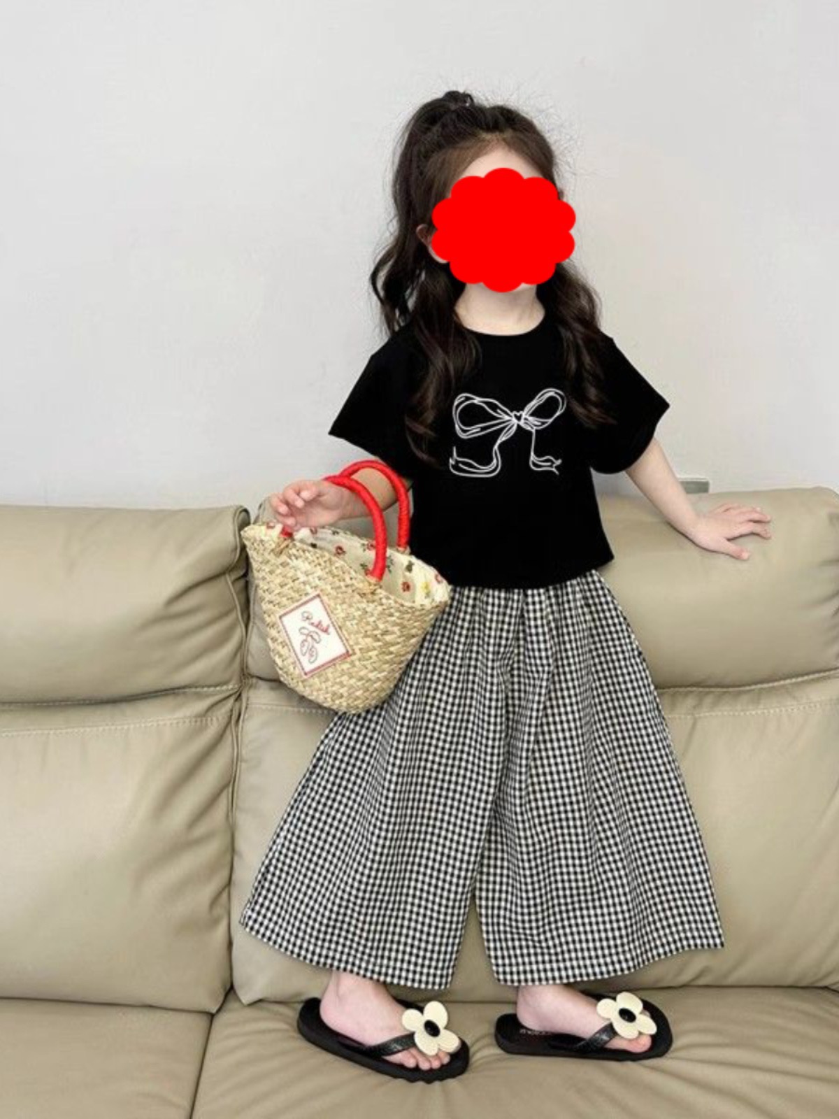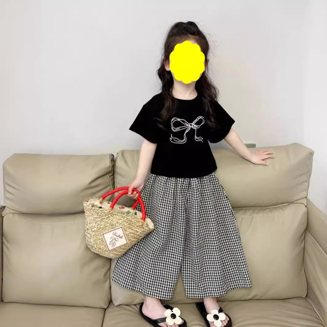 한국 스타일 아동복 2024 여름 새로운 도착 블랙 활 반팔 티셔츠 트렌디 블랙 및 화이트 격자 와이드 다리 바지스토어 가기